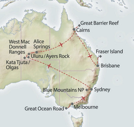 Der australische Kontinent fasziniert mit spektakulären Landschaftsformen, seiner einzigartigen Tierwelt und uralten Eingeborenen-Kultur sowie mit modernen Städten. Unsere umfassende Rundreise vereint die Metropolen Adelaide, Melbourne und Sydney mit der malerischen Fleurieu-Halbinsel, den zentral-australischen Outback-Ikonen und dem tropischen Flair der Queenslandküste mit dem Weltwunder Great Barrier Reef, der größten Sandinsel der Welt, dem Tierparadies Kangaroo Island über Brisbane zum tropischen Cairns. Abgerundet wird die intensive Erlebnisreise mit unserem erstklassigen Reisekomfort und den Leckereien der australischen Küche. Die Reise ist ideal für Erstbesucher, begeistert jedoch auch Wiederholer.