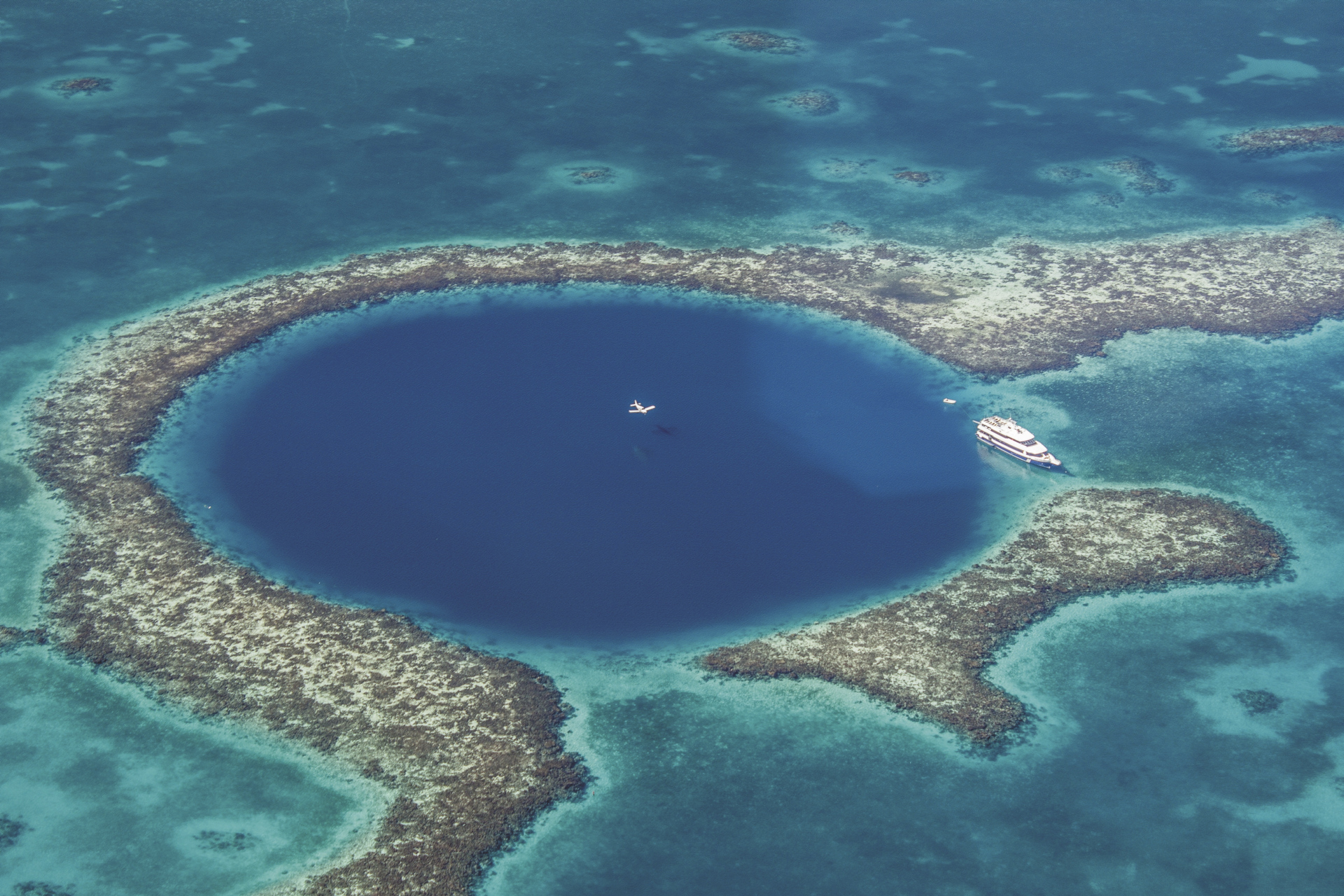 Erleben Sie das Great Blue Hole aus der Vogelperspektive! Im Zentrum des Belize Barrier Riffs gelegen, gehört es nicht nur zu den 10 besten Tauchspots unserer Erde, sondern beeindruckt vor allem aus der Luft - nur so lässt sich seine Größe erkennen, die Mystik des 125 m tiefen, dunkelblauen Lochs bestaunen, inmitten der satttürkisfarbenen Umgebung des Korallenriffs. Nicht umsonst gehört das Korallenriff und damit das Great Blue Hole zum UNESCO-Weltnaturerbe.