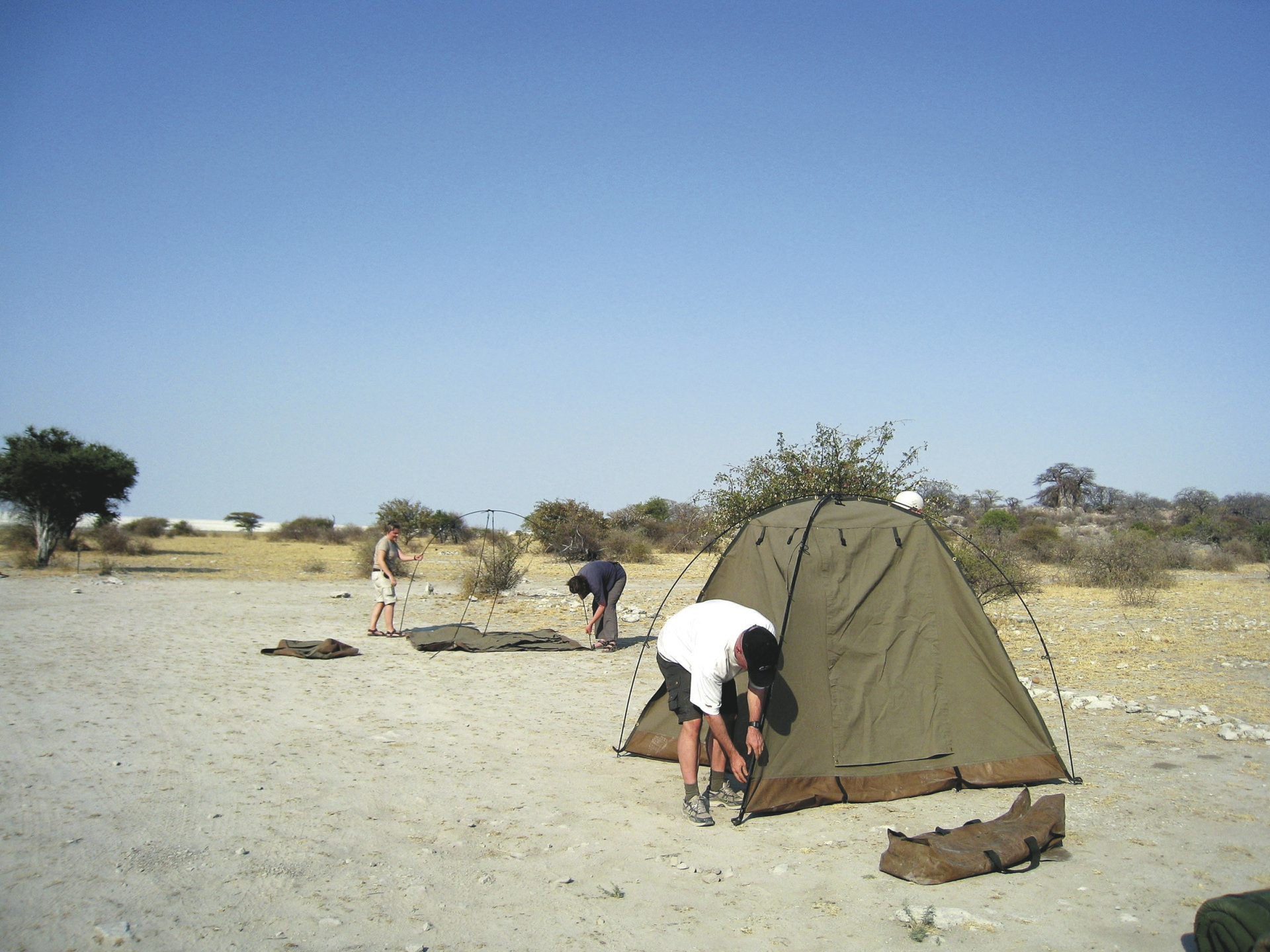 Camping-Ausrüstung: Leicht aufzustellende, insektensichere Kuppelzelte (Grundfläche 2,2 x 2,2 m, Höhe ca. 1,8 m, ca. 5 cm dicke Matratzen); Campingstühle mit Lehne; Tische; Buschküche; Geschirr; Besteck. Wo immer möglich werden unterwegs frische Lebensmittel eingekauft.