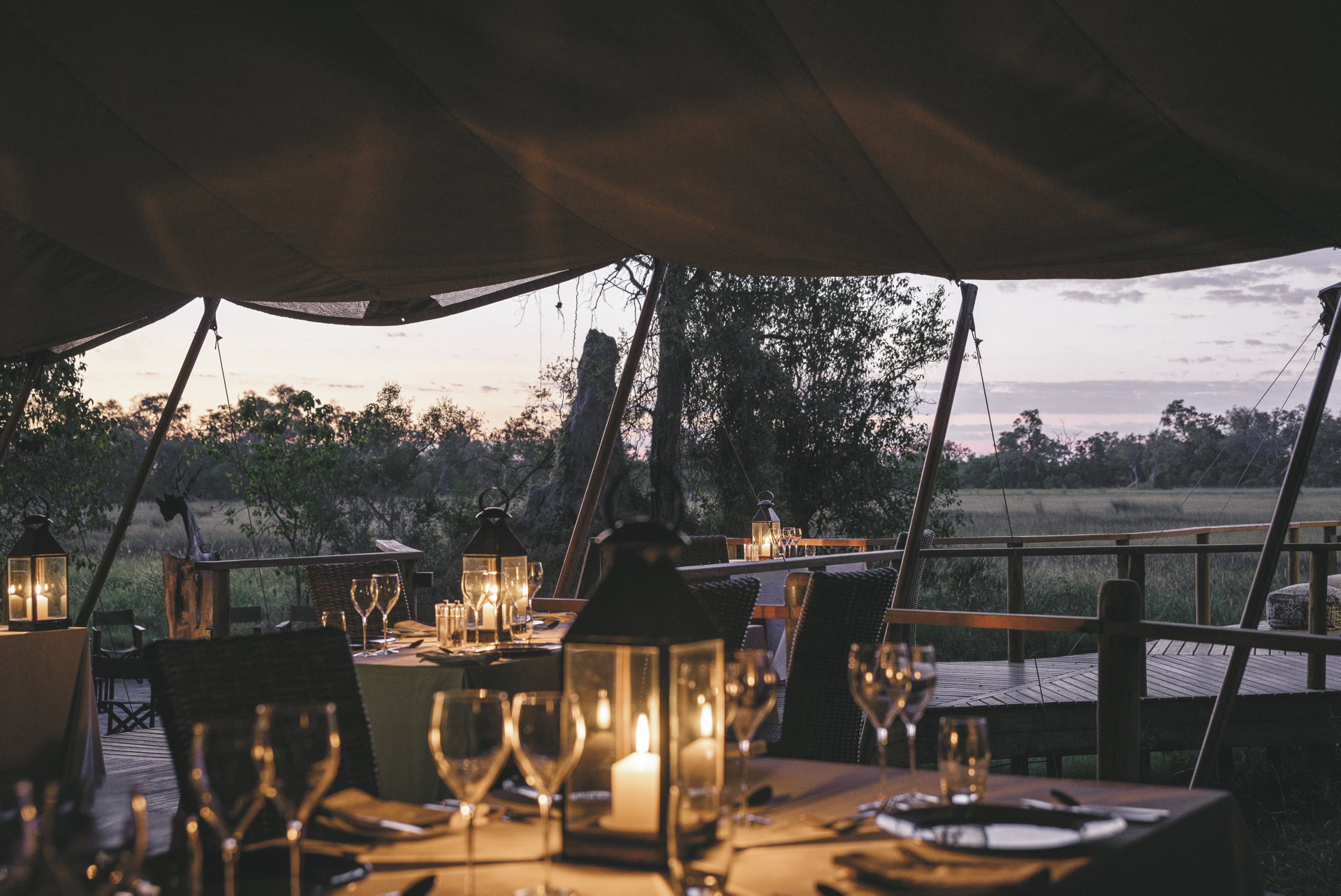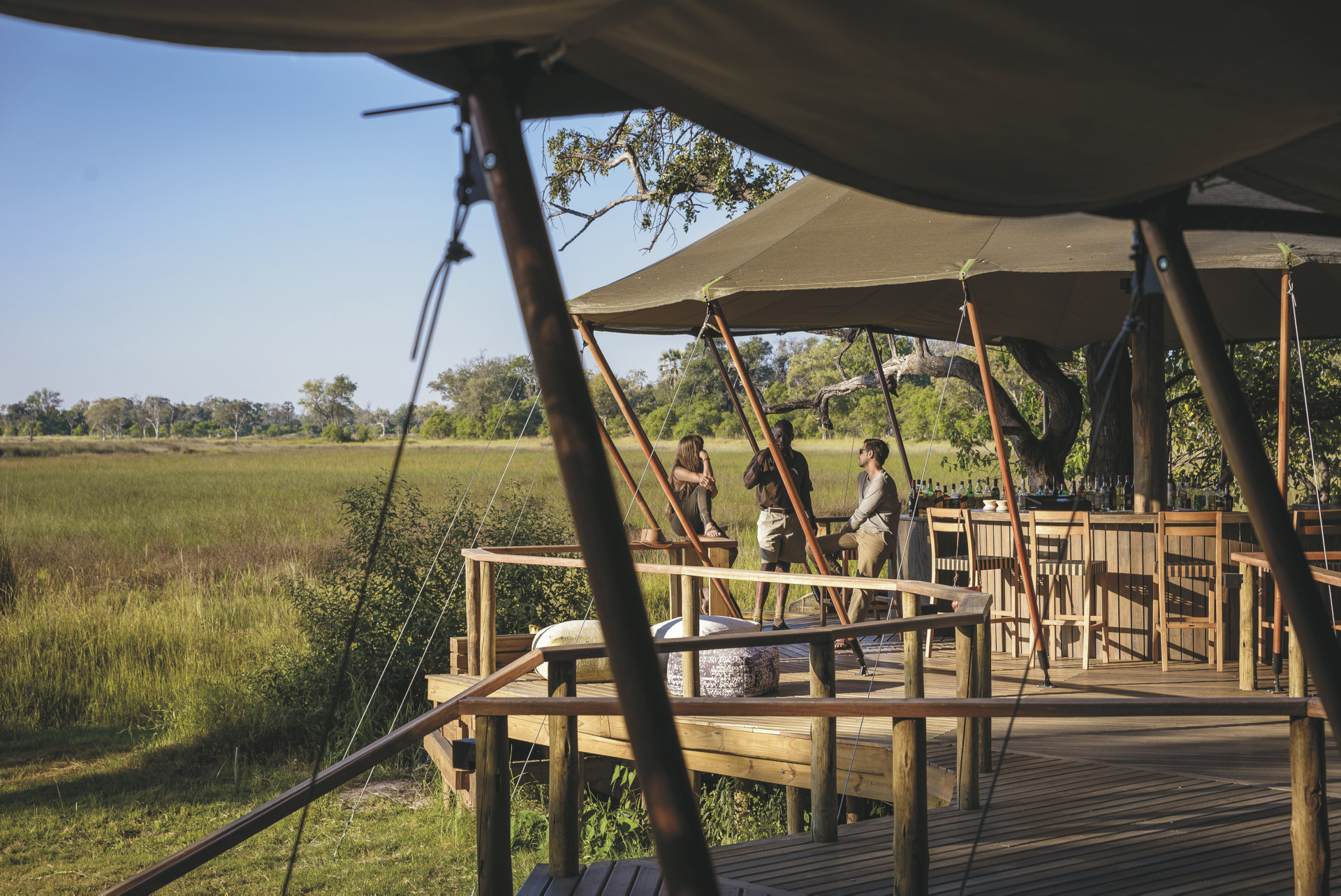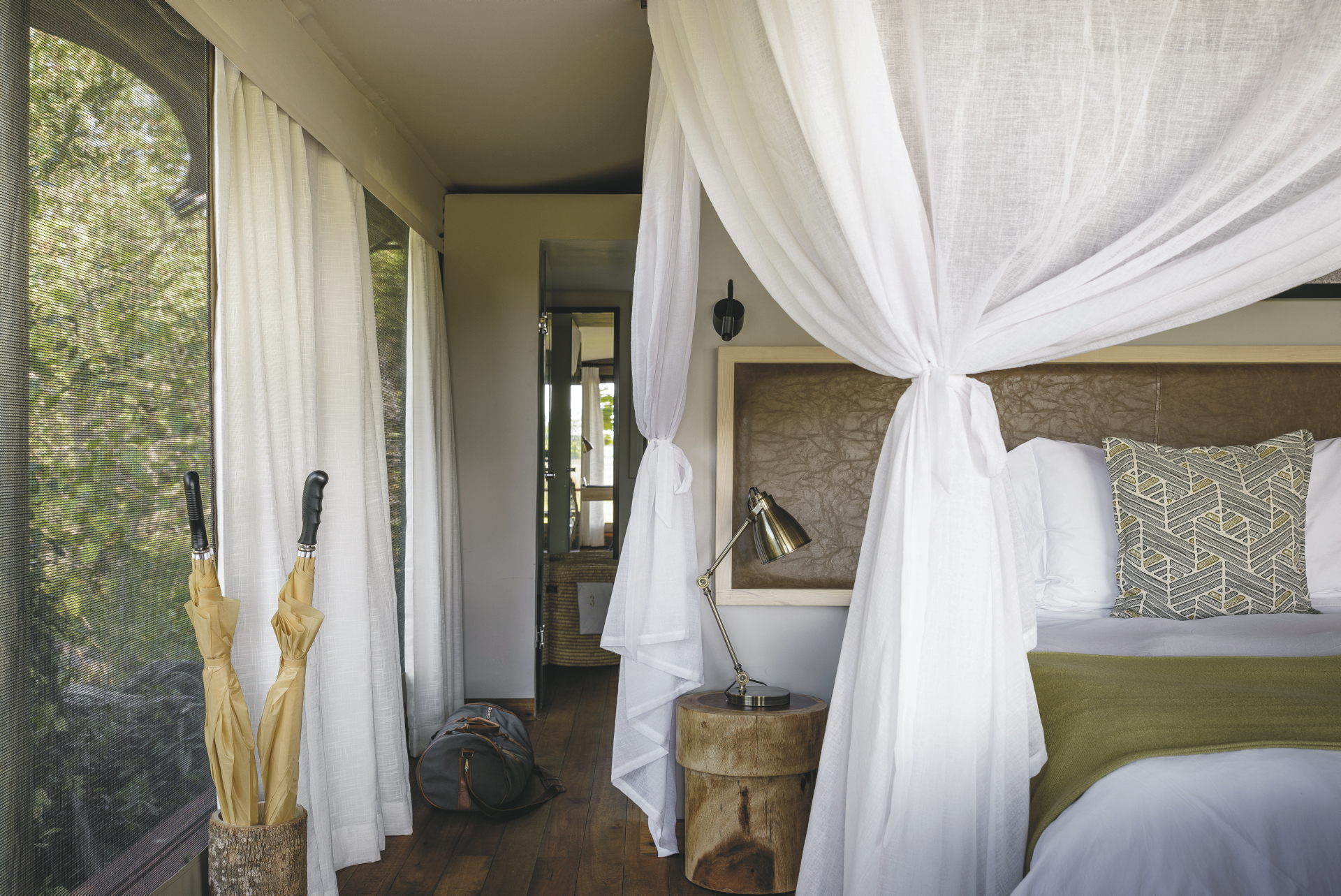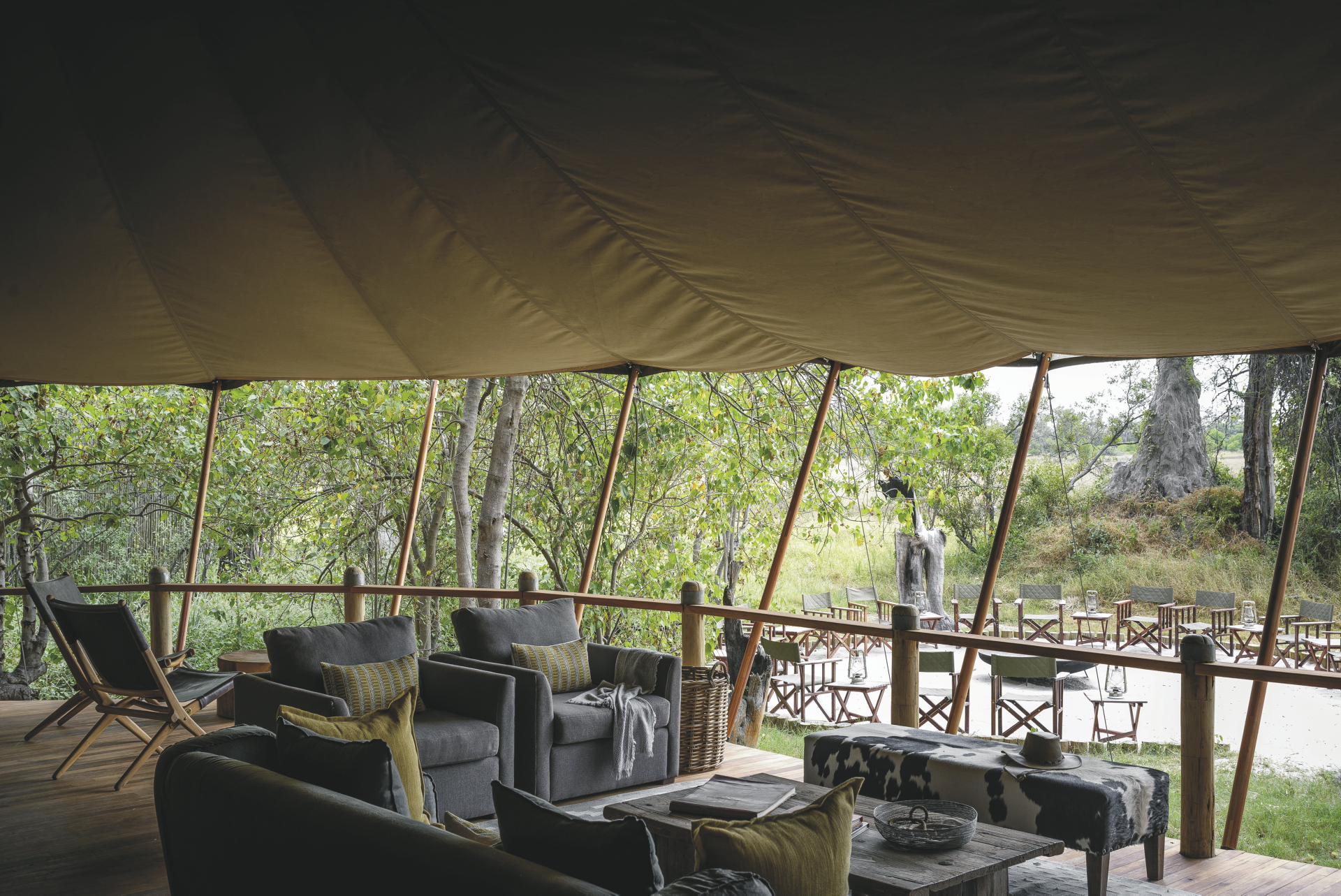 Zu den Annehmlichkeiten der 10 sehr großen, komfortablen und im traditionellen Stil eingerichtete Safarizelte gehören eine Terrasse mit Blick über die Überschwemmungsebene, ein Deckenventilator, ein Bett mit Moskitonetz und ein Badezimmer mit WC und Innendusche.