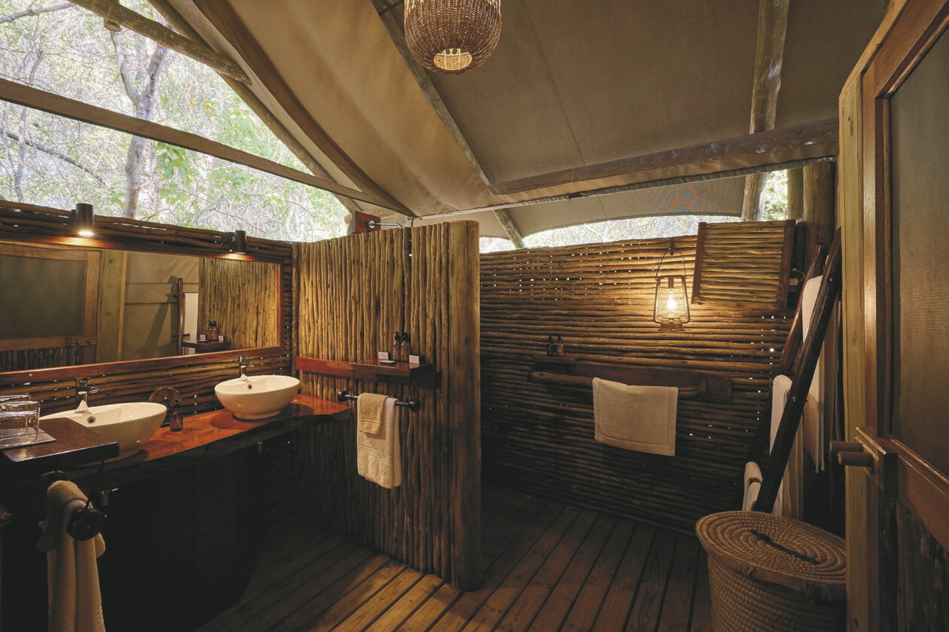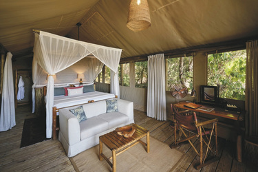 Zwölf große, luxuriöse Zelte stehen auf hölzernen Plattformen, davon ein Familienzelt. Alle haben eine eigene Terrasse und ein Badezimmer mit Waschbecken, Dusche und Spültoilette. Die insektengeschützten Zelte sind komfortabel mit großen Betten, Nachttischen, Kommode, Safe, Schminktisch mit Spiegel und Ablagemöglichkeiten eingerichtet. Eine Steckdose für einen Fön und zum Aufladen von Batterien ist vorhanden, ebenso ein Ventilator.