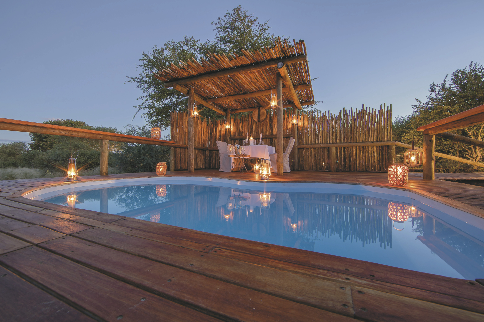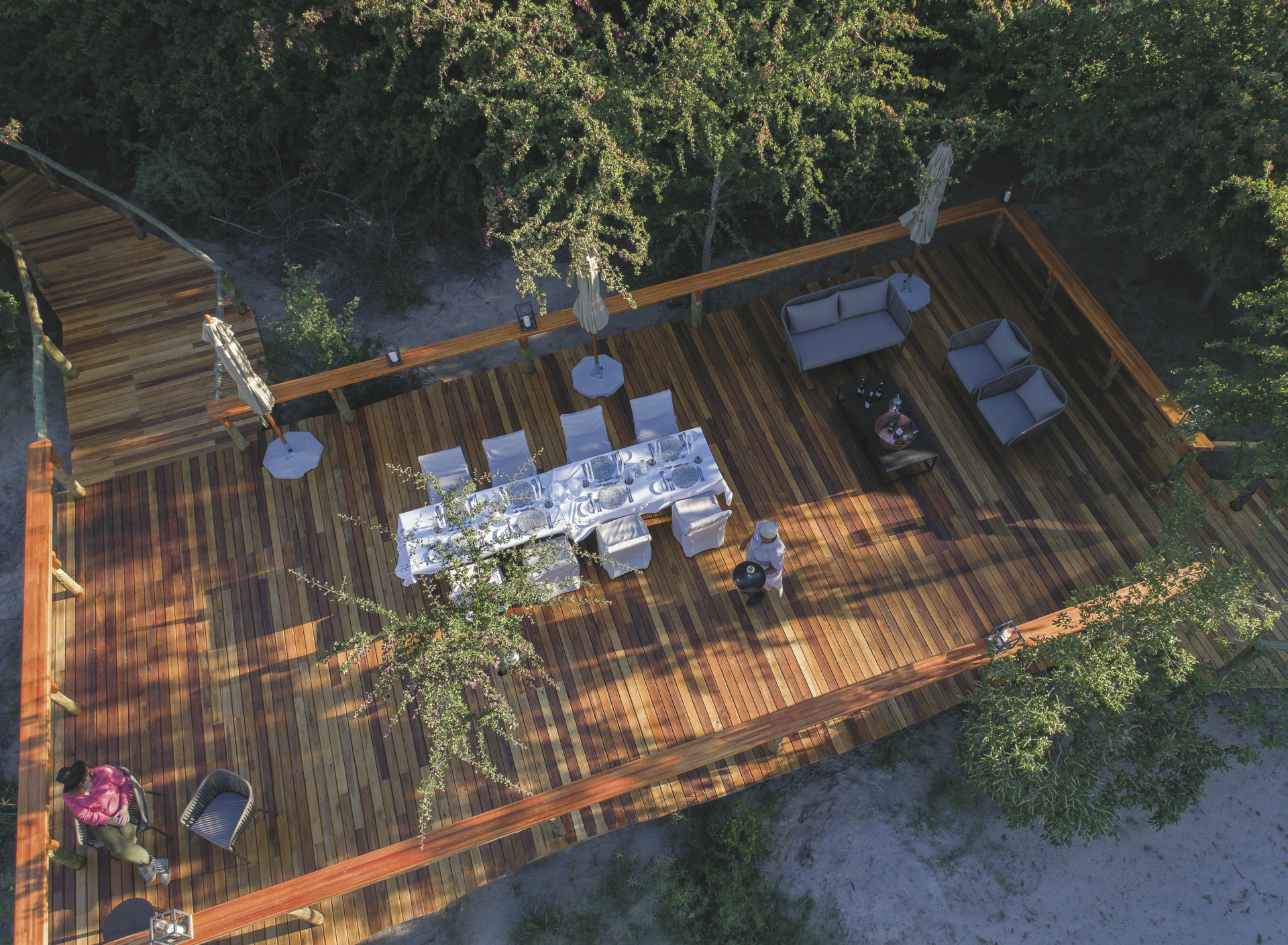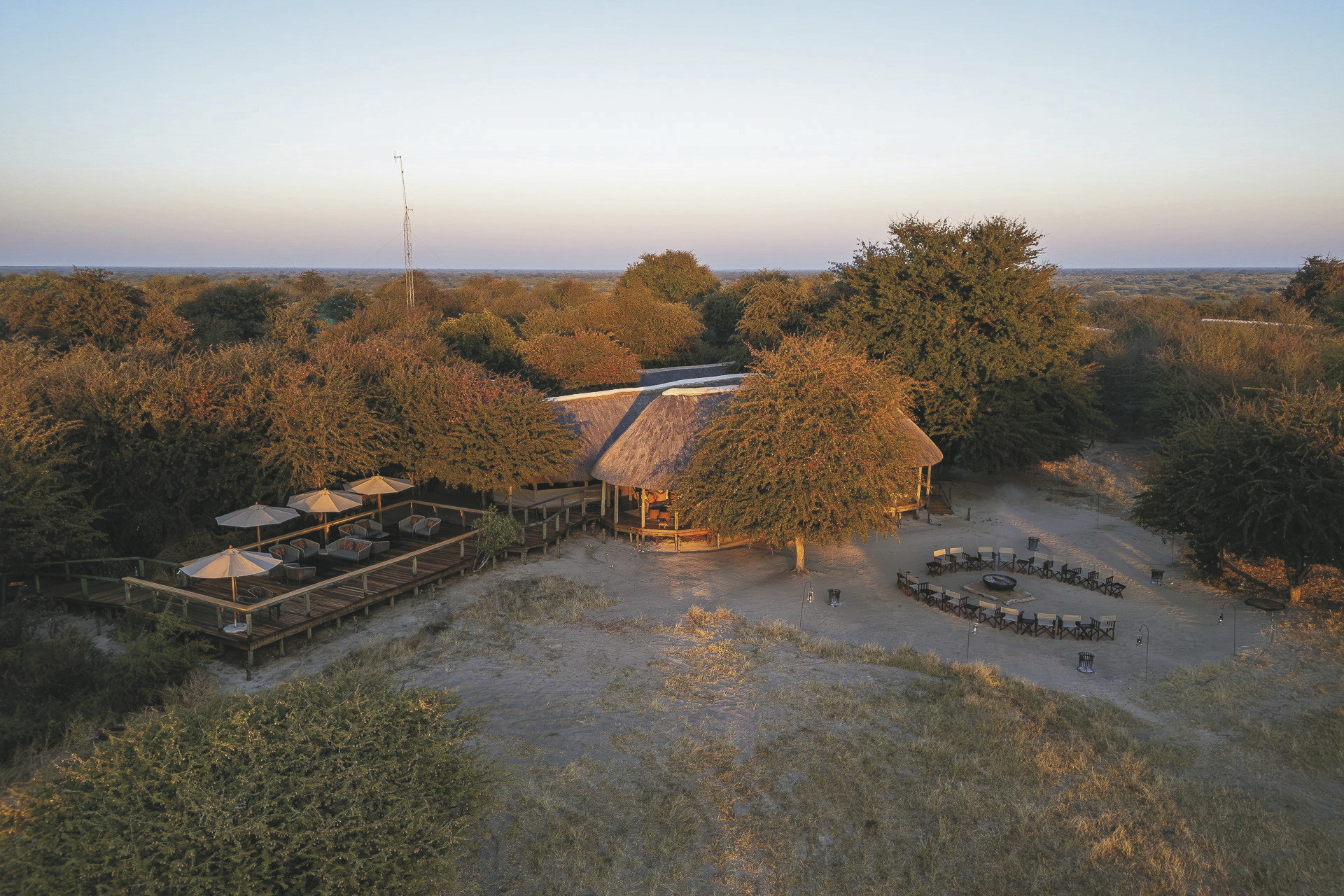 Der Hauptbereich von Dinaka erstreckt sich über erhöhte Plattformen und umfasst großzügige Sitz- und Essbereiche, eine gemütliche Bar sowie einen einladenden Pool – mit einem weiten Blick auf das nahegelegene Wasserloch, das regelmäßig Wildtiere anzieht. Im gesamten Reservat sorgen strategisch platzierte Verstecke und unterirdische Bunker an verschiedenen Wasserstellen für außergewöhnliche Möglichkeiten zur Wild- und Vogelbeobachtung – perfekt auch für Fotografen. Ein besonderes Highlight ist das Sleep Out Deck, das Gästen einen unvergesslichen Panoramablick und die einmalige Gelegenheit bietet, unter dem funkelnden afrikanischen Sternenhimmel zu übernachten.Eingeschlossene Aktivitäten: Wanderungen mit San-Buschmännern, Pirschfahrten.