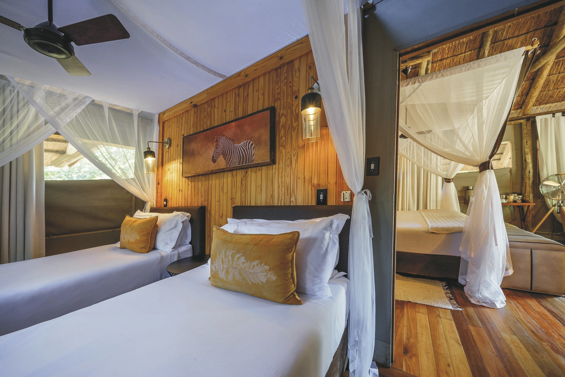 Die 7 geräumigen Zelte verfügen jeweils über große Betten mit Moskitonetzen, Standventilatoren, eine kleine Veranda sowie ein eigenes Badezimmer mit Innen- und Außendusche. Familien werden in einem Zelt mit zwei Schlafzimmern untergebracht, die sich ein geräumiges eigenes Bad teilen. Die Zelte von Dinaka stehen in großen Abständen auf Holzdecks, von denen aus man einen perfekten Blick auf ein permanentes Wasserloch hat. Alle Bereiche des Camps sind durch Holzstege miteinander verbunden.