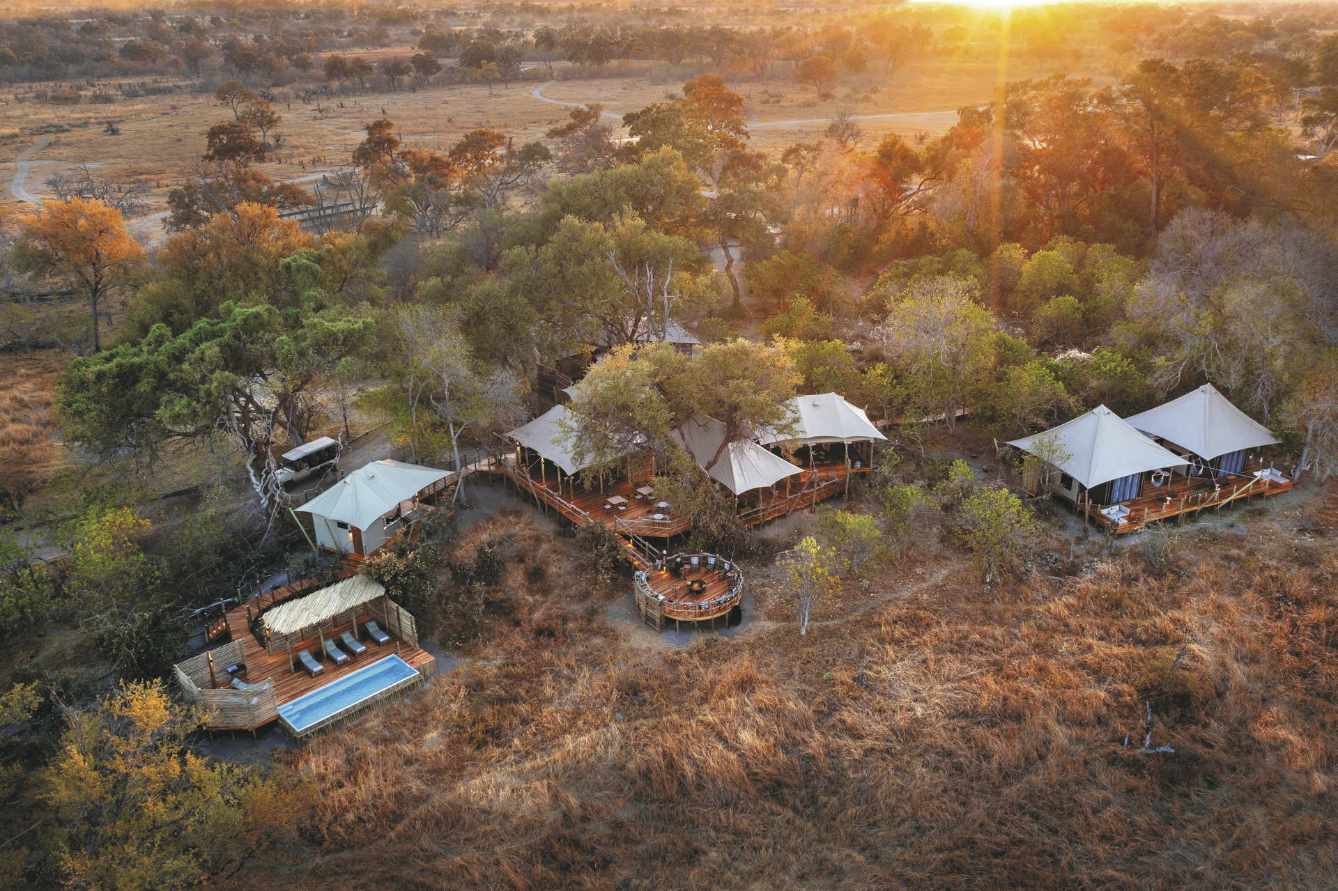 Das Herzstück des Khwai Lediba Camps lädt mit einem erfrischenden Pool, einem stilvollen Speisebereich mit offener Küche und einer charmanten Bar samt gemütlicher Lounge zum Verweilen ein. Eine stimmungsvolle Feuerstelle und die traditionelle Boma schaffen den perfekten Rahmen für unvergessliche Abende unter dem funkelnden afrikanischen Sternenhimmel.Eingeschlossene Aktivitäten: Pirschfahrten (am Morgen, Nachmittag und bei Nacht), Buschwanderungen und Mokorofahrten (abhängig vom Wasserstand) sowie der Besuch einer nahegelegenen Vorschule.