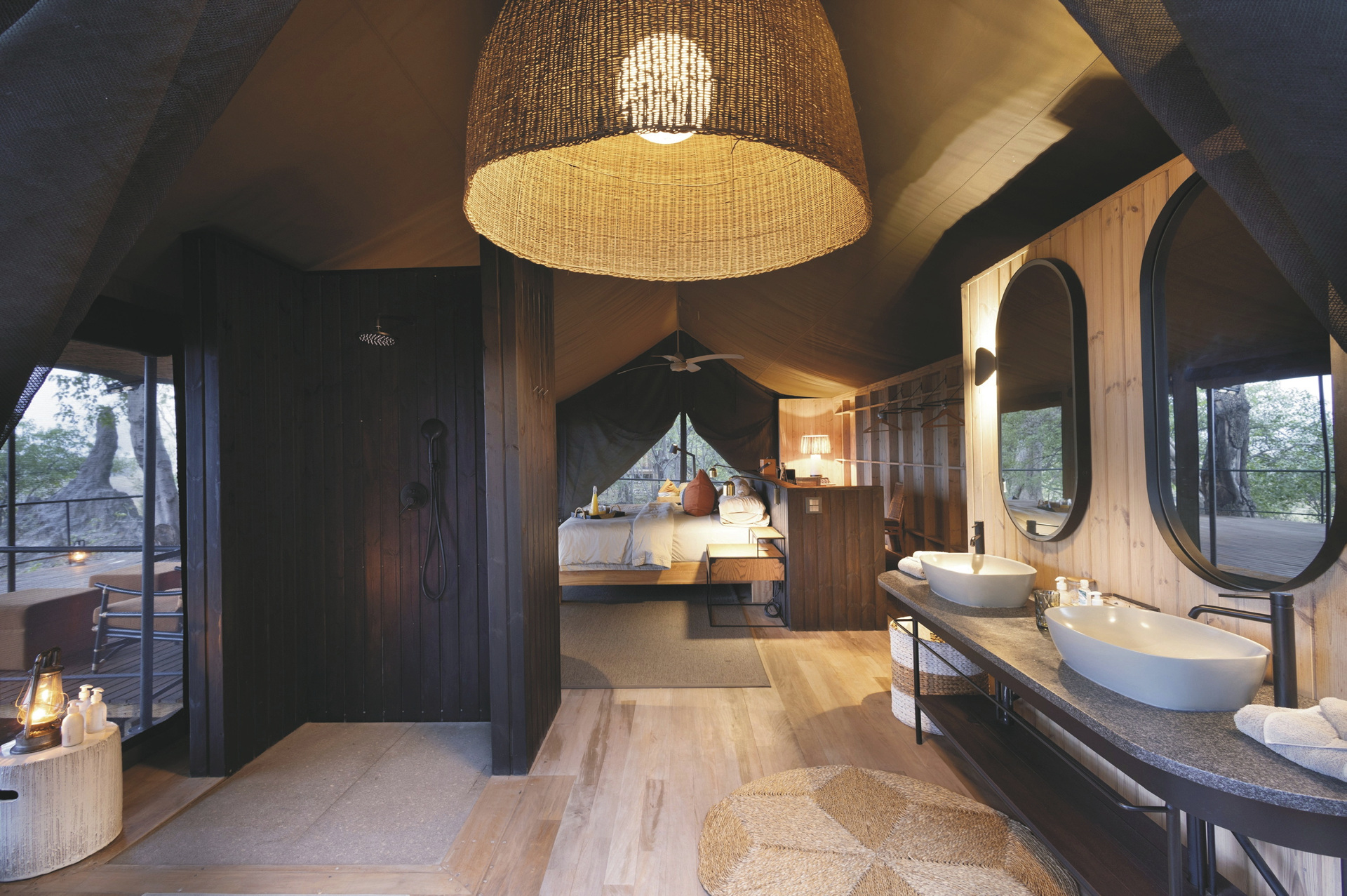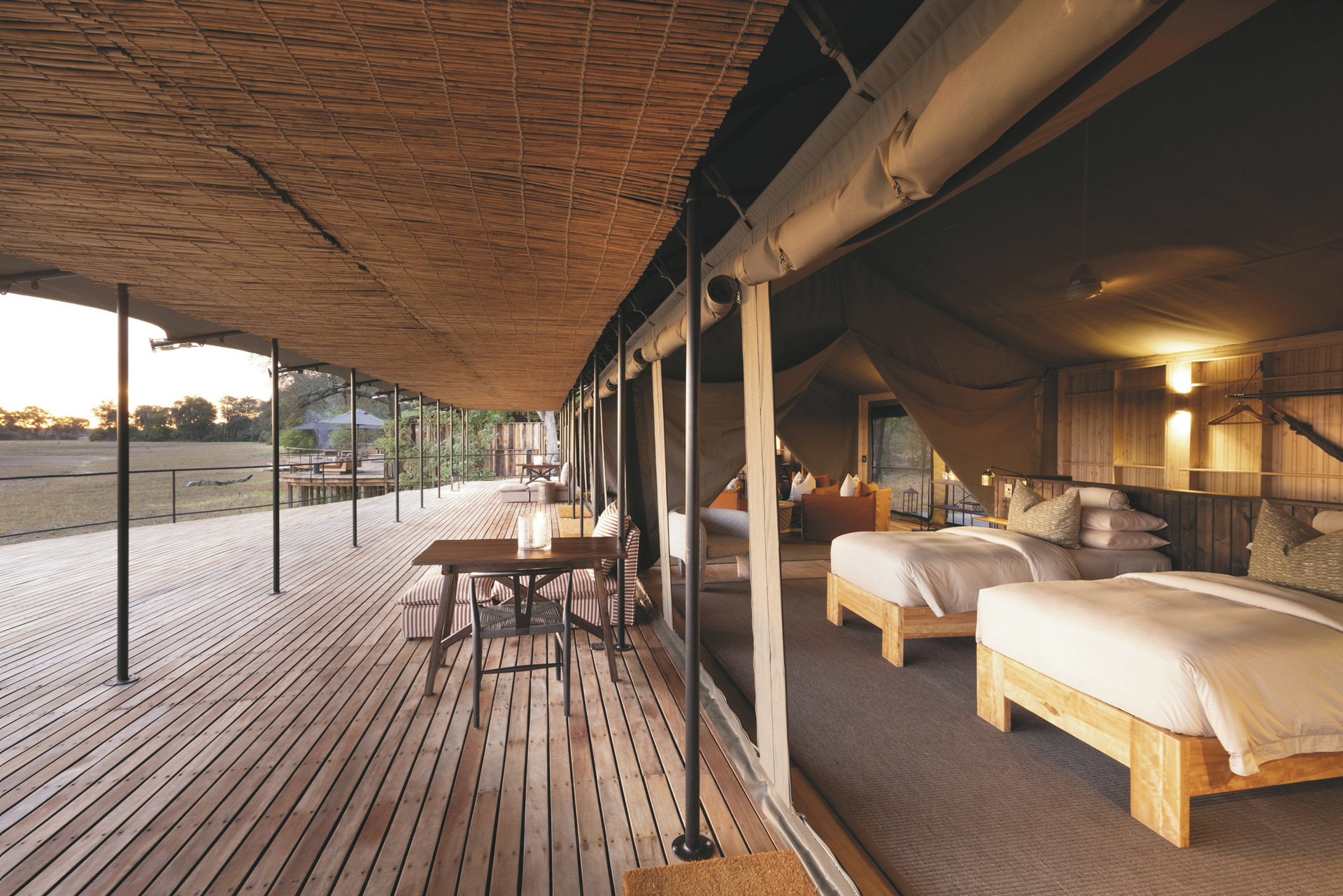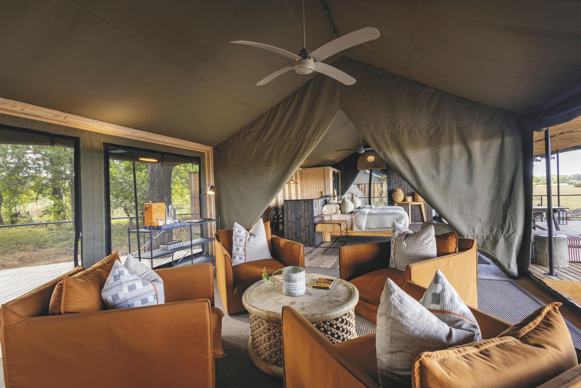 Die 8 Luxuszelte sind so konzipiert, dass sie nahtlos mit dem Ebenholzwald, in dessen Schatten das Camp liegt, zu verschmelzen scheinen. Jedes verfügt über ein eigenes Bad mit Außenwanne und -dusche; Ventilator und eine große überdachte Terrasse mit unglaublicher Aussicht. Für Familien gibt es zwei Familienzelte mit jeweils einer gemeinsamen Lounge.