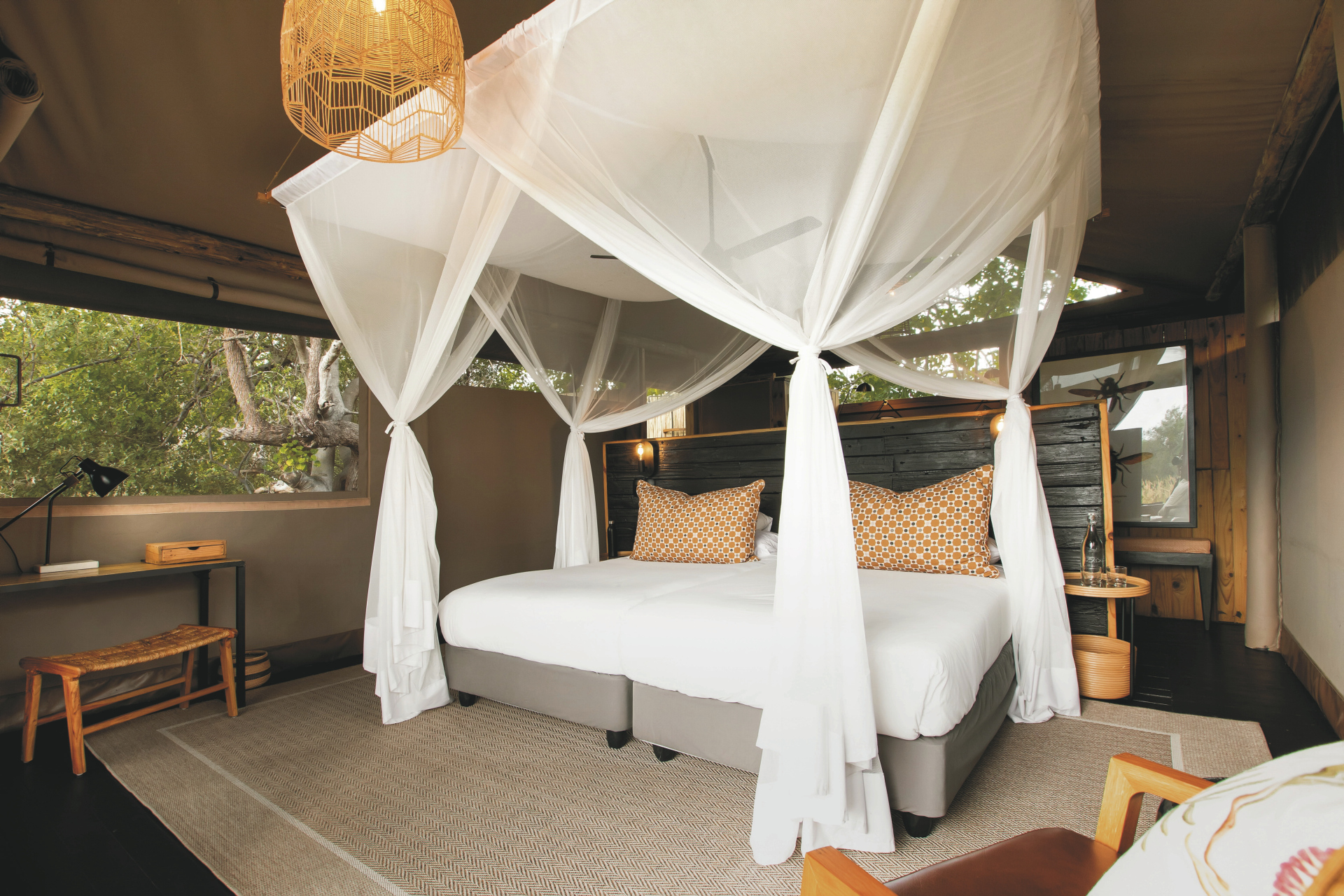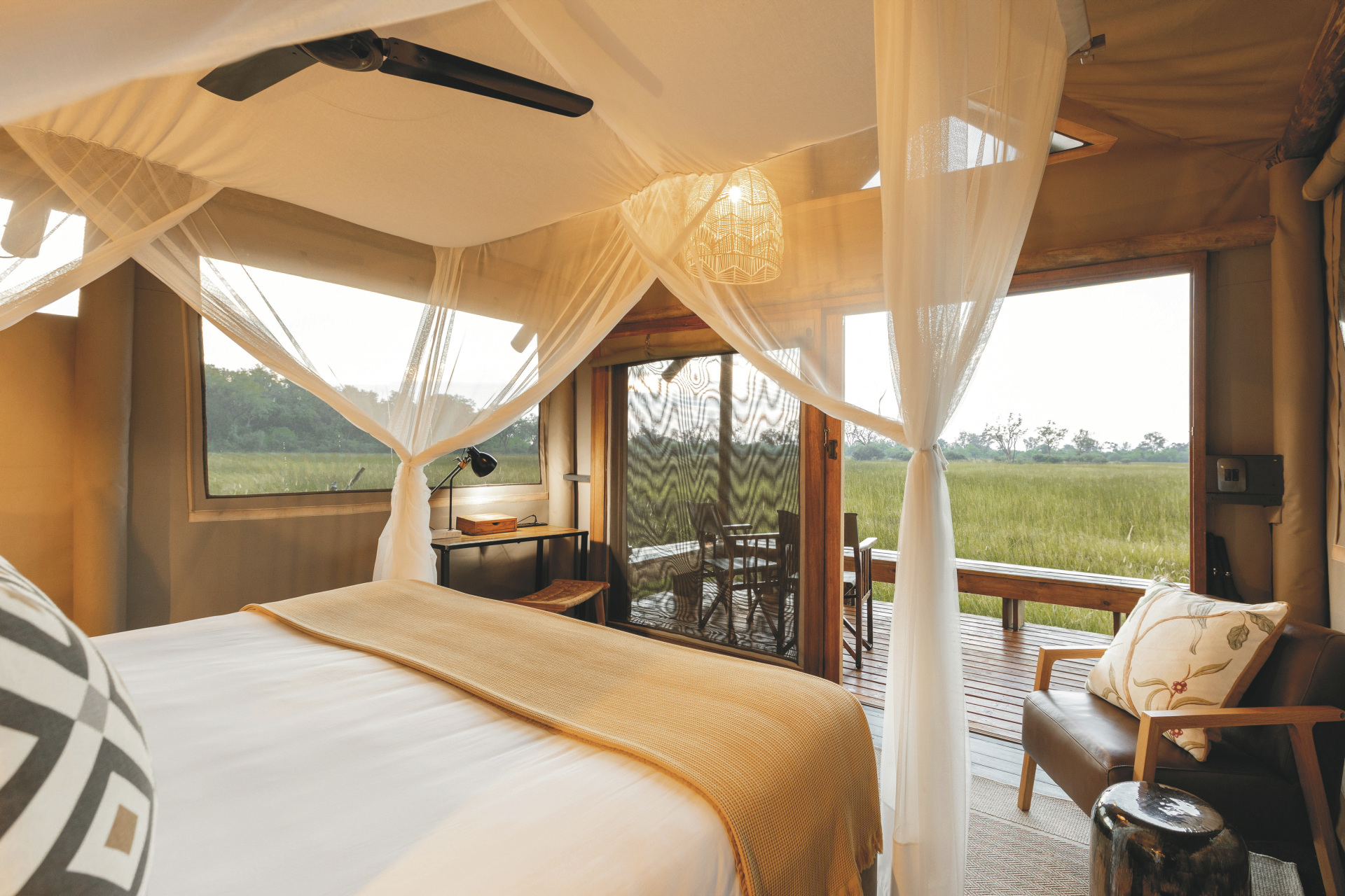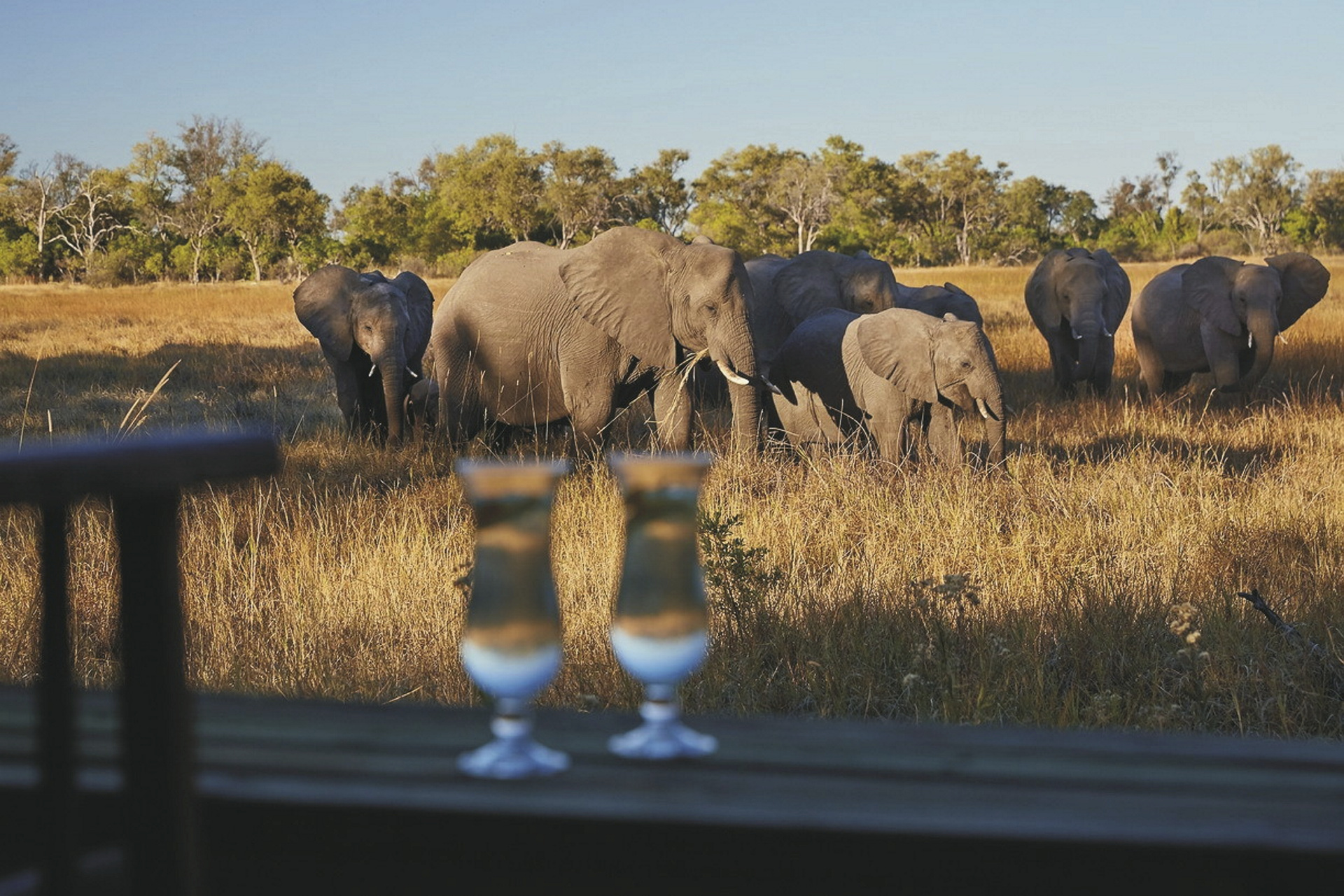 Die großzügige Außenterrasse mit einer großen Feuerstelle im Hauptbereich ist der perfekte Ort für den ersten Morgenkaffee oder einen frühen Abend-Gin-Tonic. Direkt vor einem beliebten Weideplatz für Zebras und Elefanten gelegen, ist es auch während der Siesta – oder zu jeder Tageszeit – eine fantastische Basis für Tierbeobachtungen. Ein kleiner Pool lädt zum Abkühlen ein. Als Besonderheit kann von April bis Oktober im Camp "Skybeds" übernachtet werden. Dieses besondere Erlebnis, unterm Sternenhimmel zu nächtigen, kann zusätzlich gegen einen Aufpreis gebucht werden. Die Himmelbetten verfügen ebenfalls über DU/WC.Eingeschlossene Aktivitäten: Pirschfahrten, Mokoro- und Bootsfahren (wasserstandsabhängig).