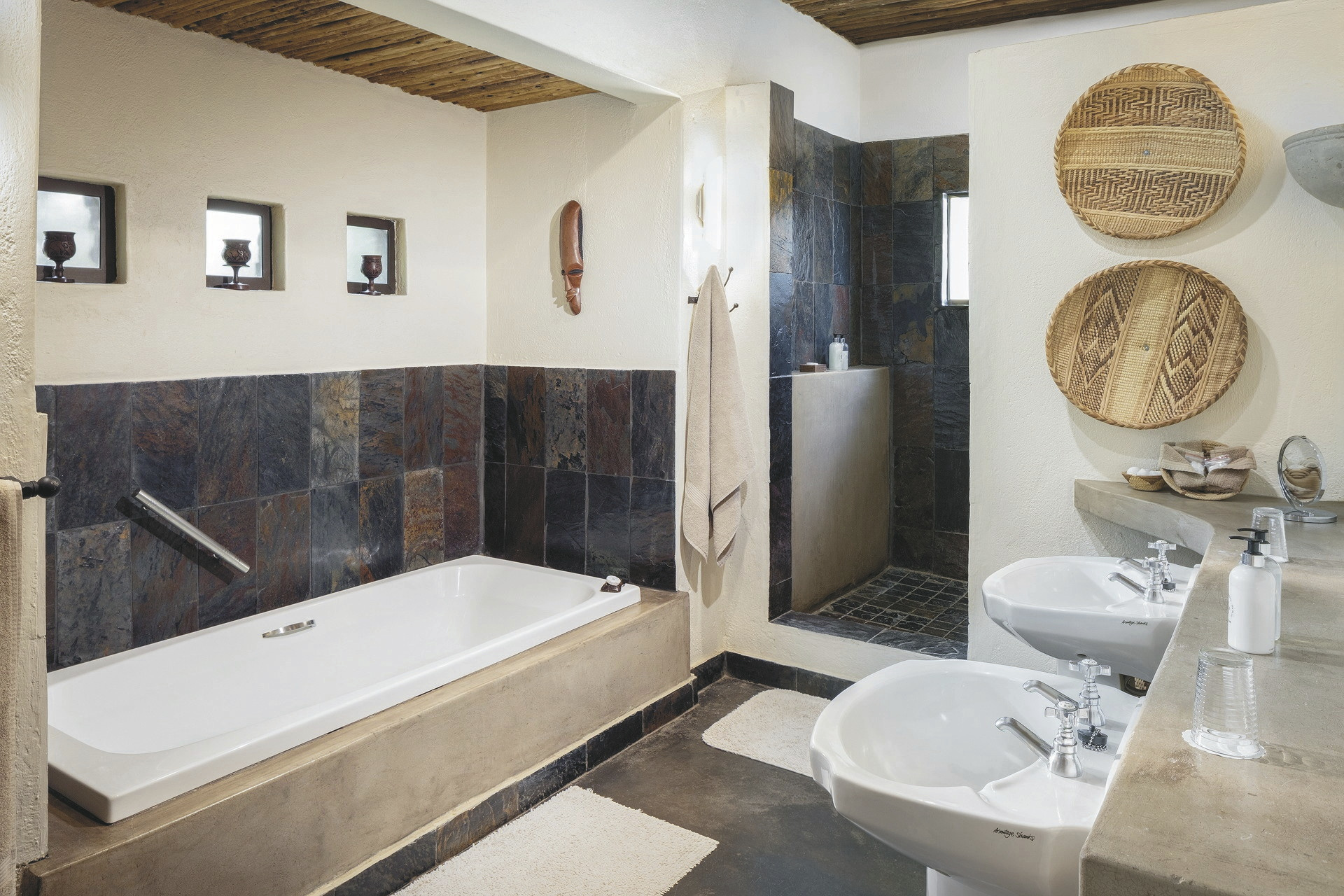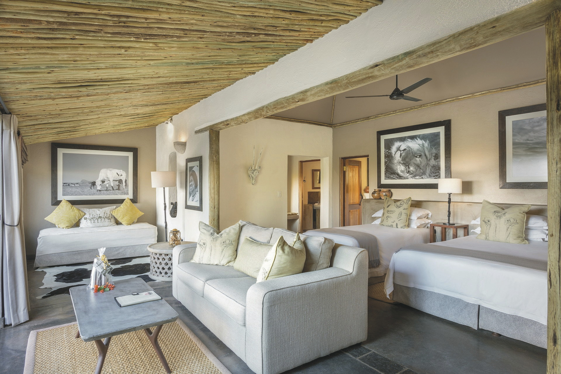 Die 14 klimatisierten Suiten der Mashatu Main Lodge sind geschmackvoll eingerichtet und verfügen über ein eigenes Badezimmer mit Badewanne und Dusche. Ein Doppelbett und ein separates Einzelbett sowie ein Sitzbereich mit einer Tagesliege bieten ausreichend Platz für Familien.