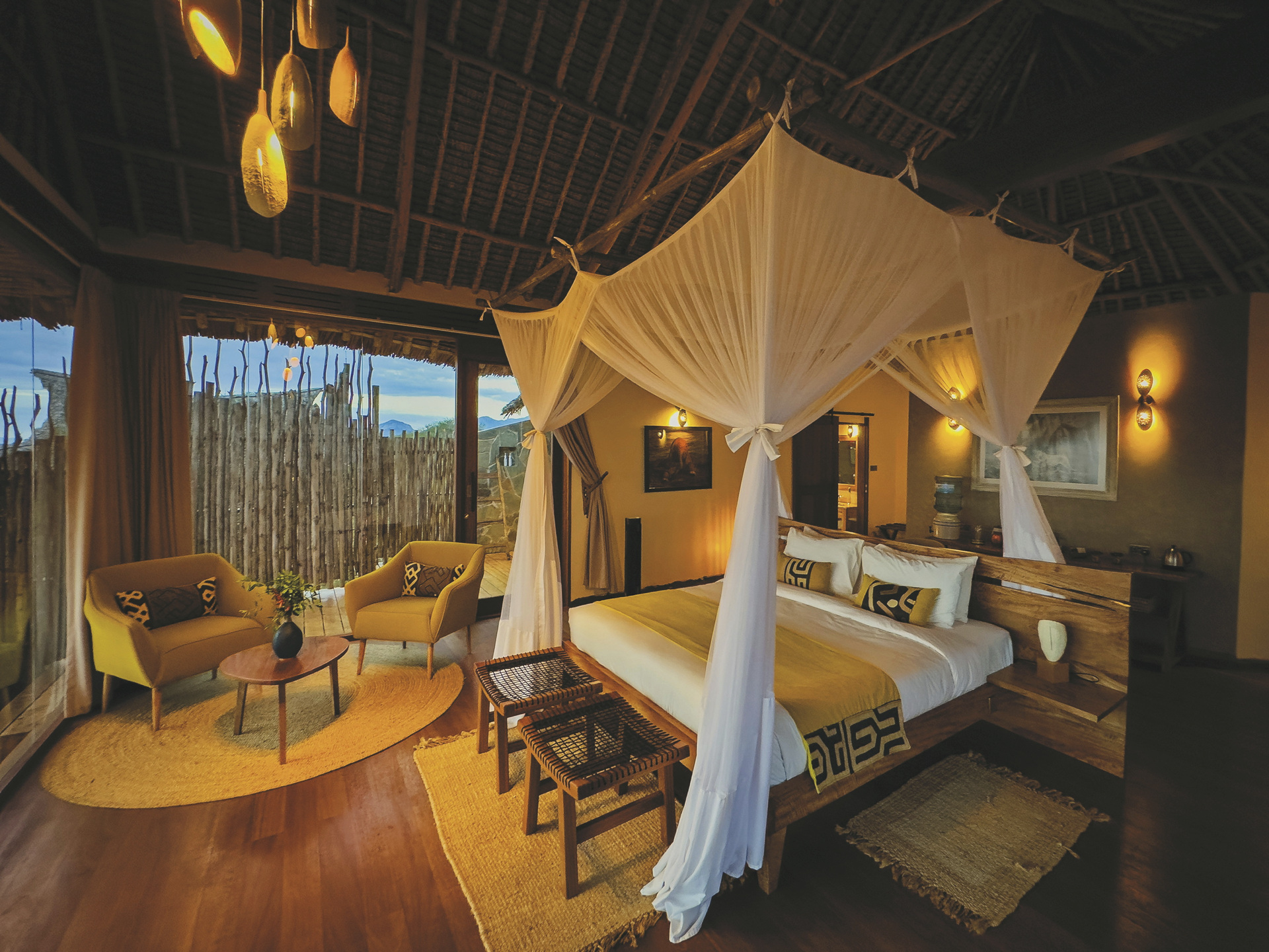 Die 12 Luxus-Suiten, davon 2 Familien-Suiten mit 2 Schlafzimmern, mit bodentiefen Fenstern bieten einen einmaligen Panorama-Blick. Sie verfügen über ein Bad mit Innen- und Außendusche, Fön, ein komfortables Bett mit Moskitonetz, Kühlschrank, Tee-/Kaffeezubereiter und eine Veranda/Balkon.
