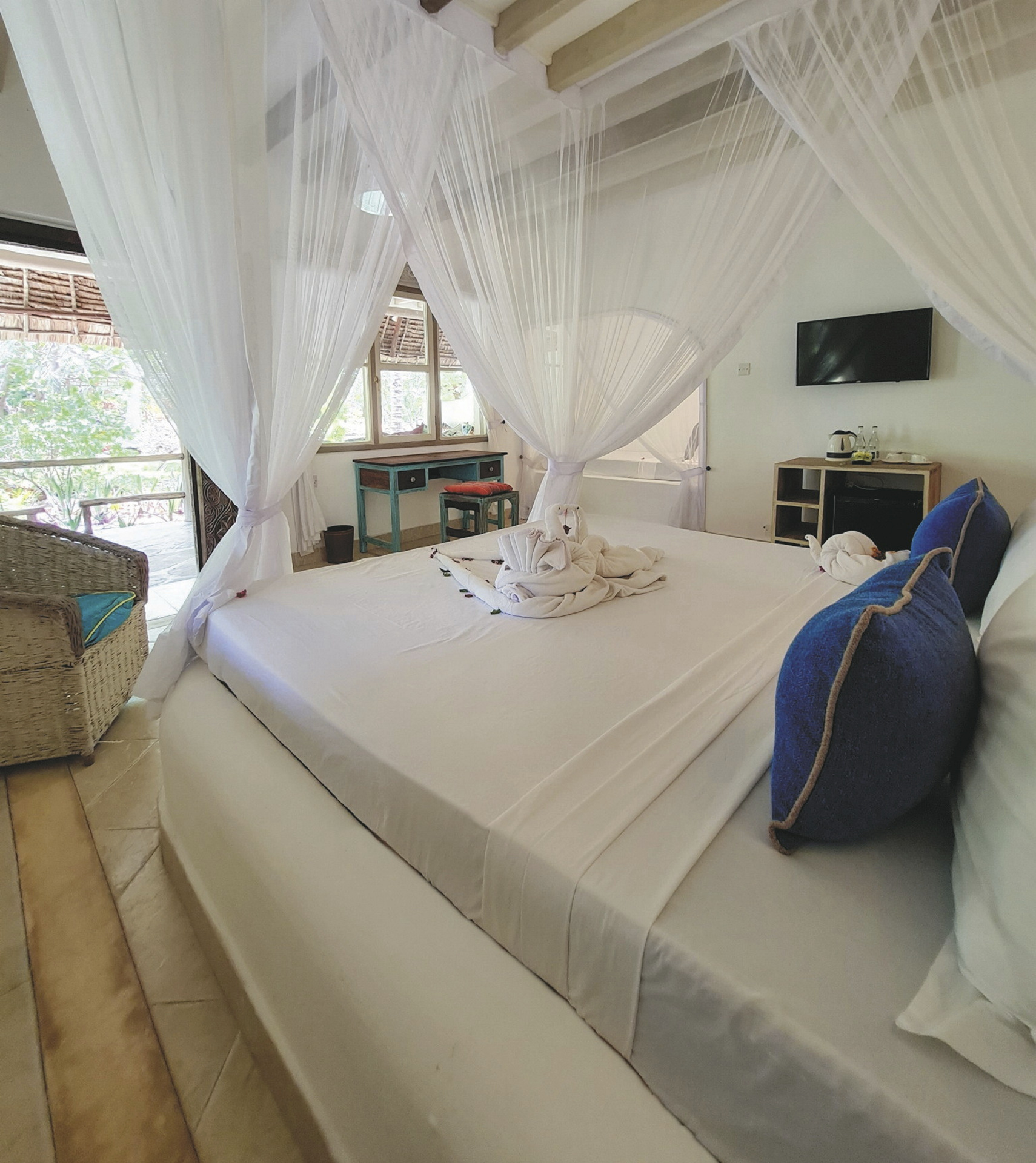Die 20 Standardzimmer bieten Blick zum Mida Creek mit seinen wunderschönen Mangroven und verfügen über ein Bad mit Dusche/WC, Fön, Klimaanlage, Deckenventilator, Safe, Minikühlschrank, Moskitonetz und eine gemeinsame Terrasse oder Balkon. Die 24 hell und freundlich eingerichteten Boutique-Gartenzimmer befinden sich im botanischen Garten mit mehr als 3.000 Pflanzen und Bäumen. Sie verfügen zusätzlich zu denStandardzimmern über einen Tee-/Kaffeezubereiter, TV, Kleiderschrank und Schreibtisch mit Stuhl. Mit einem Doppel- und Einzelbett sind sie ideal für Familien. Die 12 Deluxe-Zimmer in neutralen Farben sind im Boho-Swahili-Stil dekoriert und liegen nah am Mida Creek.