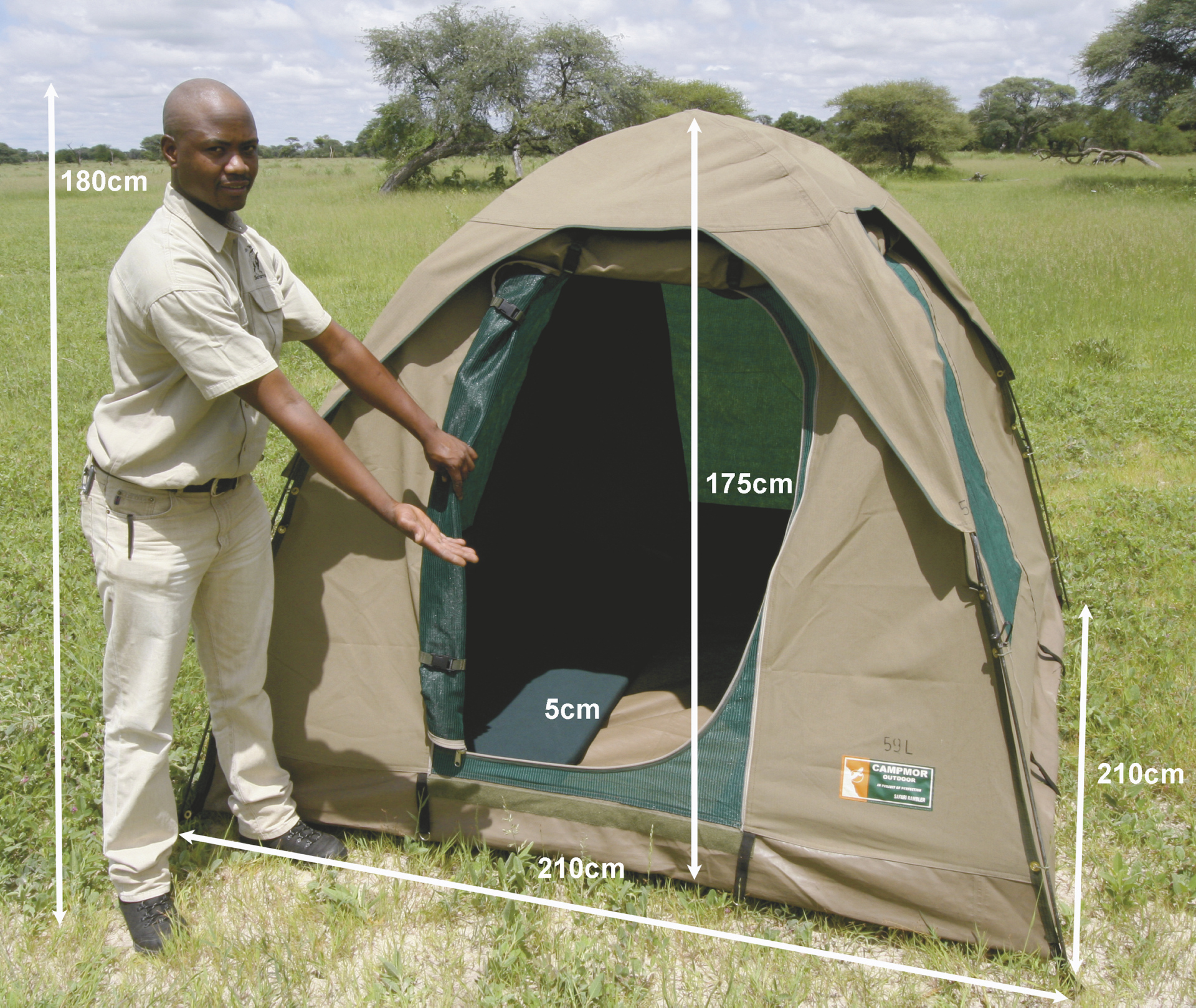 Die Größe der Zelte sind 2.1m x 2.1m x 1.75m. Eine 5cm dicke Schaumstoffmatratze wird für jeden Gast zur Verfügung gestellt. Sanitäre Einrichtungen werden geteilt und Buschtoilette und –dusche werden in den Nationalparks und Game Reserves vom Team aufgebaut.