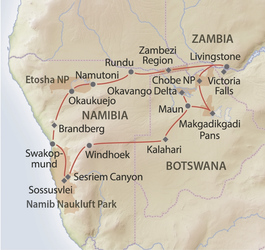 Diese umfassende Reise beinhaltet die Victoria Wasserfälle in Zambia und die Höhepunkte Namibias und Botswanas. Es ist ein Abenteuer zu einigen der spektakulärsten Regionen des südlichen Afrikas. Dieses Abenteuer erleben Sie gemeinsam mit Gleichgesinnten in einer kleinen Gruppe, begleitet von einer erfahrenen Reiseleitung, die zu vielen Reiseterminen auch deutschsprechend ist. Das Gruppengefühl wird gestärkt durch gemeinsame Aktivitäten wie z.B. Wanderungen und die gemeinsame Essenszubereitung.