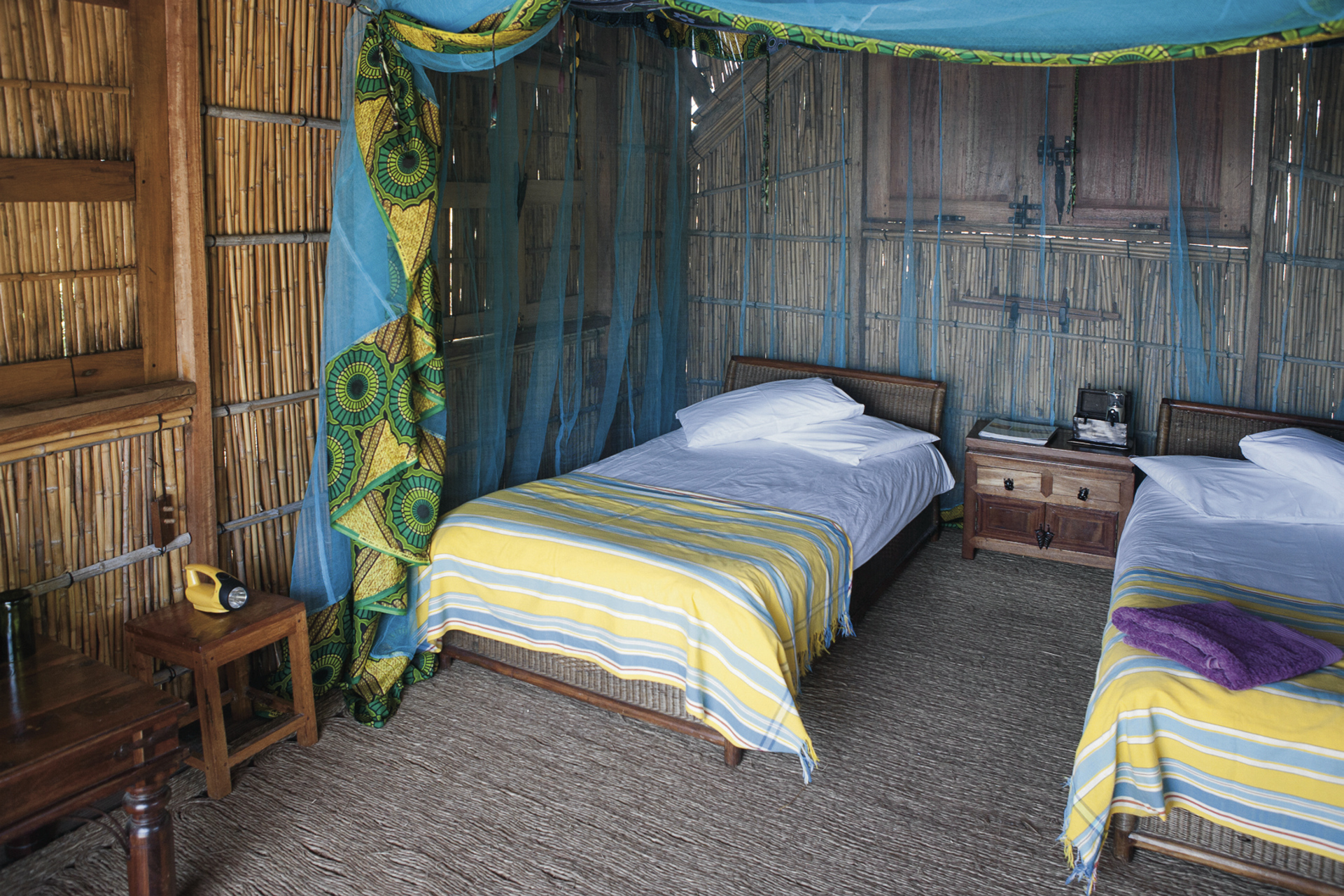 Alle 6 Zelt-Chalets erreichen Sie über eine kleine Holzbrücke. Jedes verfügt über ein einfaches Bad (Eimerdusche), Moskitonetz und Veranda mit Hängematte. Es gibt ein Familien-Chalet mit 2 Schlafzimmern.