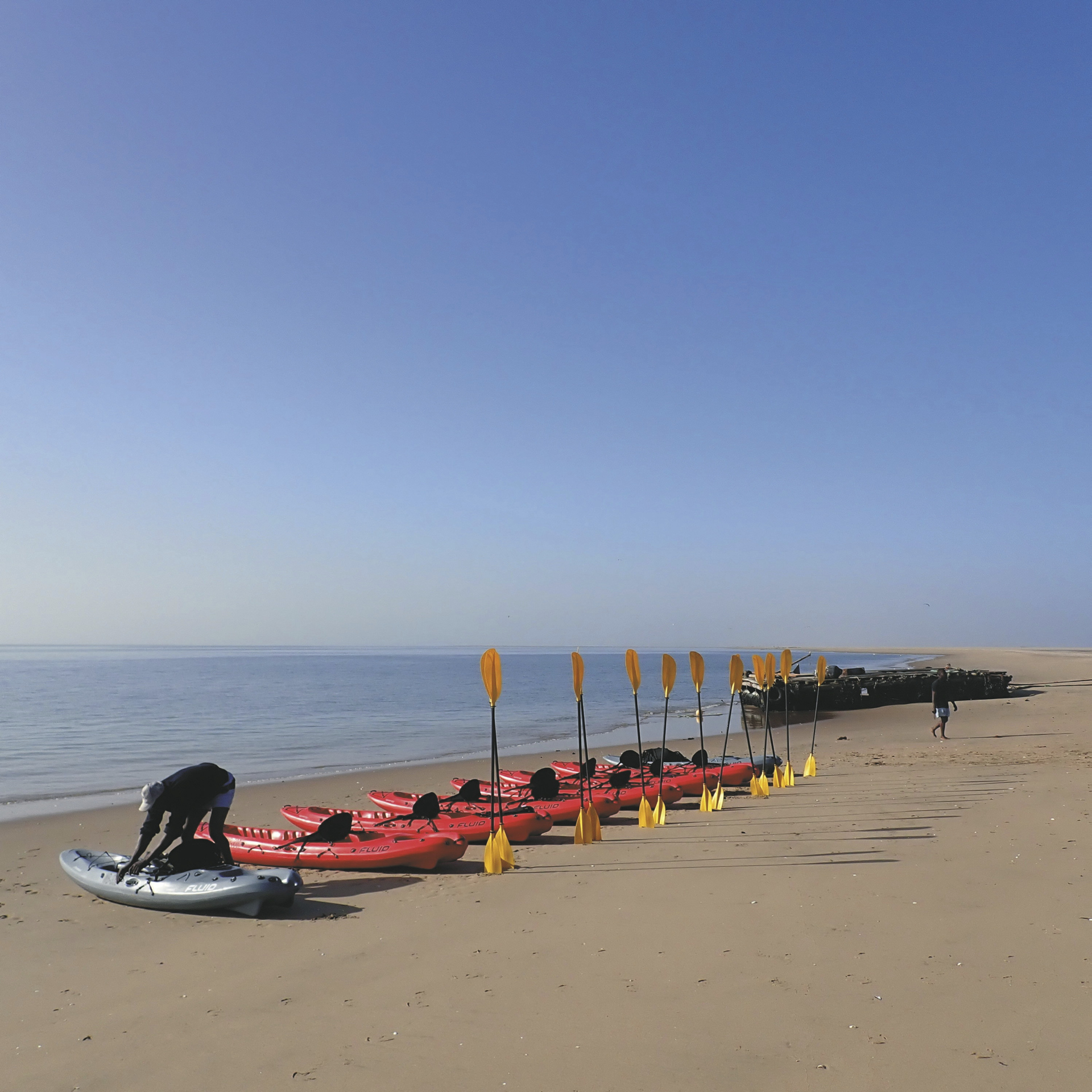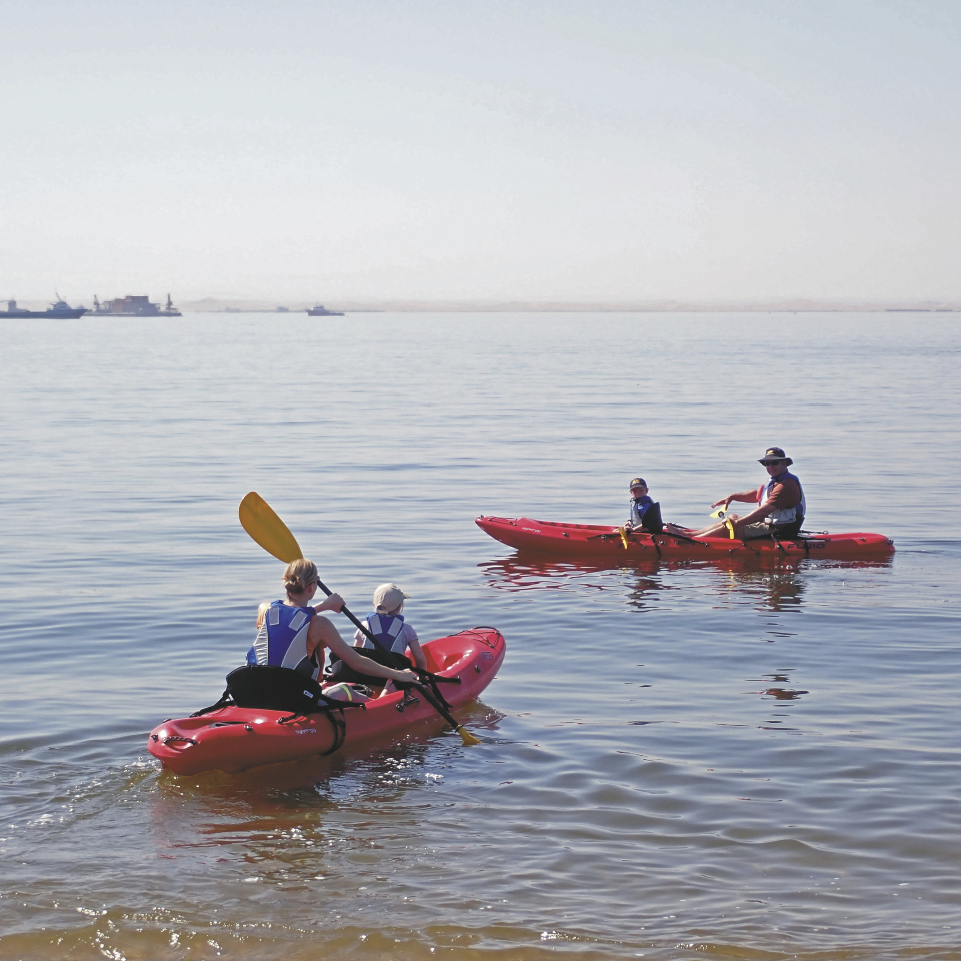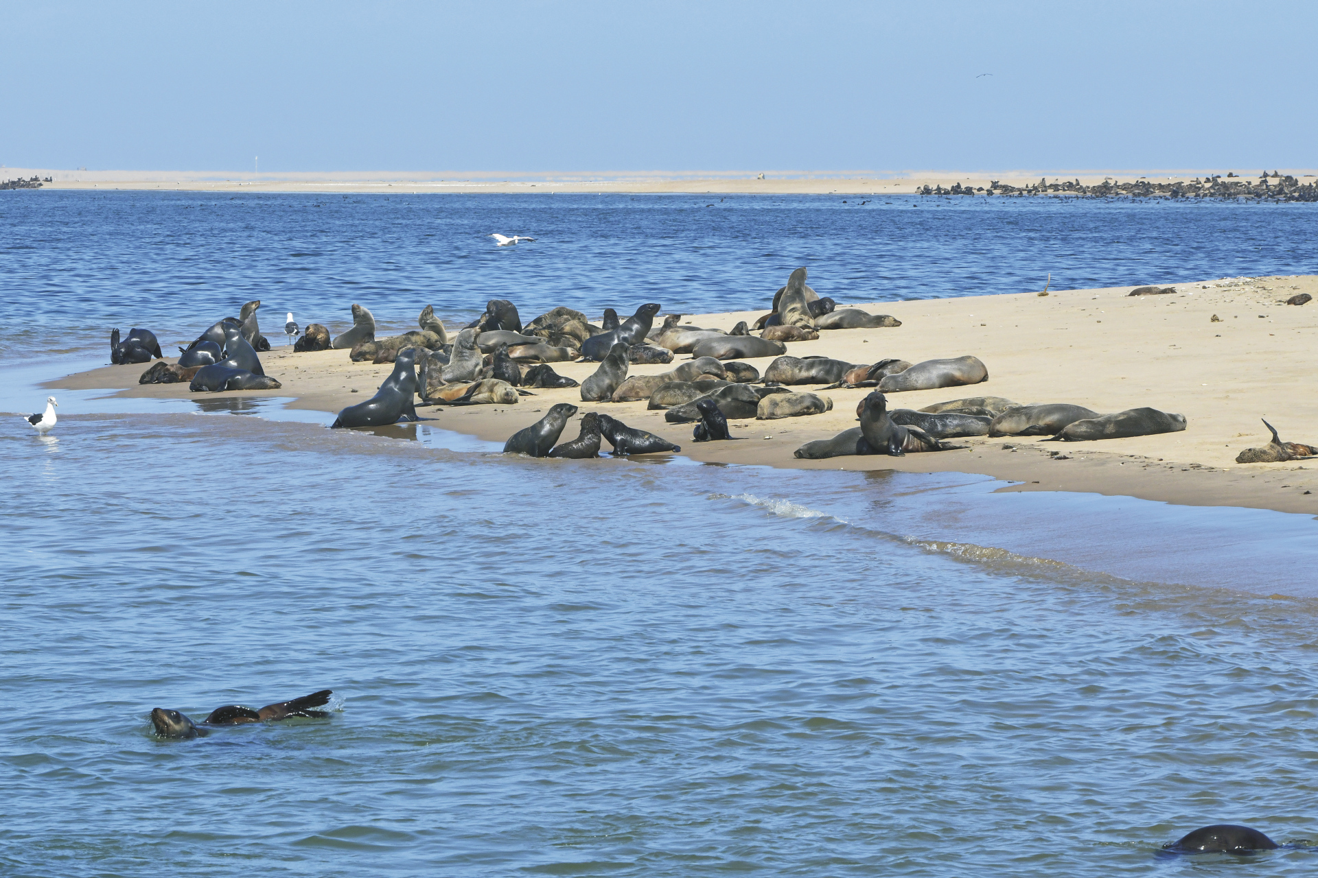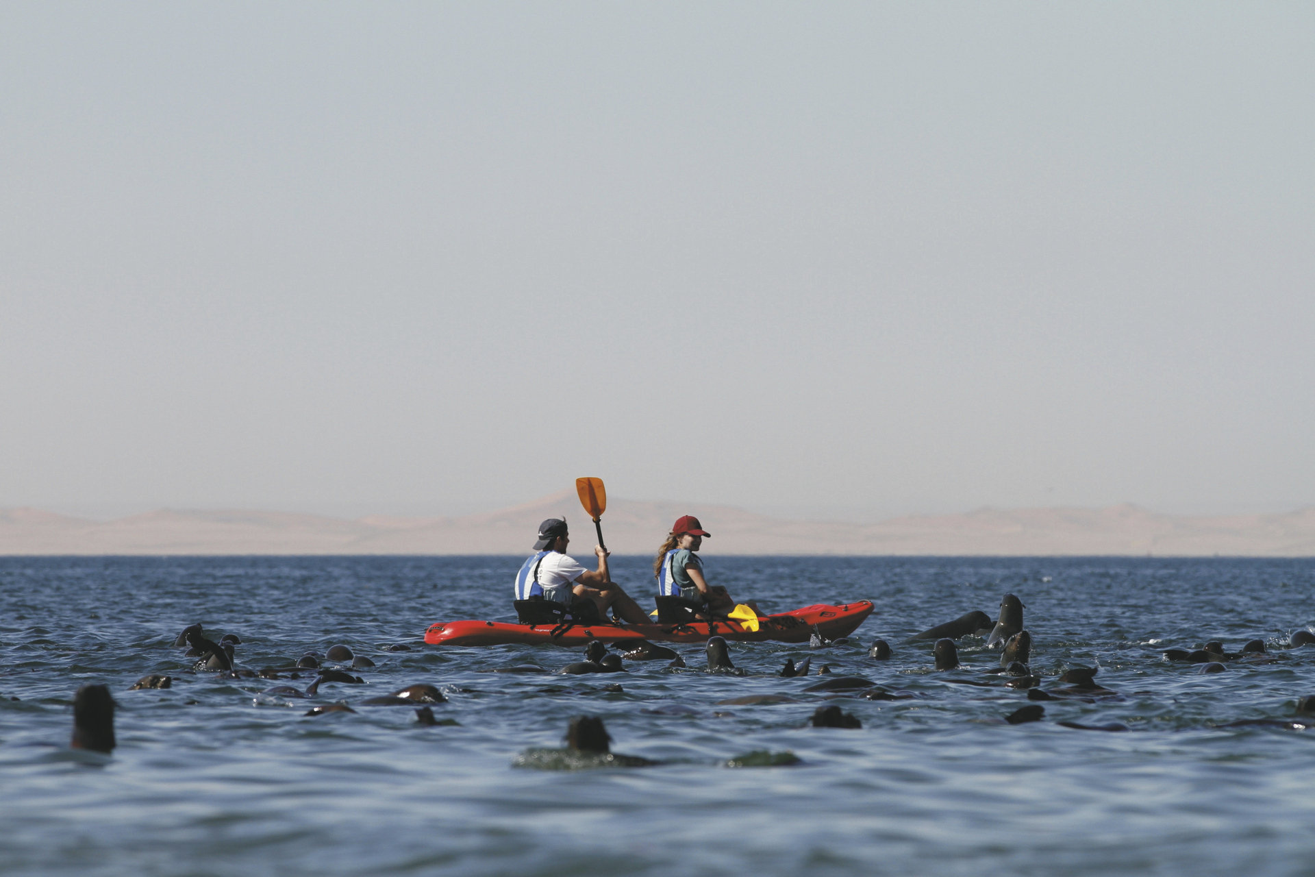 Per Katamaran geht es von der Waterfront in Walvis Bay zum Pelican Point, hier steigen Sie in die Doppelkajaks um und beginnen Ihr begleitetes Kajak-Abenteuer. Auf der Halbinsel lebt nicht nur eine große Kolonie Seerobben, auch Vögel wie Pelikane, Kormorane und Austernfischer können Sie hier gut beobachten. Die verspielten Robben umkreisen neugierig die Kajaks und liefern sich ein Wettrennen mit ihnen. Wenn Sie ganz still sitzen, taucht plötzlich neben dem Kajak ein dunkler Kopf mit großen, schwarzen Knopfaugen aus dem Wasser und schaut Sie fragend an. Erliegen Sie nicht dem niedlichen Blick, der zum Streicheln auffordert, es sind Raubtiere mit messerscharfen Zähnen! Nach einem Snack auf dem menschenleeren Strand geht es mit dem 4x4 Fahrzeug über die Halbinsel, entlang der Lagune und den Salzpfannen, wo die Flamingos leben, zurück zur Waterfront.