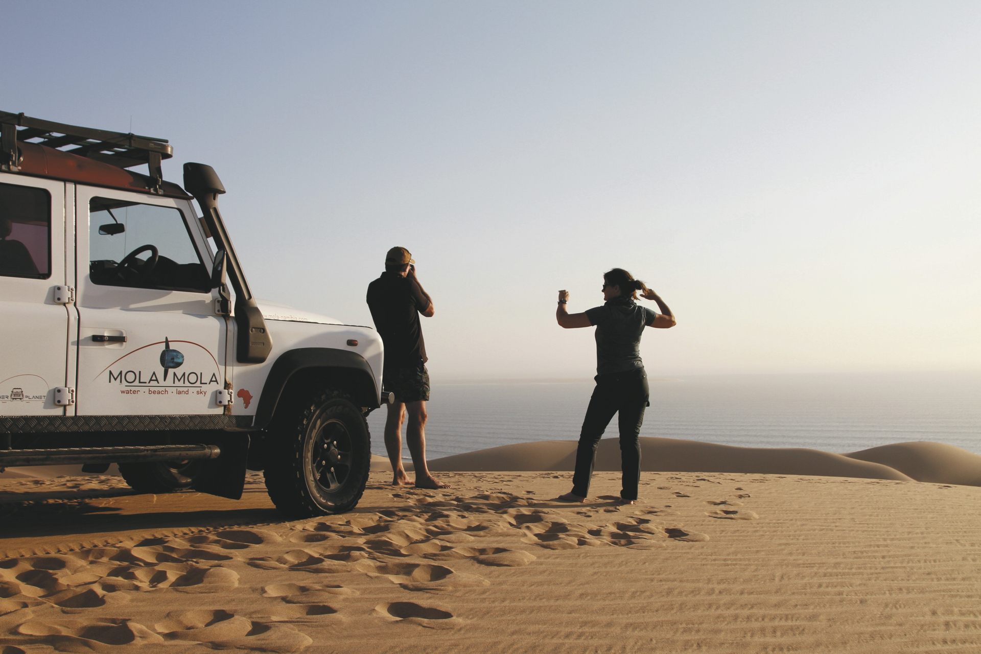 Kombinieren Sie das Abenteuer Sandwich Harbour mit der Bootstour Delfine, Robben & Co zu dem Ganztagesausflug Lagune & Sandwich Harbour.Morgens um 9.00 Uhr geht es mit dem Katamaran hinaus auf´s Meer. Delfine, Robben und die diversen Seevögel sowie Wale zur Walsaison warten auf Sie und können meist aus nächster Nähe beobachtet und fotografiert werden. Nach Ihrer Rückkehr wartet am Hafen ein Fahrer/Tourguide mit einem Allrad-Fahrzeug auf Sie. Die Fahrt führt durch die Lagune von Walvis Bay, etliche Flamingos und Pelikane siedelten hier, in die Dünenlandschaften. Bei diesem Ausflug können Sie die besten Erlebnisse an einem einzigen Tag genießen. Der Atlantische Ozean, die Strände, ein fantastisches Mittagessen in den Dünen und die beeindruckenden Dünen von Sandwich Harbour. Die vielleicht emotionalsten Momente Ihres gesamten Abenteuers in Namibia werden Sie erleben, wenn Sie zwischen dem tosenden Ozean und den uralten Sanddünen der Namib fahren, oder wenn Sie auf dem Gipfel der Dünen stehen und einen endlosen Blick auf Sand und Himmel haben.