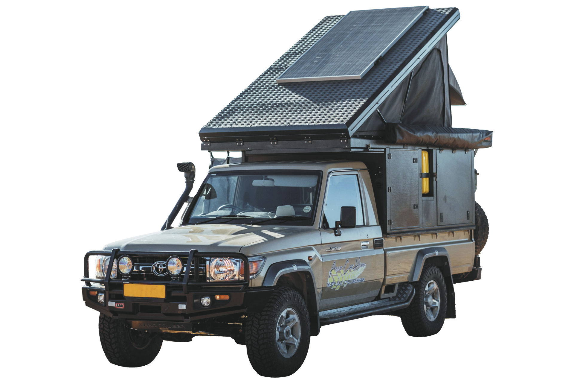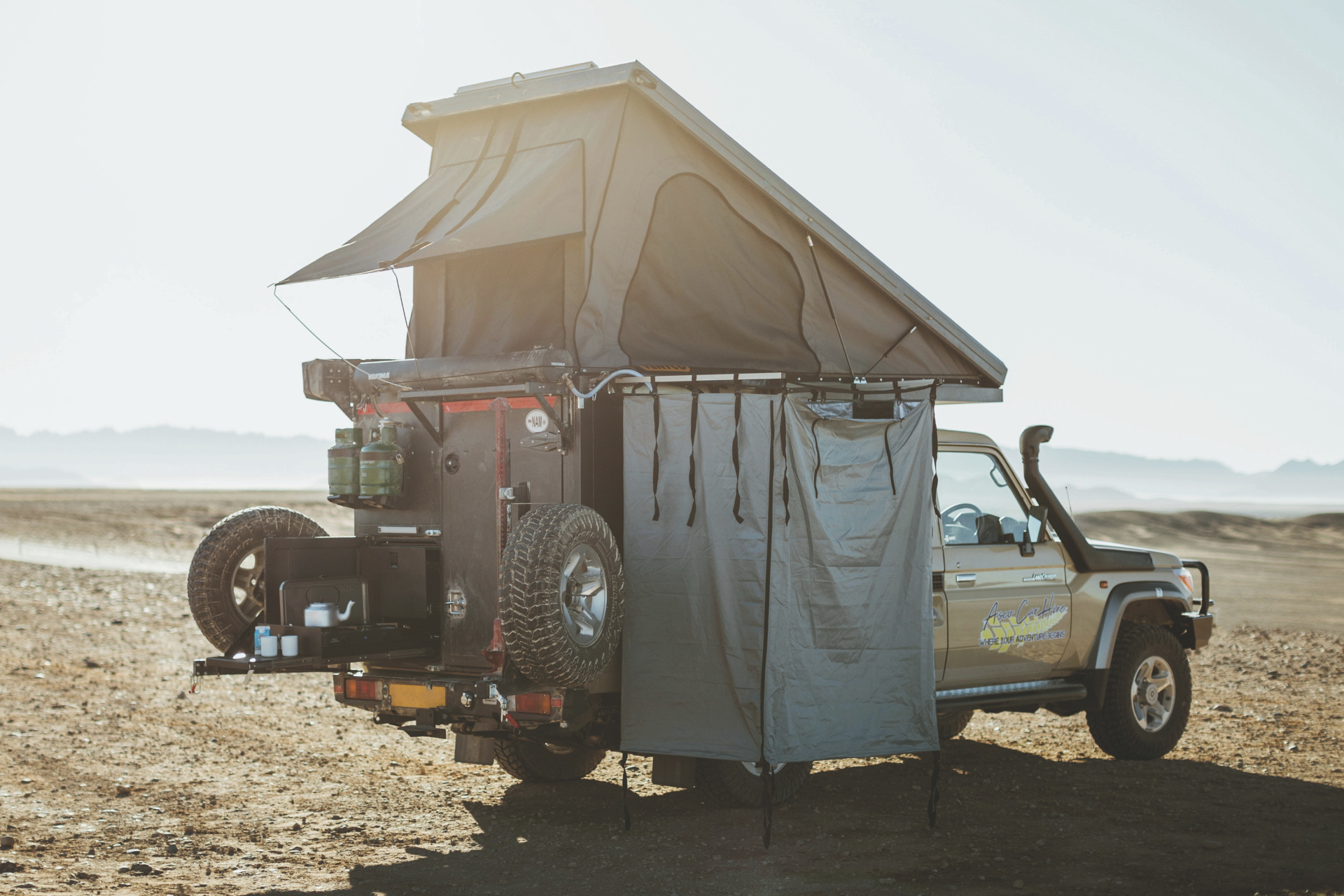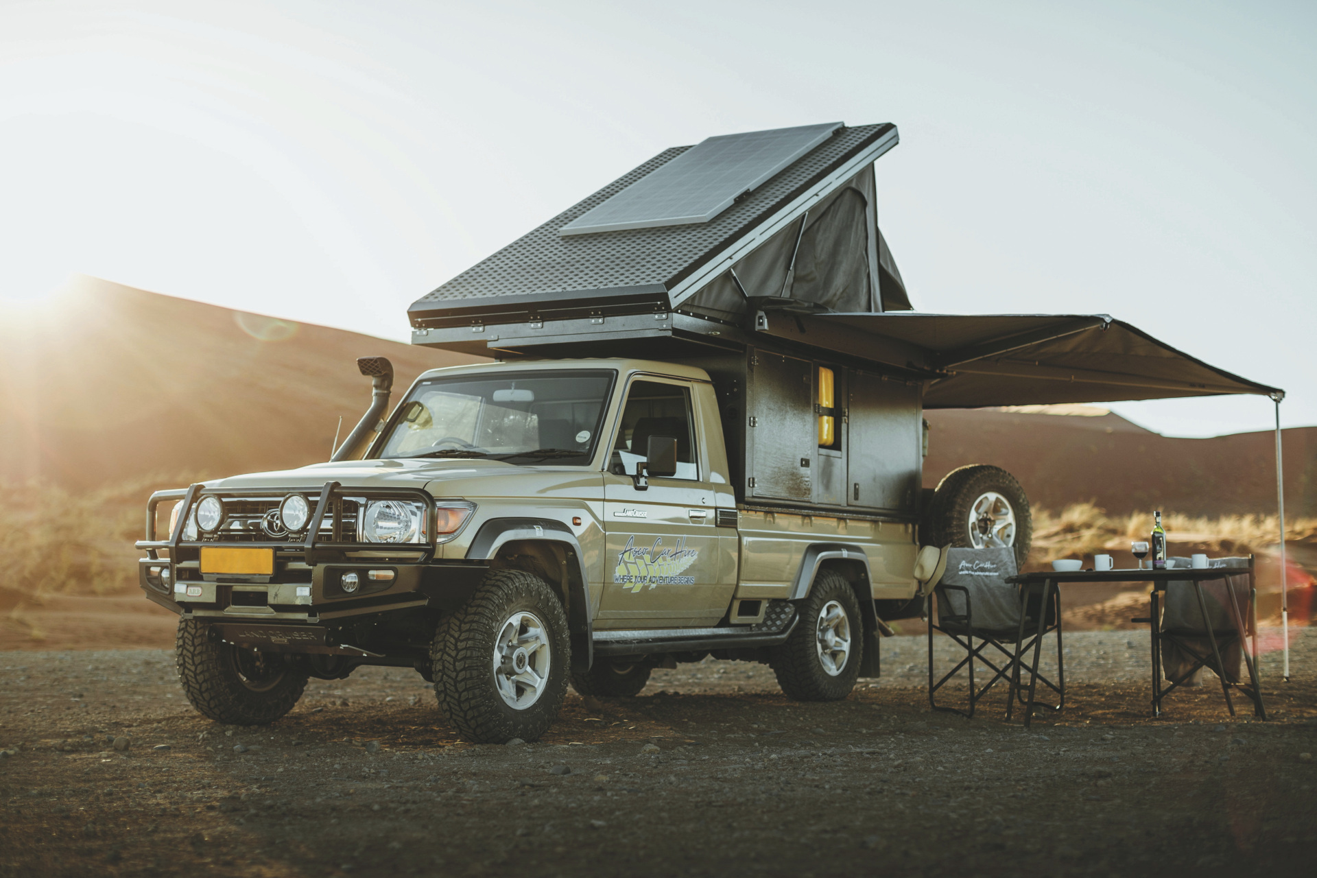 Der Bushcamper basiert auf einem Toyota Landcruiser der jüngsten Generation und verfügt als einziges Modell in der ASCO-Flotte über eine Wohn-/Schlafkabine mit einem Doppelbett im Aufstelldach. Ein 4x4-Camper für maximal 2 Personen.