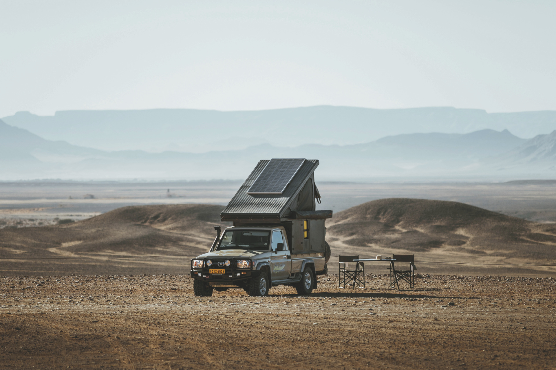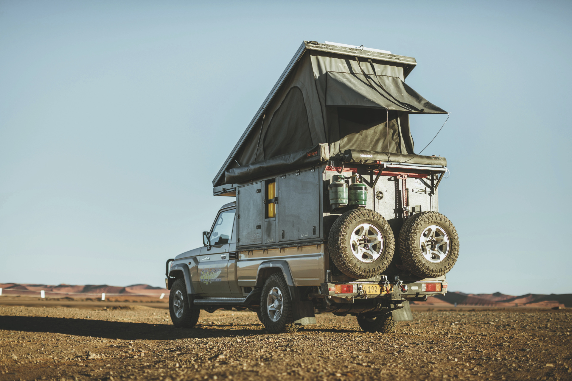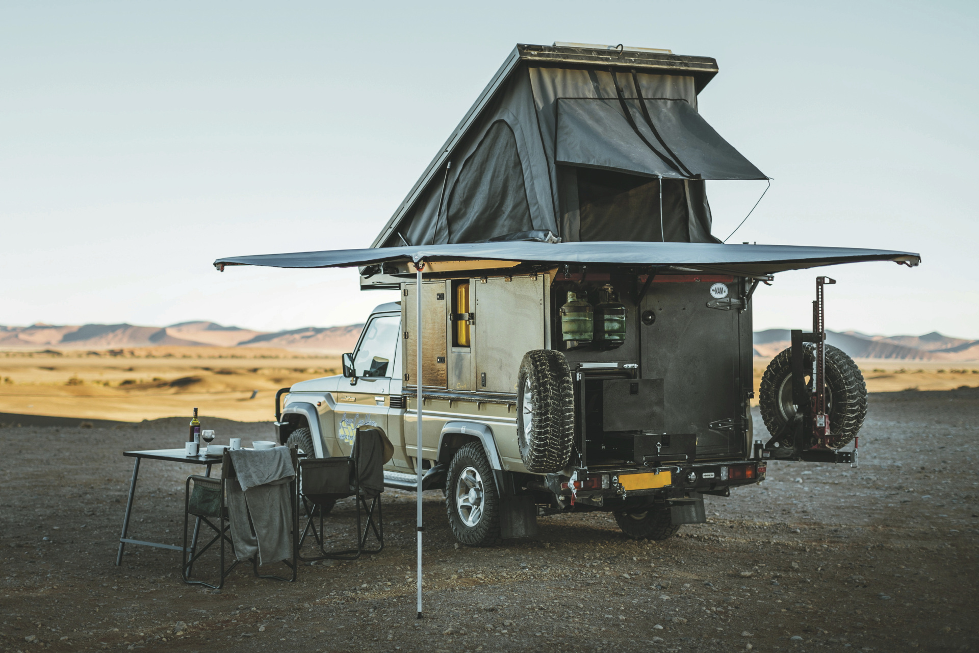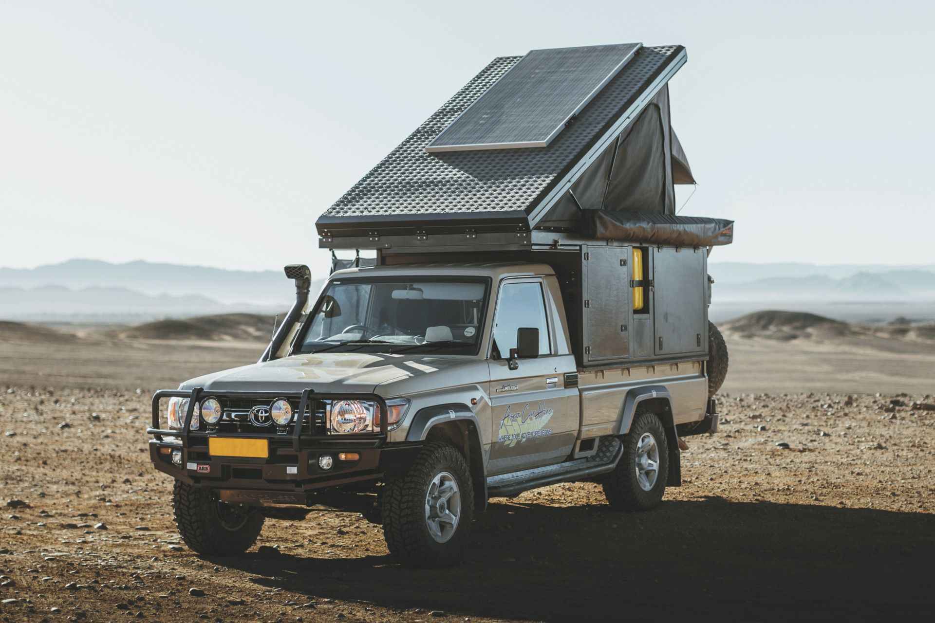 Der Bushcamper basiert auf einem Toyota Landcruiser der jüngsten Generation und verfügt als einziges Modell in der ASCO-Flotte über eine Wohn-/Schlafkabine mit einem Doppelbett im Aufstelldach. Ein 4x4-Camper für maximal 2 Personen.