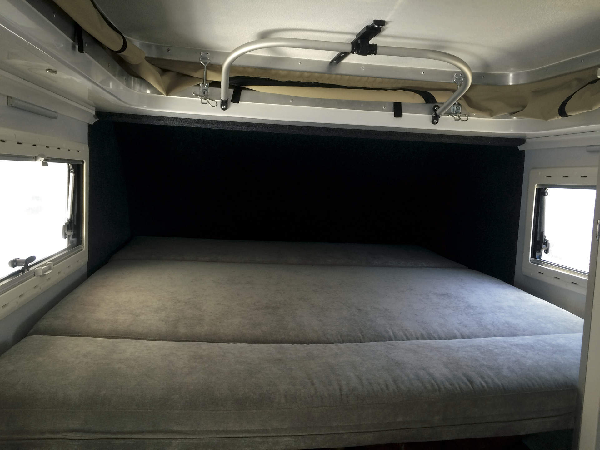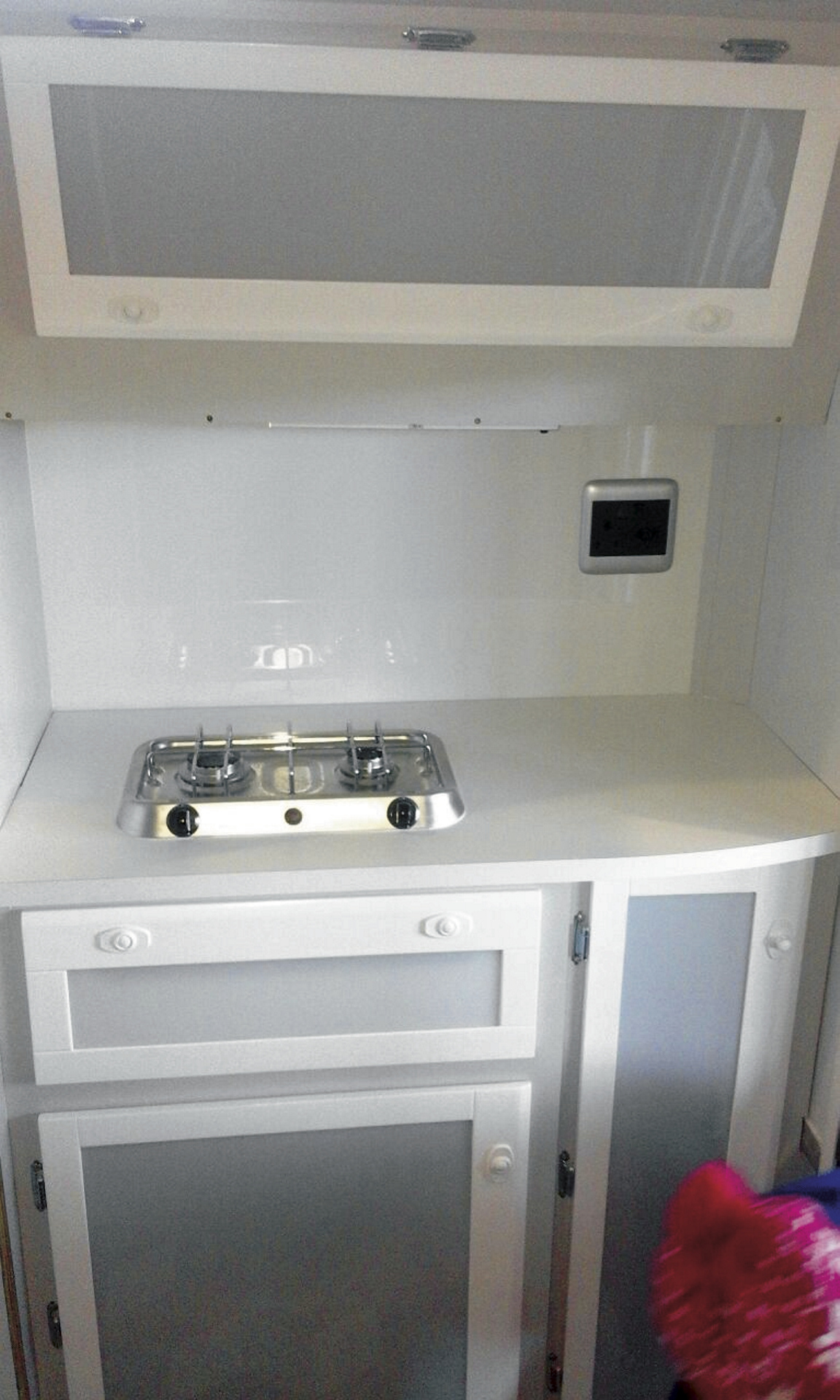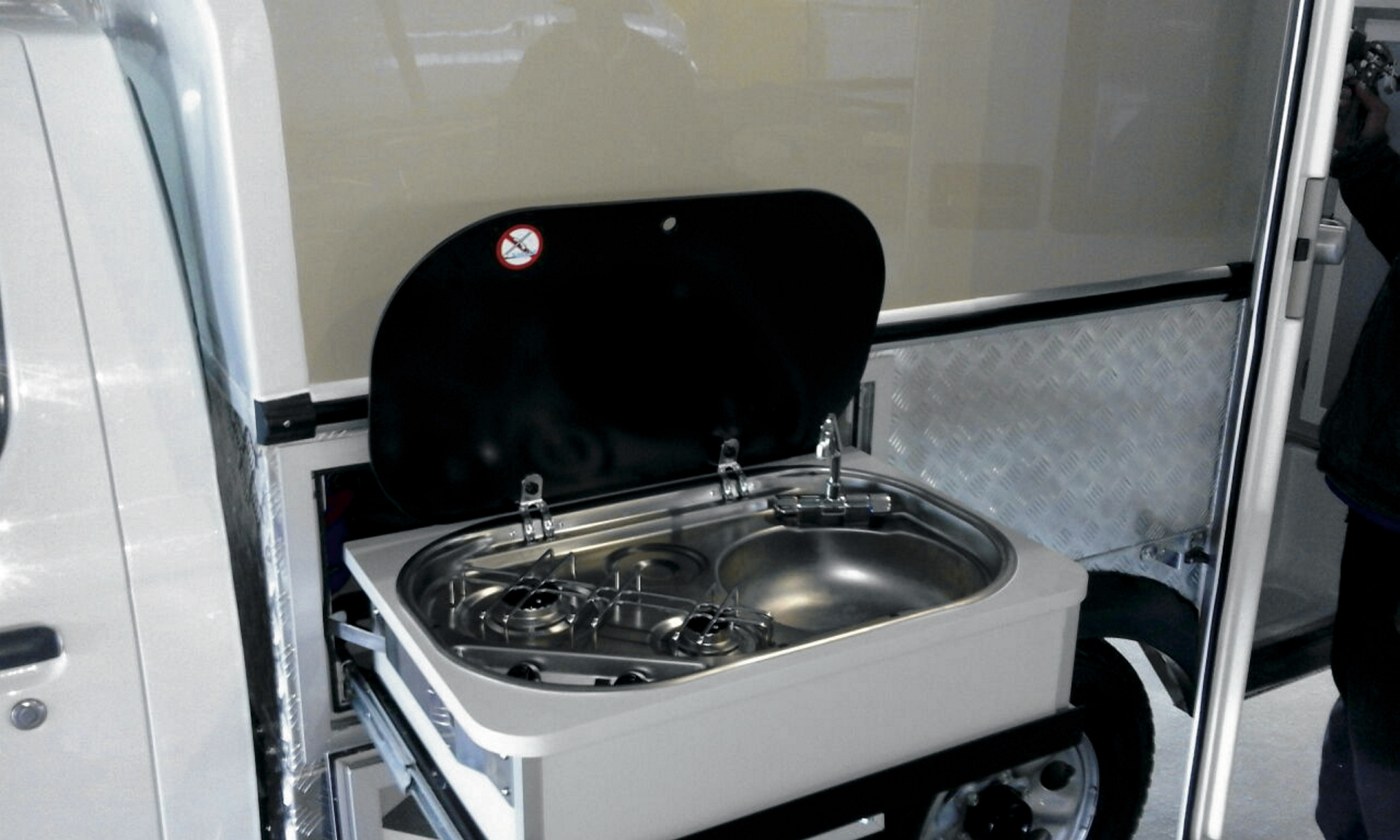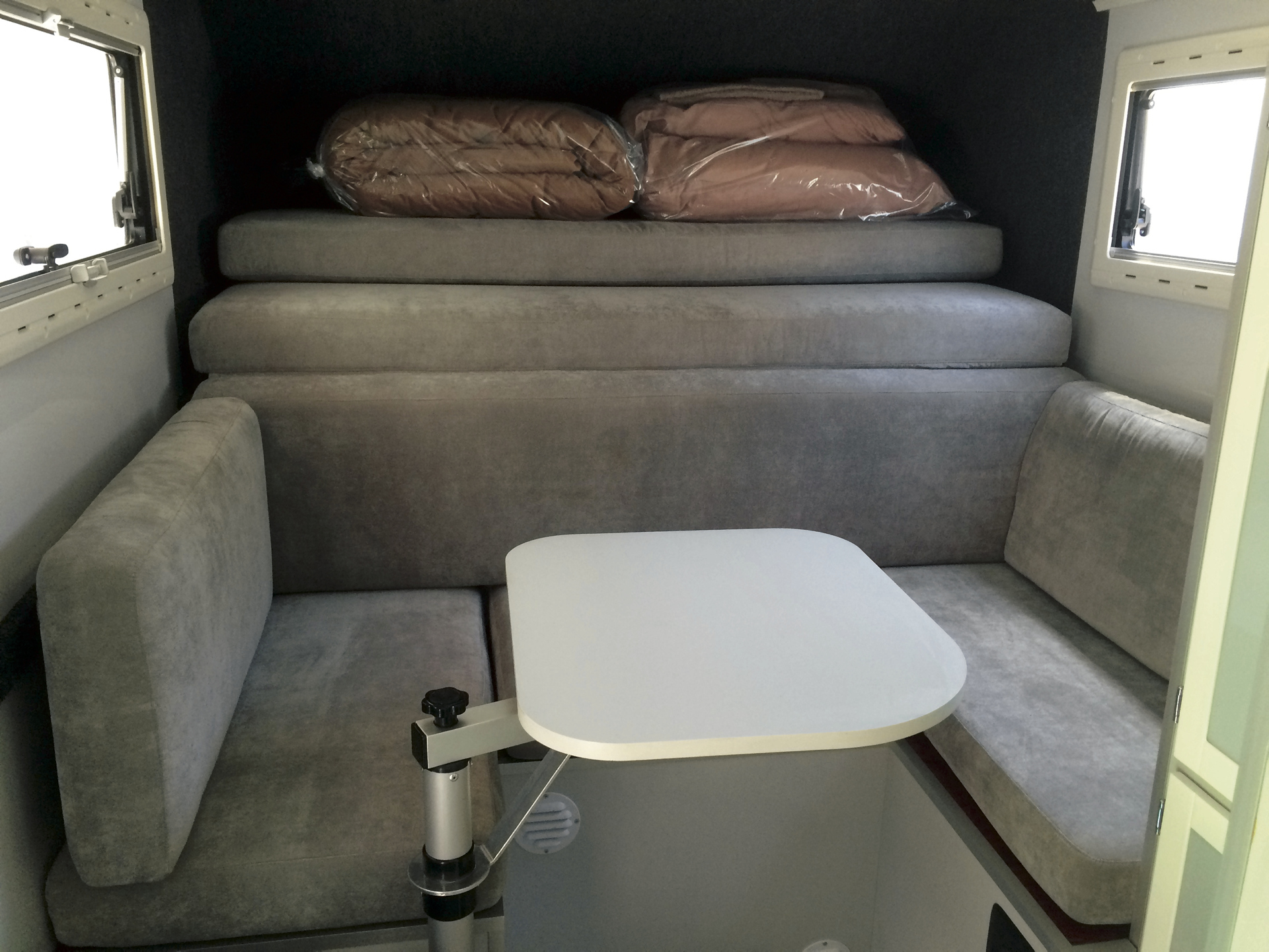 • Wohnkabine mit seitlichem Zugang, aufklappbarem Dach, Sitzgruppe mit Esstisch, Toilettenraum mit Chemie-WC und Außen-Handdusche; zwei 2-flammige Gasherde (innen und außen)