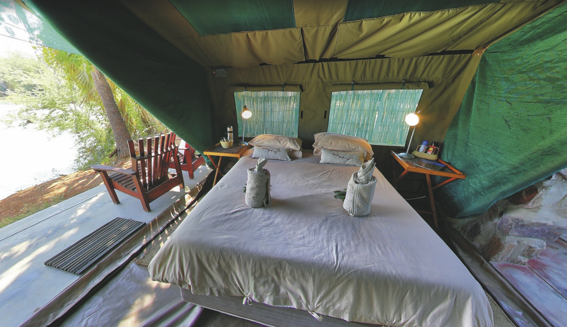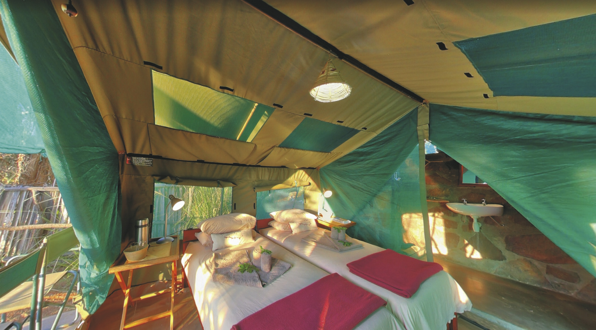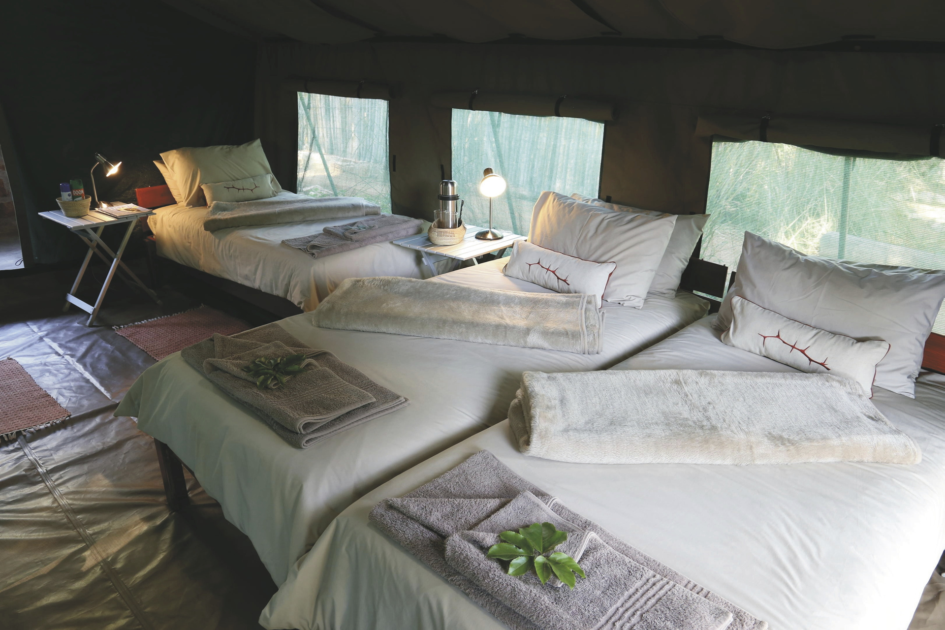 Die 10 rustikalen Safarizelte stehen auf Steinplattformen und haben alle ein eigenes Bad, eine überdachte Terrasse, einen Safe und Moskitonetze an Fenstern und Türen. Es ist ein Familienzelt mit 4 Betten verfügbar.