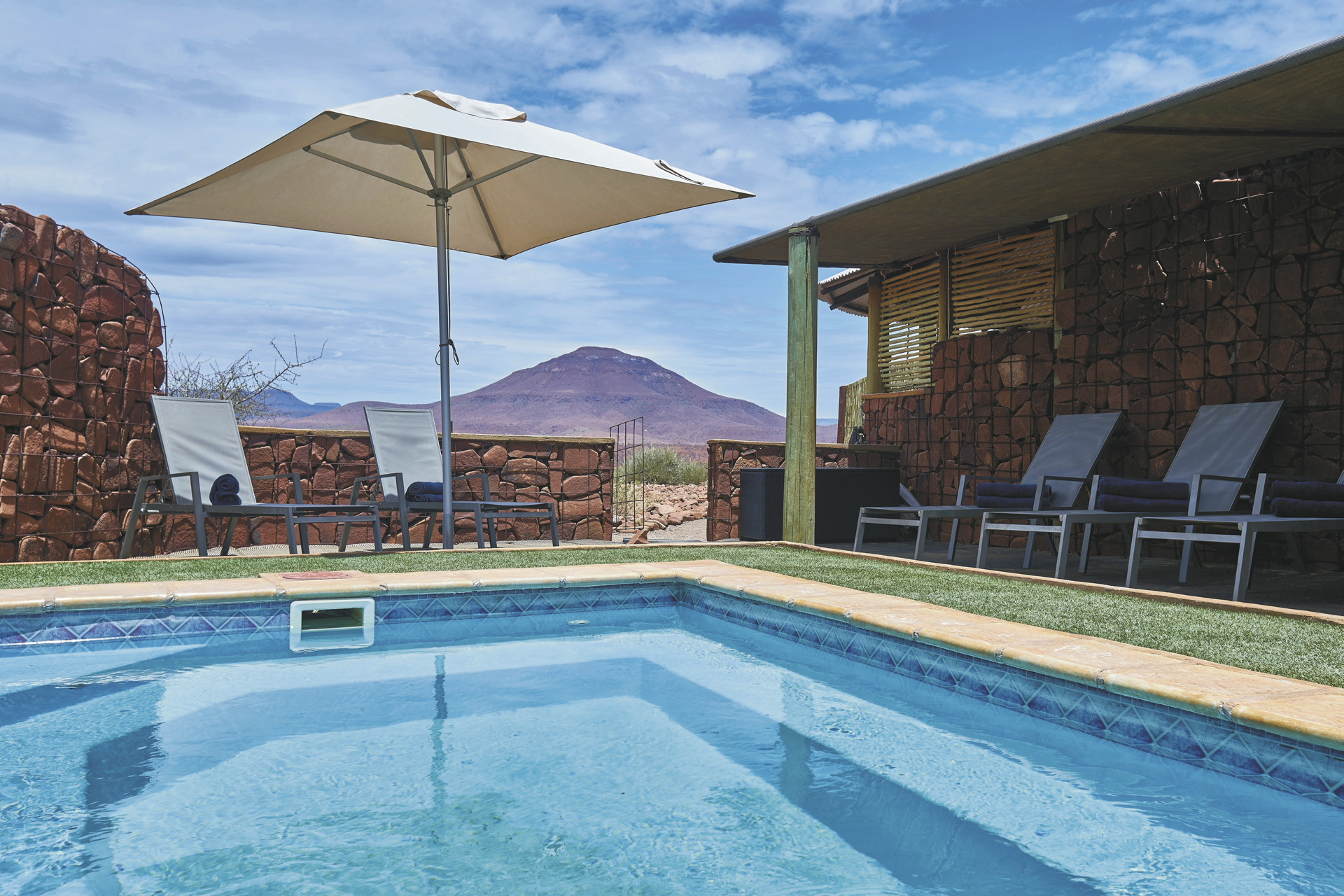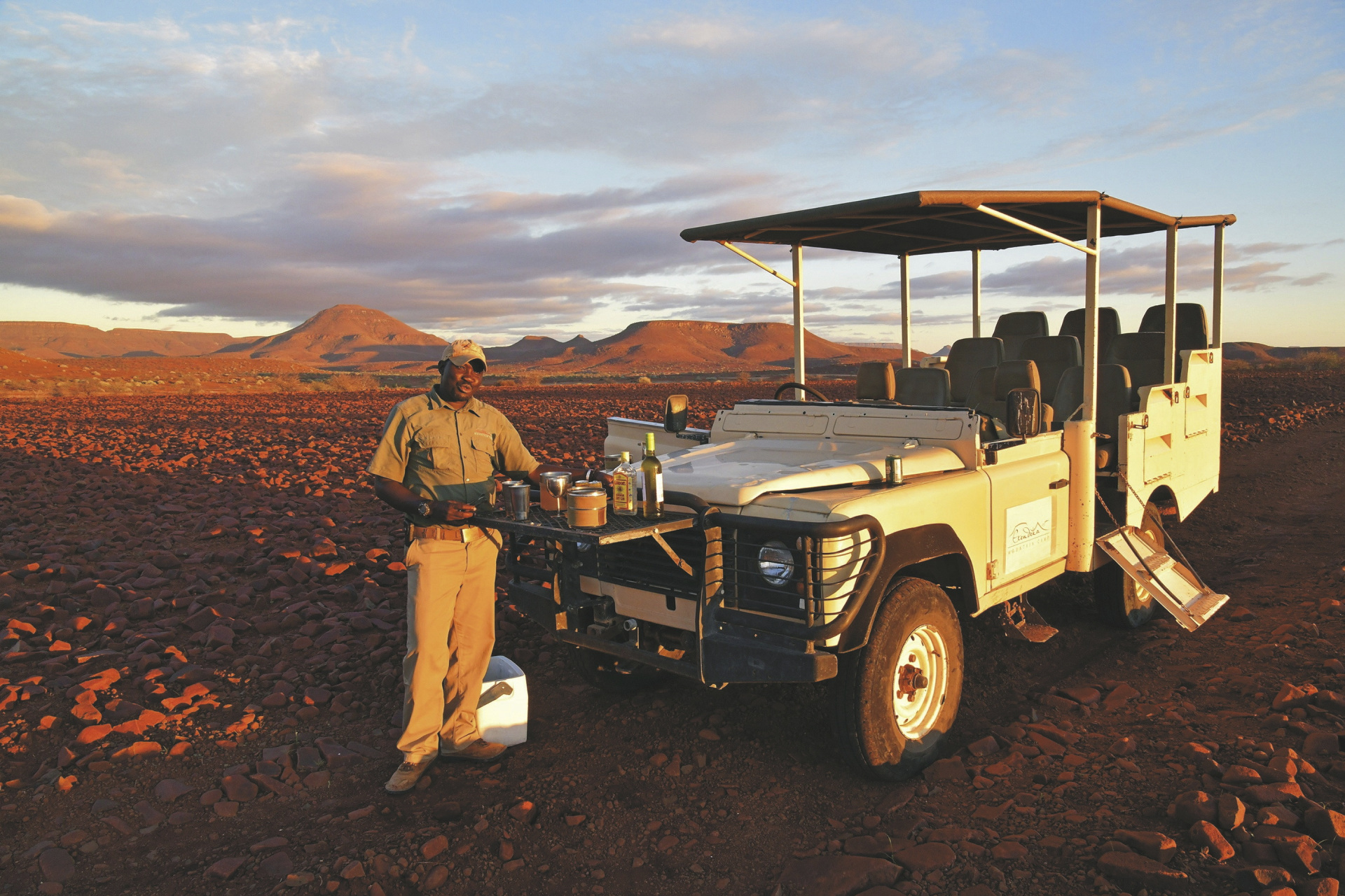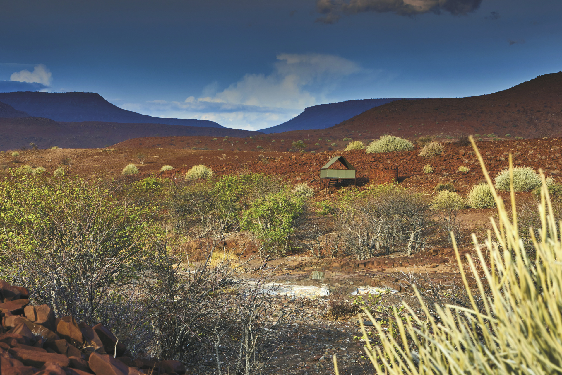 In den Ausläufern des Grootberg Massivs, inmitten einer herrlichen Landschaft und der uralten Etendeka Lava des nördlichen Damaralandes angrenzend an die Palmwag Konzession, ca. 660 km bis Windhoek. Ihr Fahrzeug parken Sie sicher auf dem Gelände der Palmwag Lodge, von dort erfolgt ein 1,5-stündiger Transfer mit dem Allradfahrzeug zur Lodge.