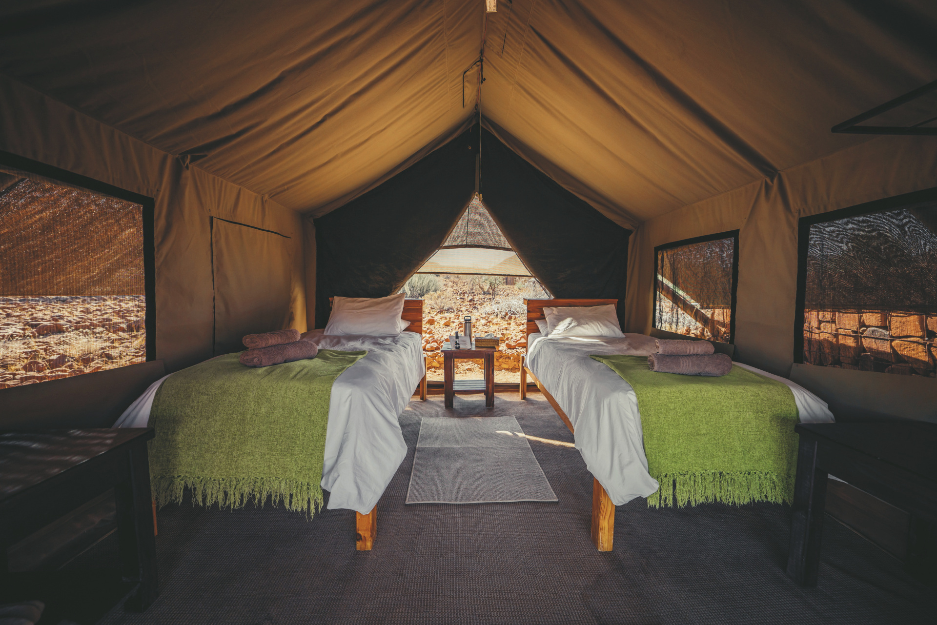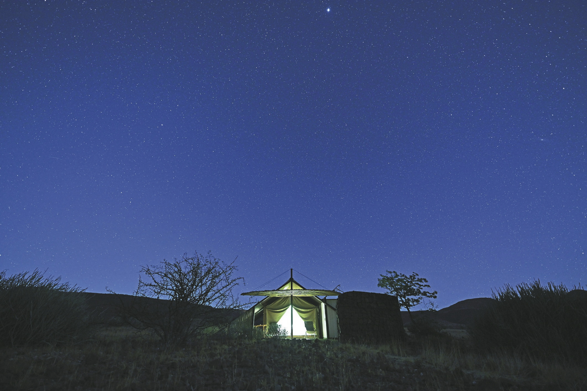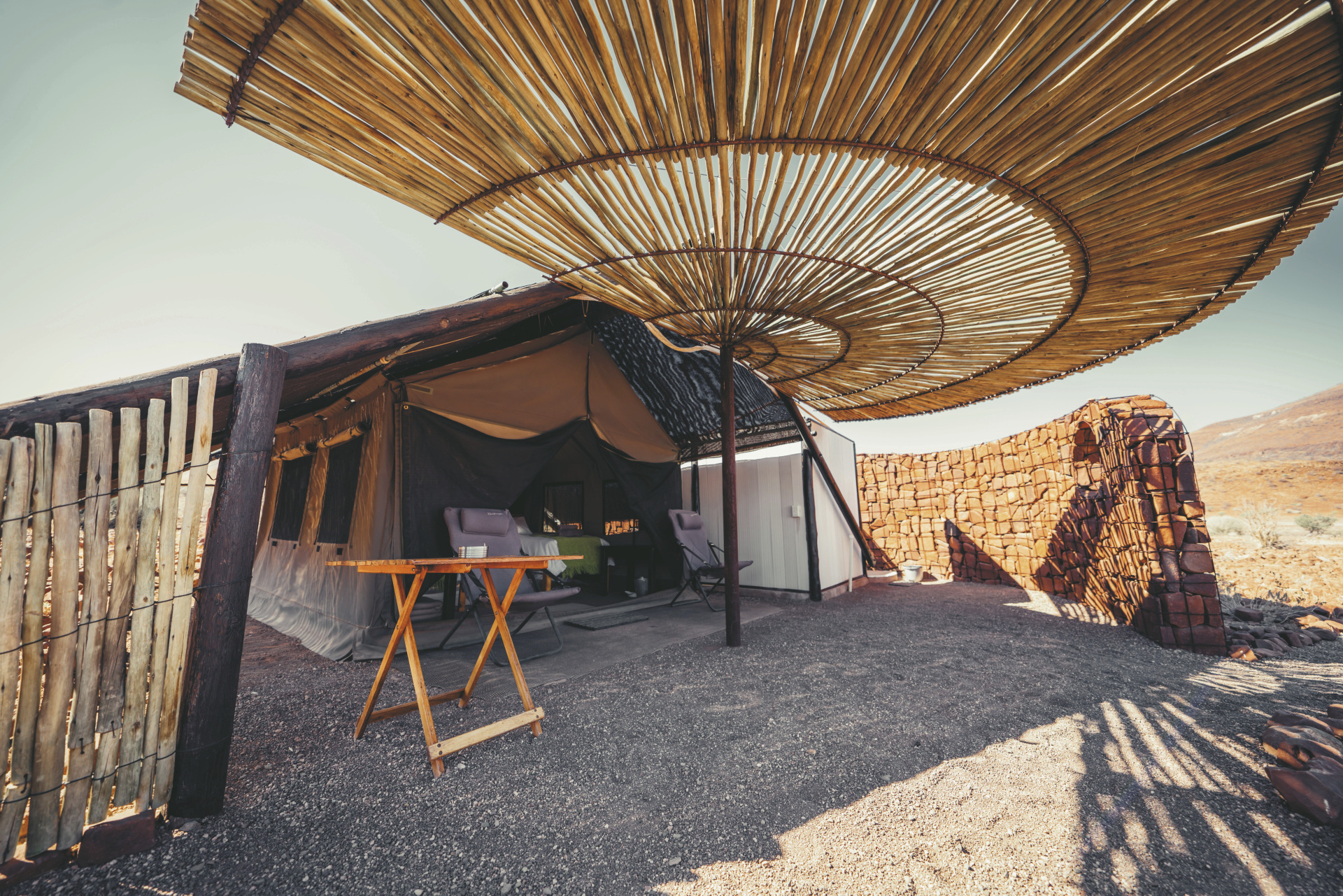 „Die Atmosphäre in Etendeka ist rustikal; wir wollten das raue Element des traditionellen Zeltlagers zurückbringen, das die meisten Camps in Nambia leider verloren haben“, so beschreibt der Campbetreiber Etendeka. Ein echtes Wildnis-Erlebnis. Die Landschaft ist rau, unberührt und atemberaubend. Das Hauptaugenmerk liegt auf den Wanderaktivitäten.