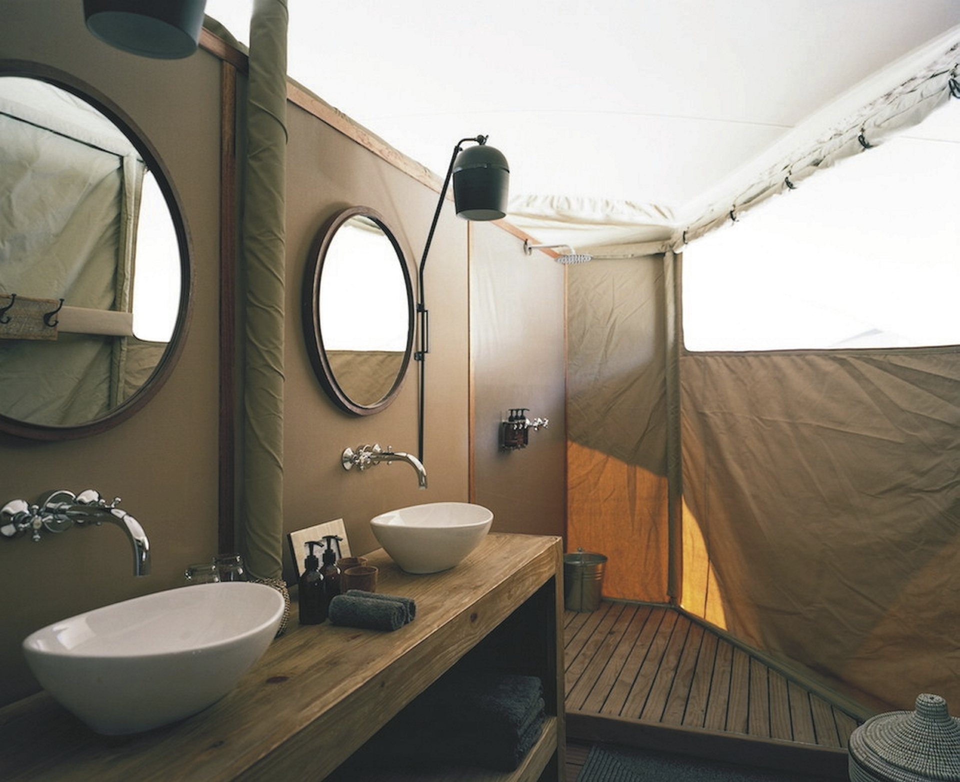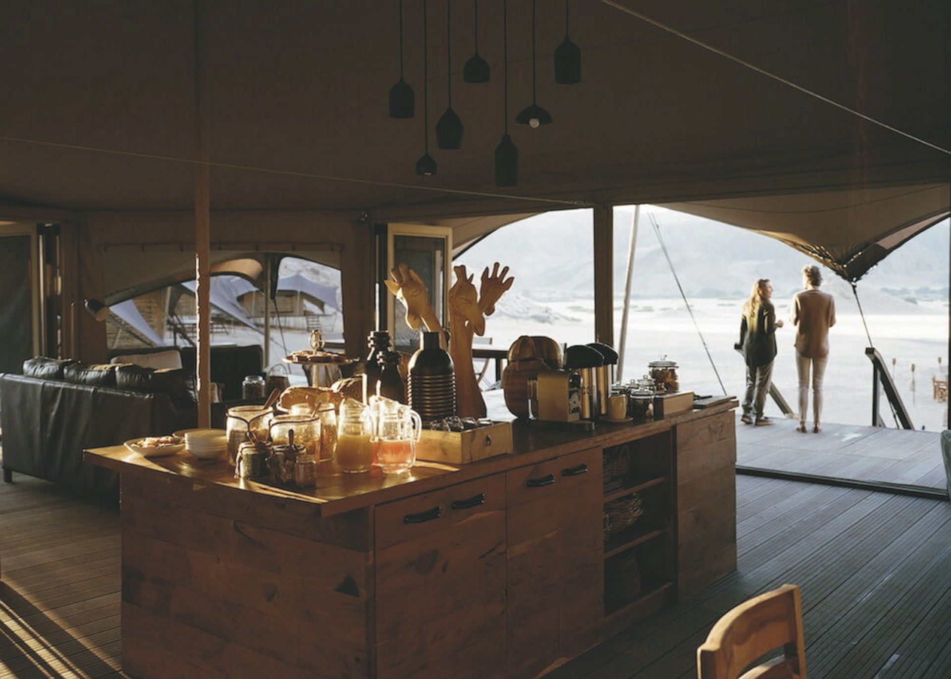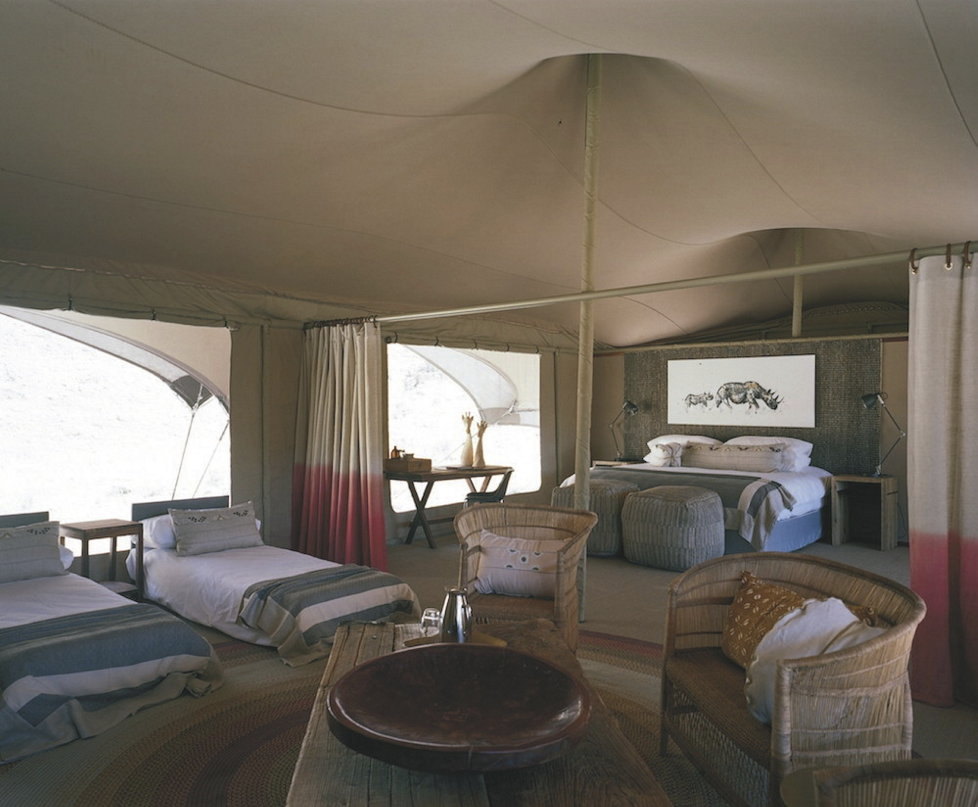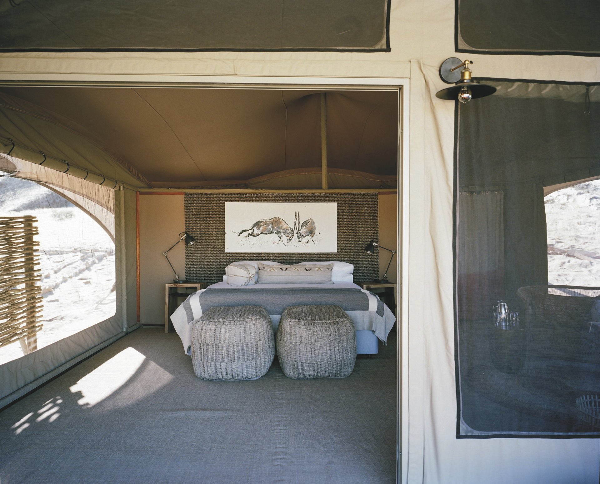 Die 6 geräumigen Zelte sind auf Holzplattformen nur wenige Stufen über dem Boden erbaut und fügen sich nahezu perfekt in die Umgebung ein. Naturnah, in erdigen Farben eingerichtet strahlen sie Gemütlichkeit im Out of Africa Stil aus. Die Farben, Texturen und Muster sind von der Umgebung inspiriert: das satte Ocker der Dünen, die geometrischen Muster der Himba und natürlich die Giraffe, die das Projekt inspiriert hat. Jedes Zelt verfügt über ein rustikales, offenes Bad, Ventilator, Safe und eine möblierte, überdachte Terrasse. Das Familienzelt bietet 4 Personen Platz.