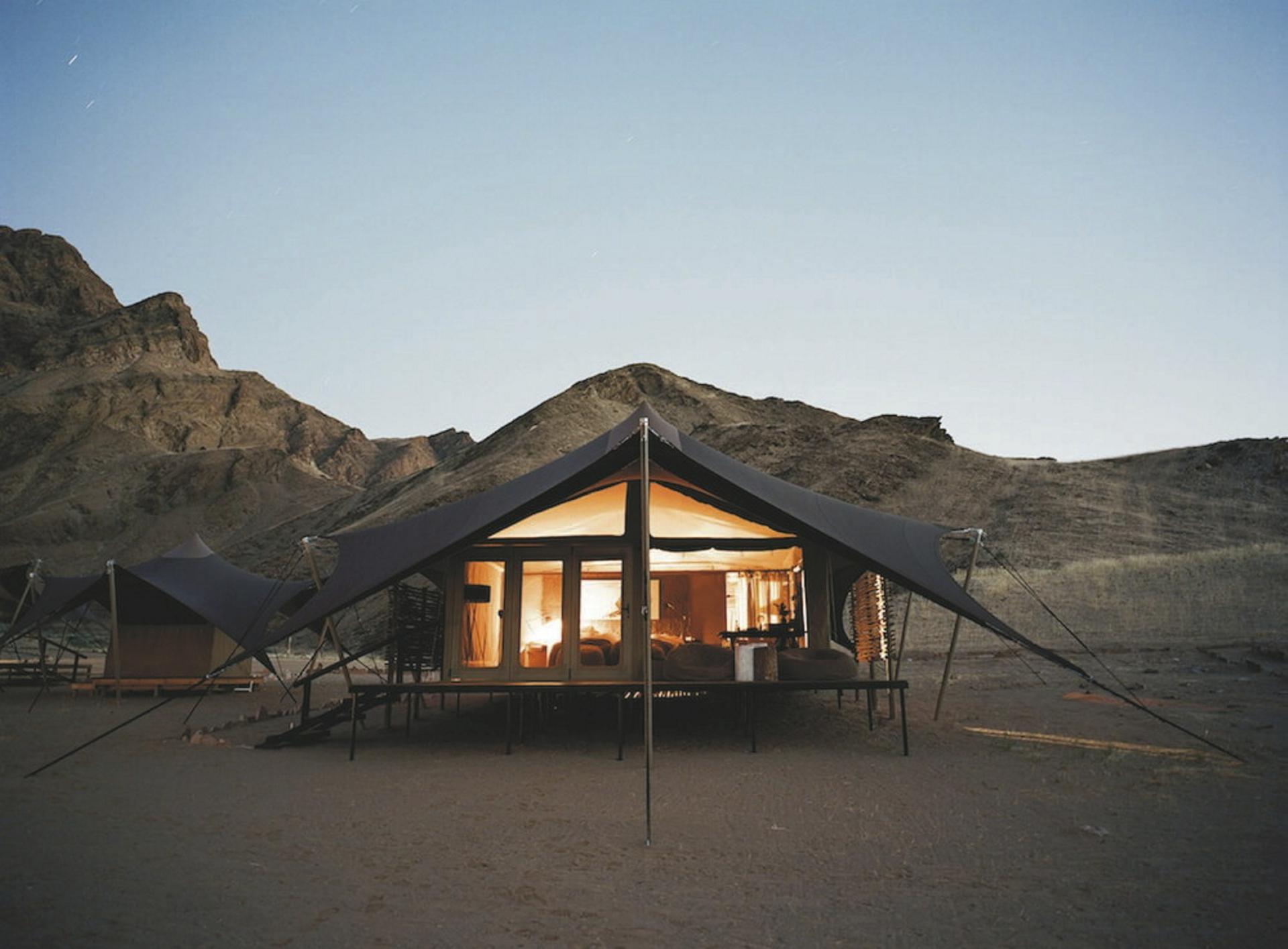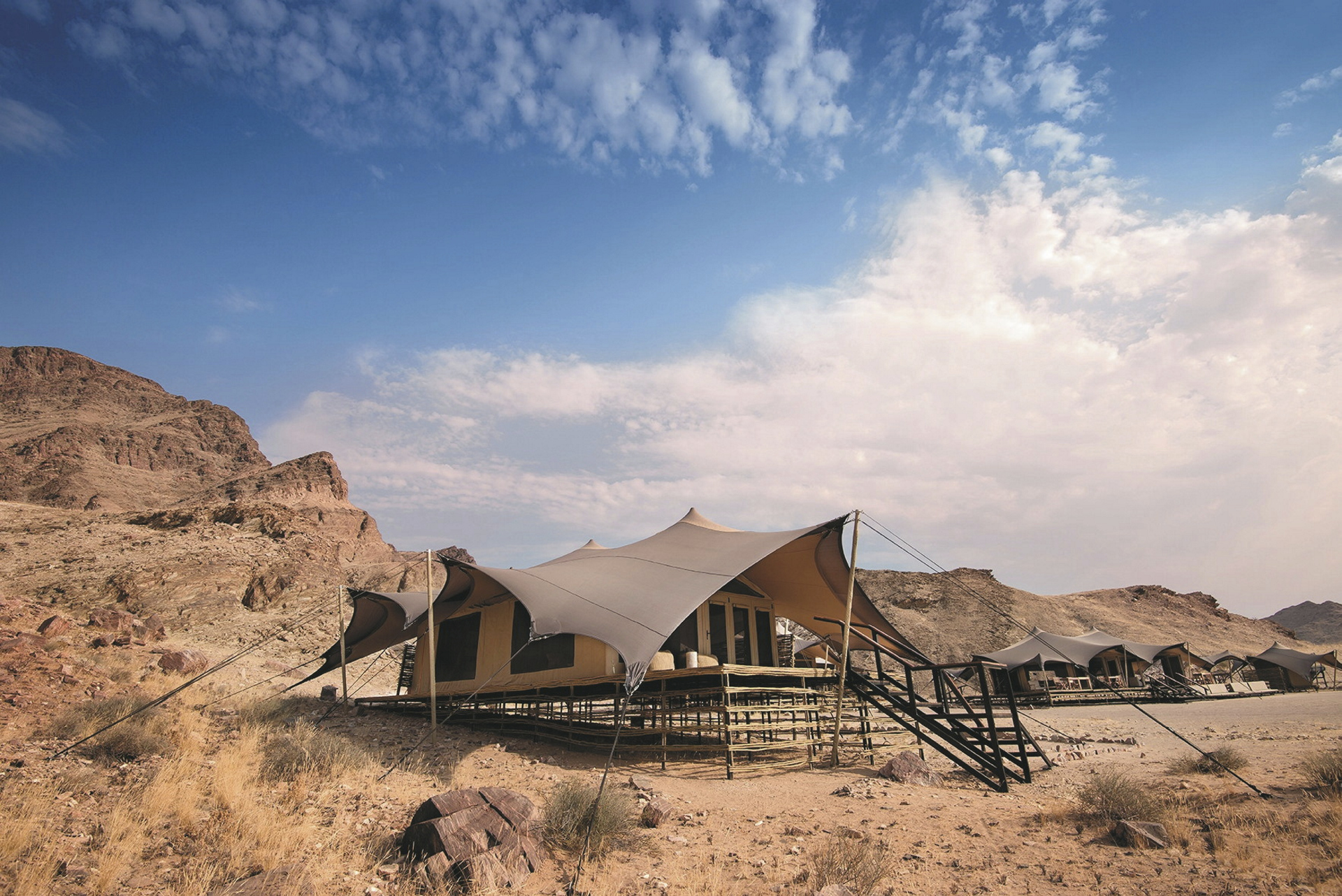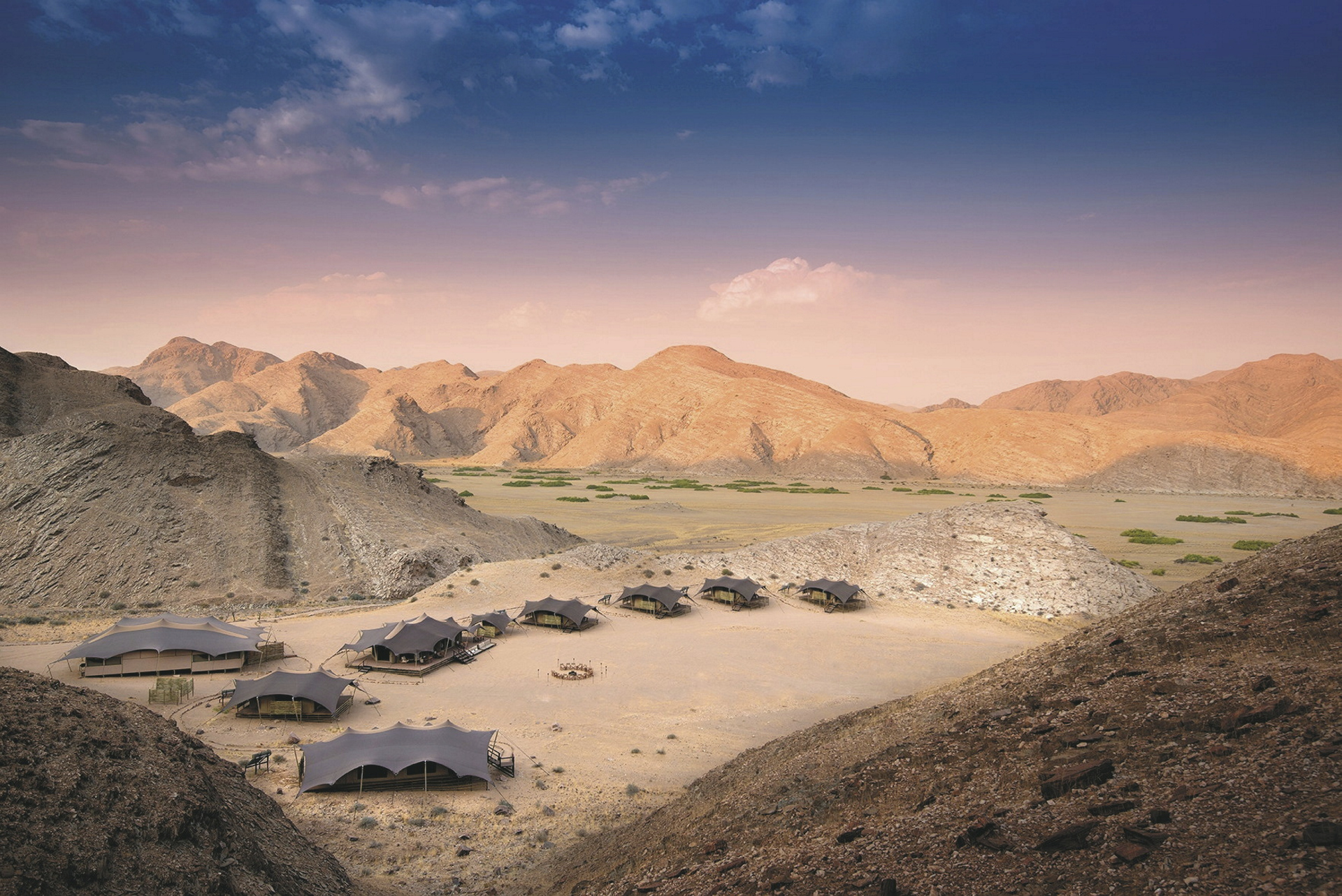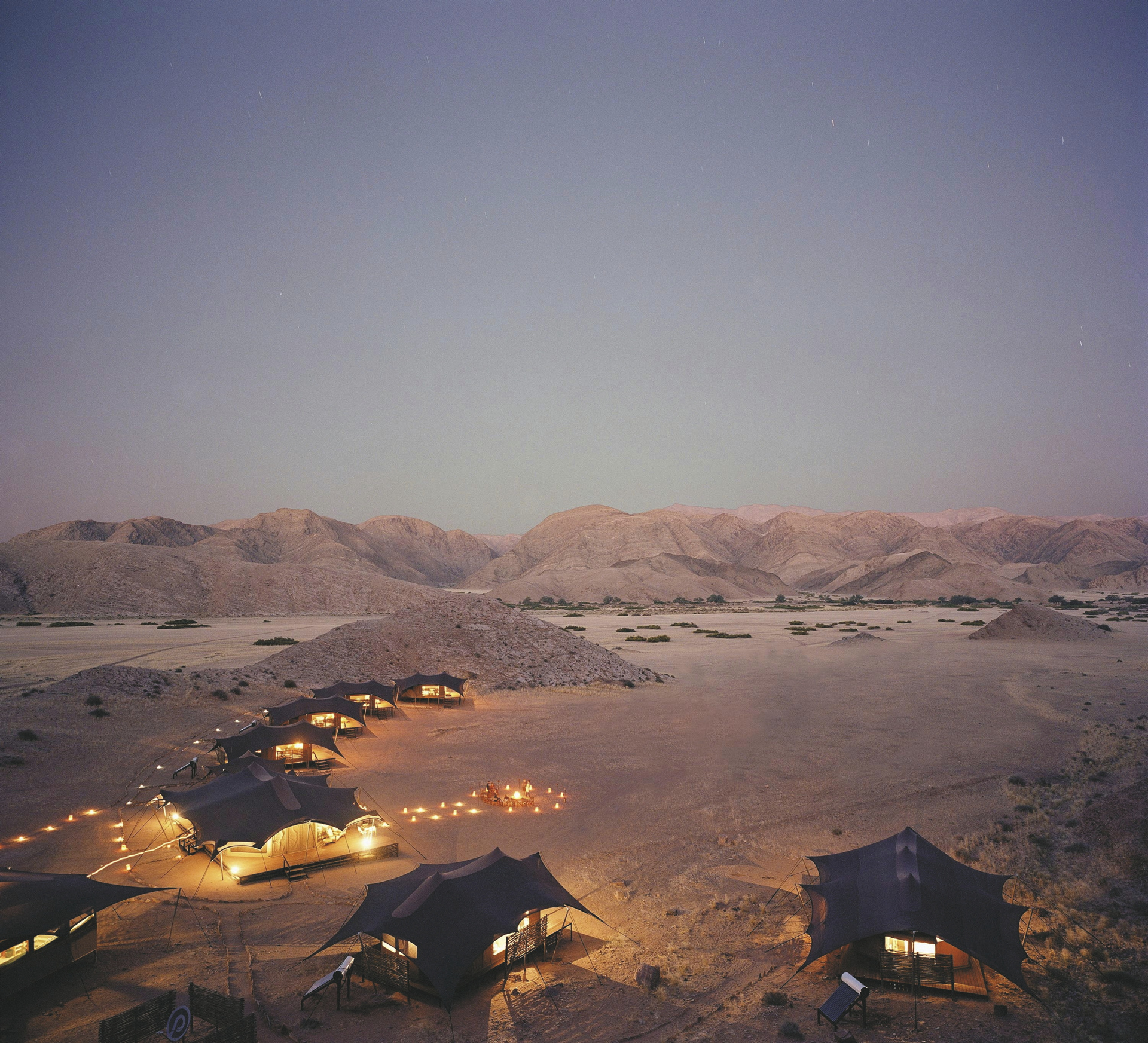 Das gesamte Camp ist ein sauberer und grüner Ort, der praktisch keinen Fußabdruck in diesem empfindlichen Ökosystem hinterlässt. Es wird vollständig mit Solarenergie betrieben, um die Kohlenstoffemissionen so gering wie möglich zu halten. Das große Hauptzelt dient als Speisezimmer, aber auch als Bar oder Loungebereich, auf der vorgelagerten Terrasse werden bei gutem Wetter die Mahlzeiten eingenommen. Den Sternenhimmel bestaunt man am Abend von der Feuerstelle aus, ein kleiner Pool bietet an heißen Tagen Abkühlung. Eingeschlossene Aktivitäten: geführte Wanderung, Nashorn Tracking, kulturelle Begegnung mit dem Volk der Himba oder Herero, Pirschfahrt, Besuch beim Giraffen-Forschungsprogramm.
