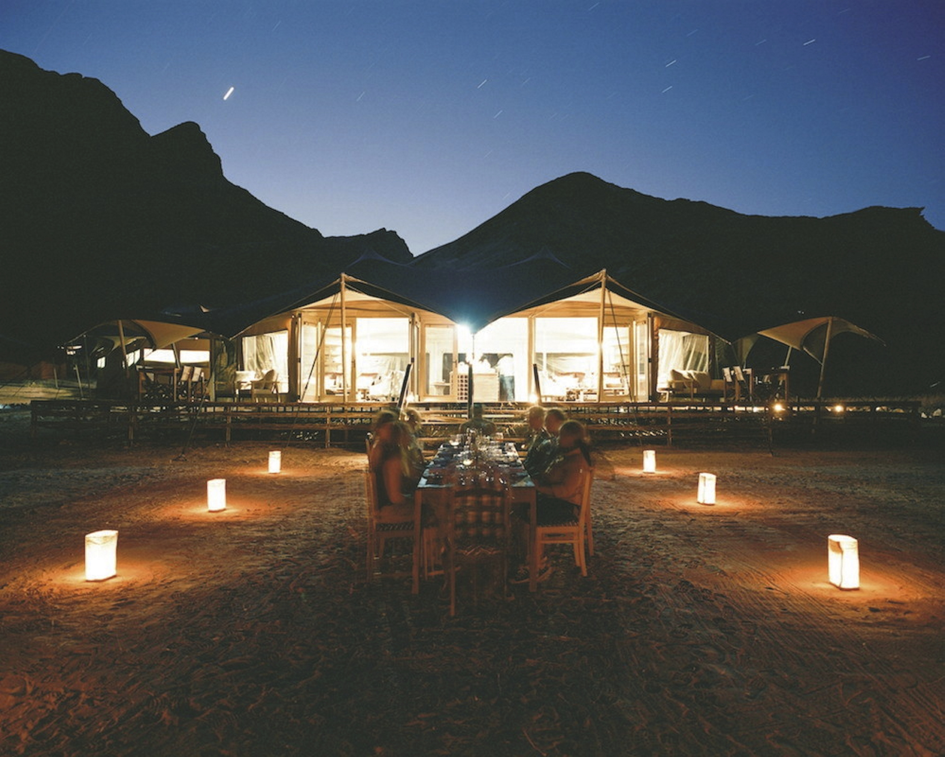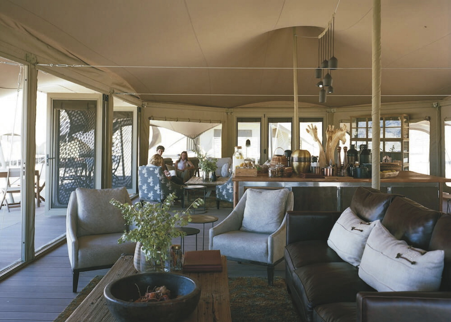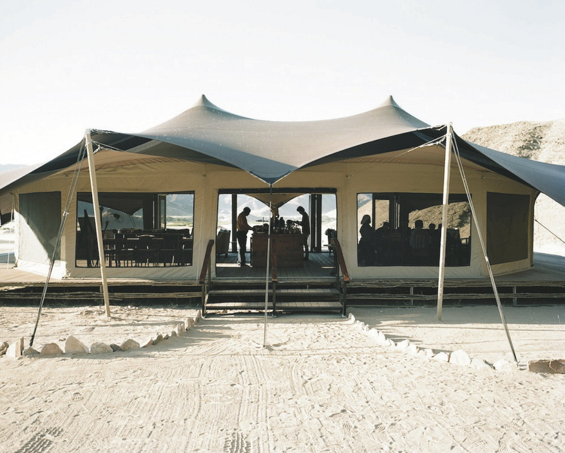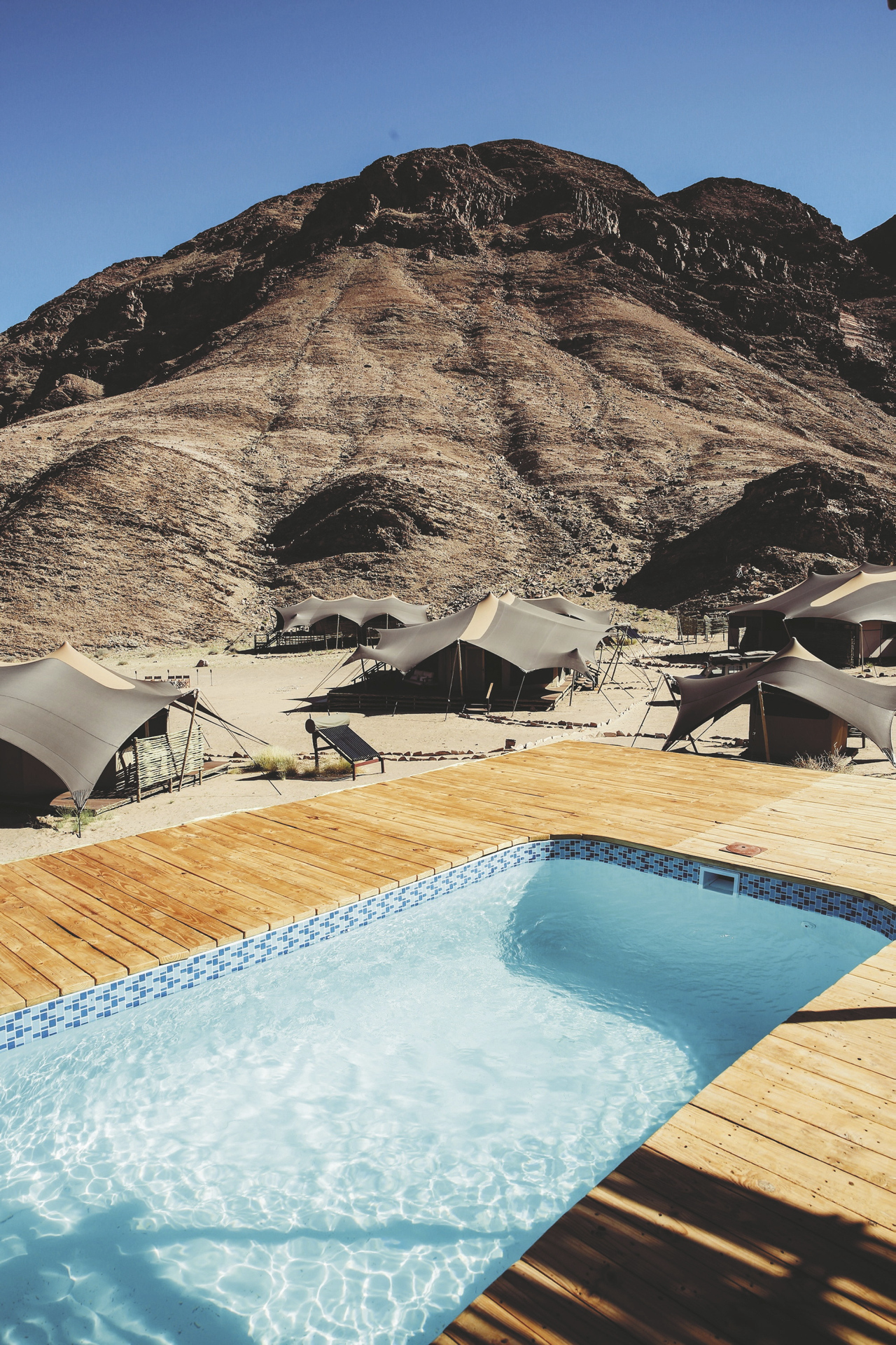 Das gesamte Camp ist ein sauberer und grüner Ort, der praktisch keinen Fußabdruck in diesem empfindlichen Ökosystem hinterlässt. Es wird vollständig mit Solarenergie betrieben, um die Kohlenstoffemissionen so gering wie möglich zu halten. Das große Hauptzelt dient als Speisezimmer, aber auch als Bar oder Loungebereich, auf der vorgelagerten Terrasse werden bei gutem Wetter die Mahlzeiten eingenommen. Den Sternenhimmel bestaunt man am Abend von der Feuerstelle aus, ein kleiner Pool bietet an heißen Tagen Abkühlung. Eingeschlossene Aktivitäten: geführte Wanderung, Nashorn Tracking, kulturelle Begegnung mit dem Volk der Himba oder Herero, Pirschfahrt, Besuch beim Giraffen-Forschungsprogramm.
