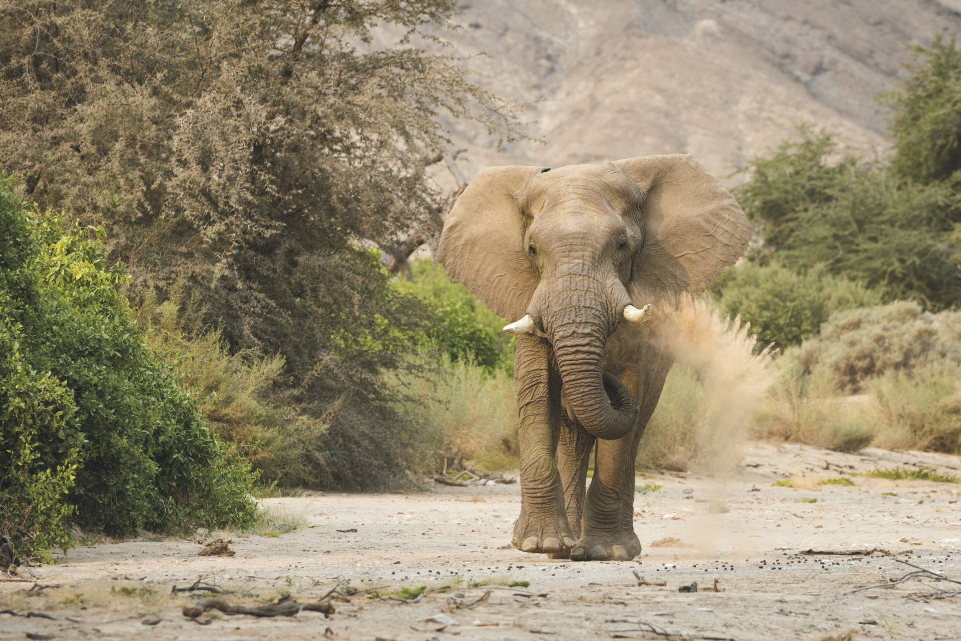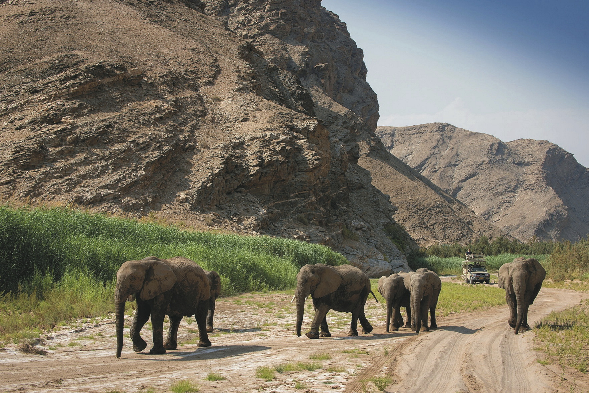 Tief im Nordwesten Namibias liegt das Kaokoland, eines der abgelegensten, wildesten und wunderbarsten Gebiete des Landes. Geprägt von sanften Dünen, felsigen Bergen und Wüstenebenen, die von alten, trockenen Flussbetten, den Straßen der Region, durchzogen sind. Provisorische Himba-Siedlungen durchziehen die Landschaft, und verstreute Herden von an die Wüste angepassten Elefanten und Giraffen sind ein häufiger Anblick.