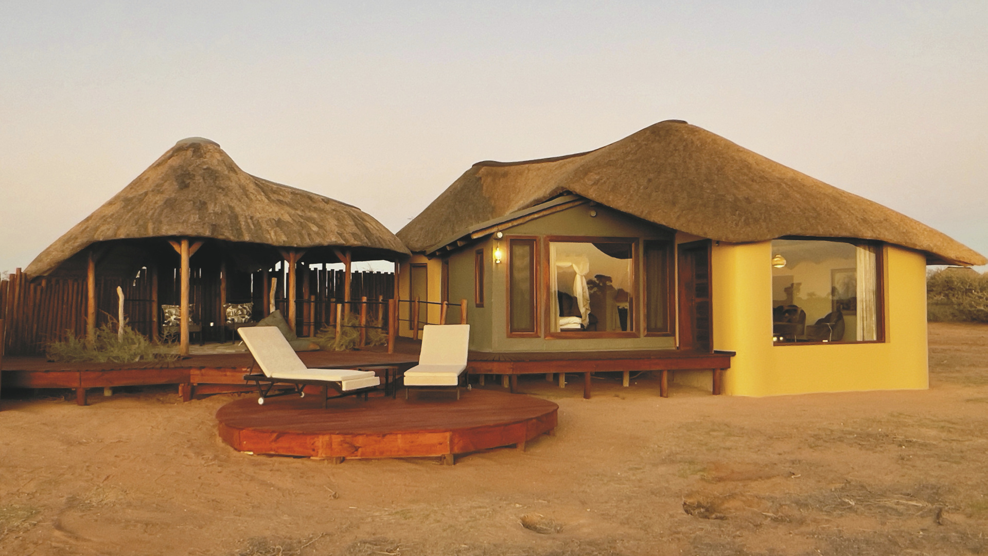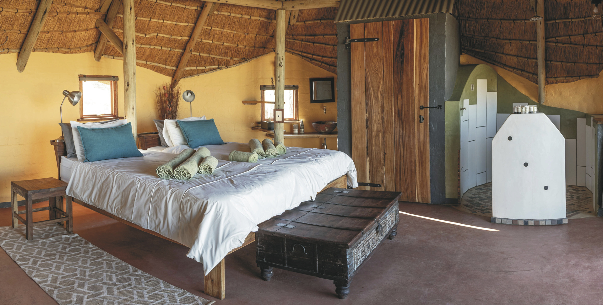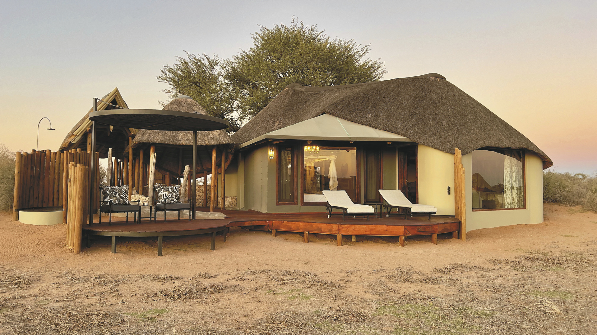 Die 11 großzügigen, riedgedeckten Chalets sind hochmodern und doch sehr afrikanisch. Sie bieten viel Privatsphäre, über Holzstege erreicht man das Haupthaus. Alle Chalets verfügen natürlich über ein eigenes Bad mit Außendusche, große Panoramafenster, die einen traumhaften Blick auf die Landschaft gewähren, einen großen Loungebereich, Moskitonetz, Fön, Tee-/Kaffeezubereiter, Klimaanlage, Safe, Kühlschrank und eine überdachte Terrasse. Ein Chalet ist mit 2 Schlafzimmern perfekt für Familien geeignet.Das Superior-Chalet ist deutlich größer, Hauptaugenmerk ist sicherlich der tolle Außenbereich mit eigenem Plunge Pool und geräumiger Terrasse. Der Raumzuschnitt ist weitläufig und darauf ausgelegt, von 3 verschiedenen Ebenen Blickachsen zu erleben. Große Fenster ermöglichen ein Naturerlebnis im Vlei, das Beobachten der Tiere an der nahe gelegenen Wasserstelle und den Ausblick in die afrikanische Savannenlandschaft der Kalahari. Edel und modern ausgestattet ist dieses Haus eine Klasse für sich.
