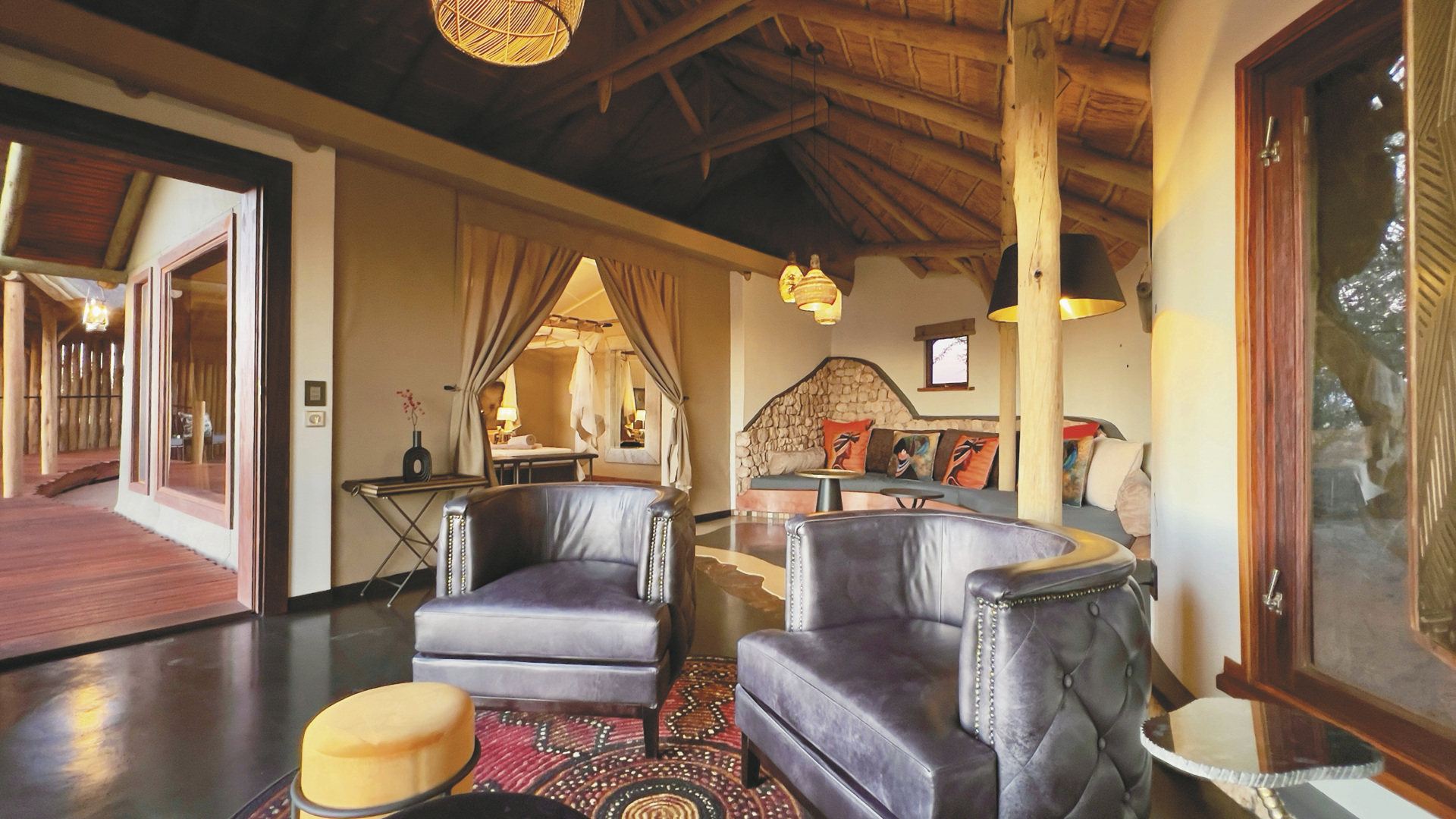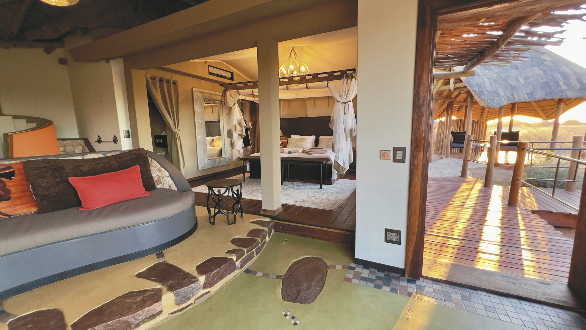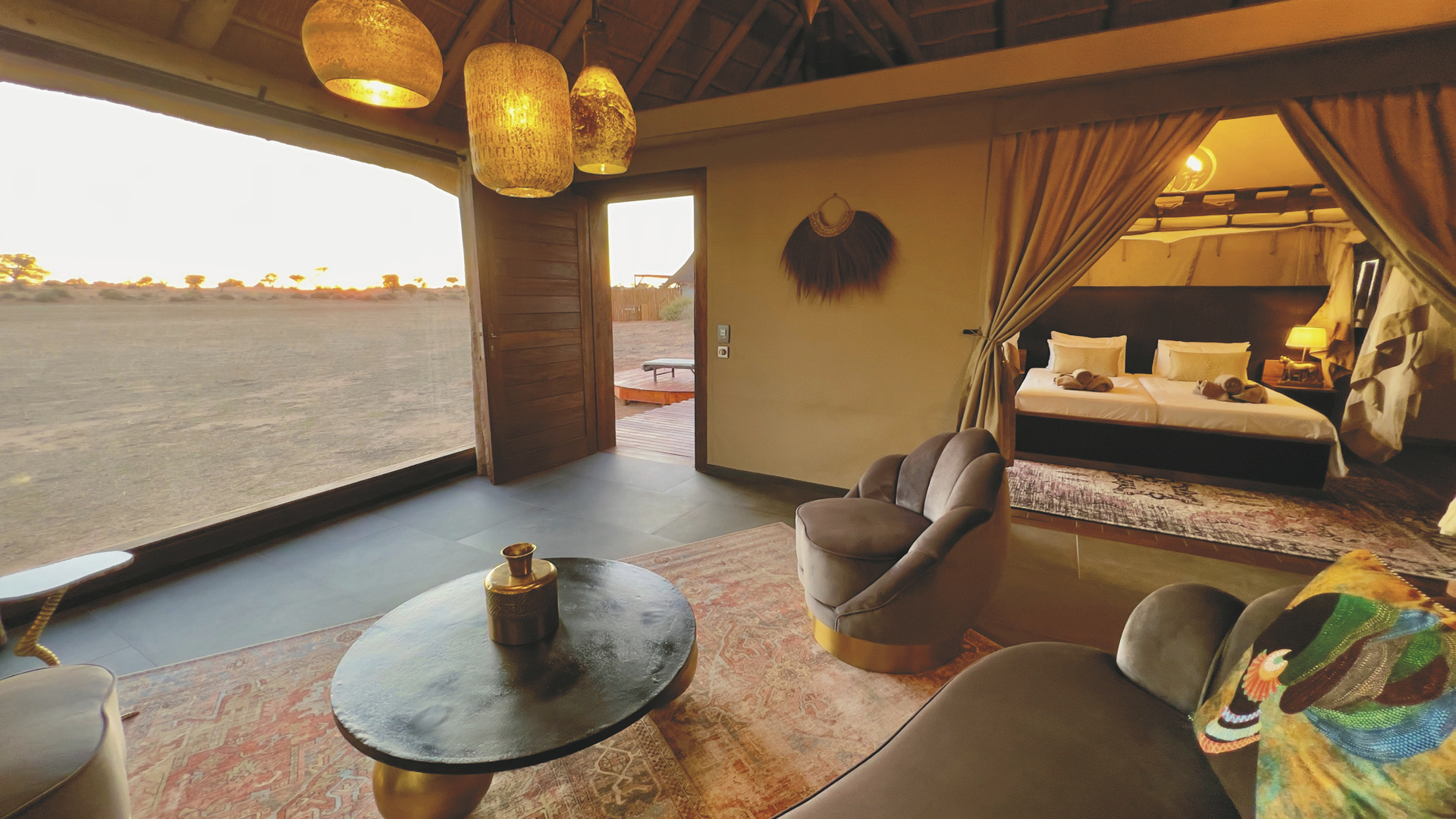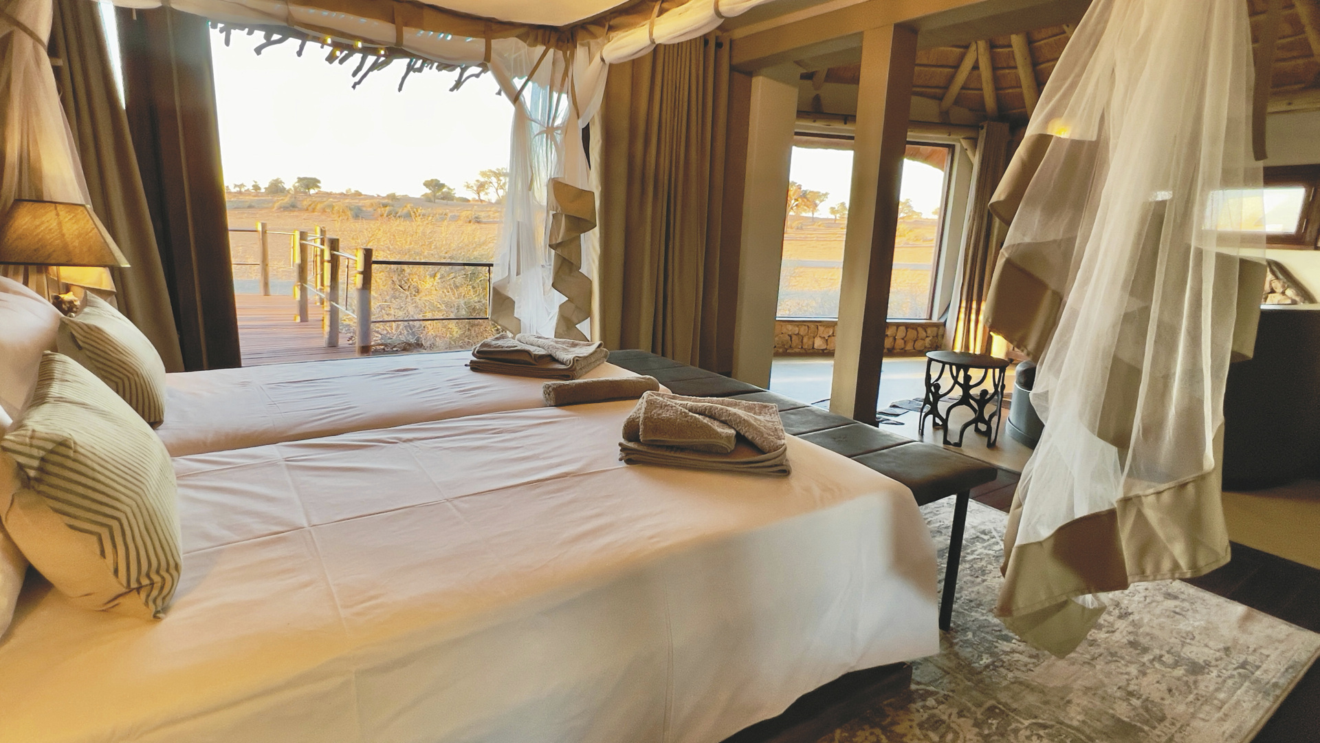 Die 11 großzügigen, riedgedeckten Chalets sind hochmodern und doch sehr afrikanisch. Sie bieten viel Privatsphäre, über Holzstege erreicht man das Haupthaus. Alle Chalets verfügen natürlich über ein eigenes Bad mit Außendusche, große Panoramafenster, die einen traumhaften Blick auf die Landschaft gewähren, einen großen Loungebereich, Moskitonetz, Fön, Tee-/Kaffeezubereiter, Klimaanlage, Safe, Kühlschrank und eine überdachte Terrasse. Ein Chalet ist mit 2 Schlafzimmern perfekt für Familien geeignet.Das Superior-Chalet ist deutlich größer, Hauptaugenmerk ist sicherlich der tolle Außenbereich mit eigenem Plunge Pool und geräumiger Terrasse. Der Raumzuschnitt ist weitläufig und darauf ausgelegt, von 3 verschiedenen Ebenen Blickachsen zu erleben. Große Fenster ermöglichen ein Naturerlebnis im Vlei, das Beobachten der Tiere an der nahe gelegenen Wasserstelle und den Ausblick in die afrikanische Savannenlandschaft der Kalahari. Edel und modern ausgestattet ist dieses Haus eine Klasse für sich.