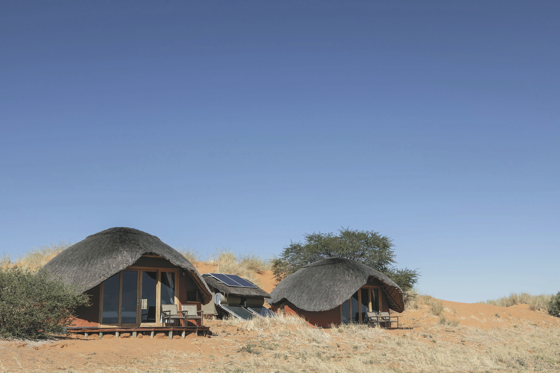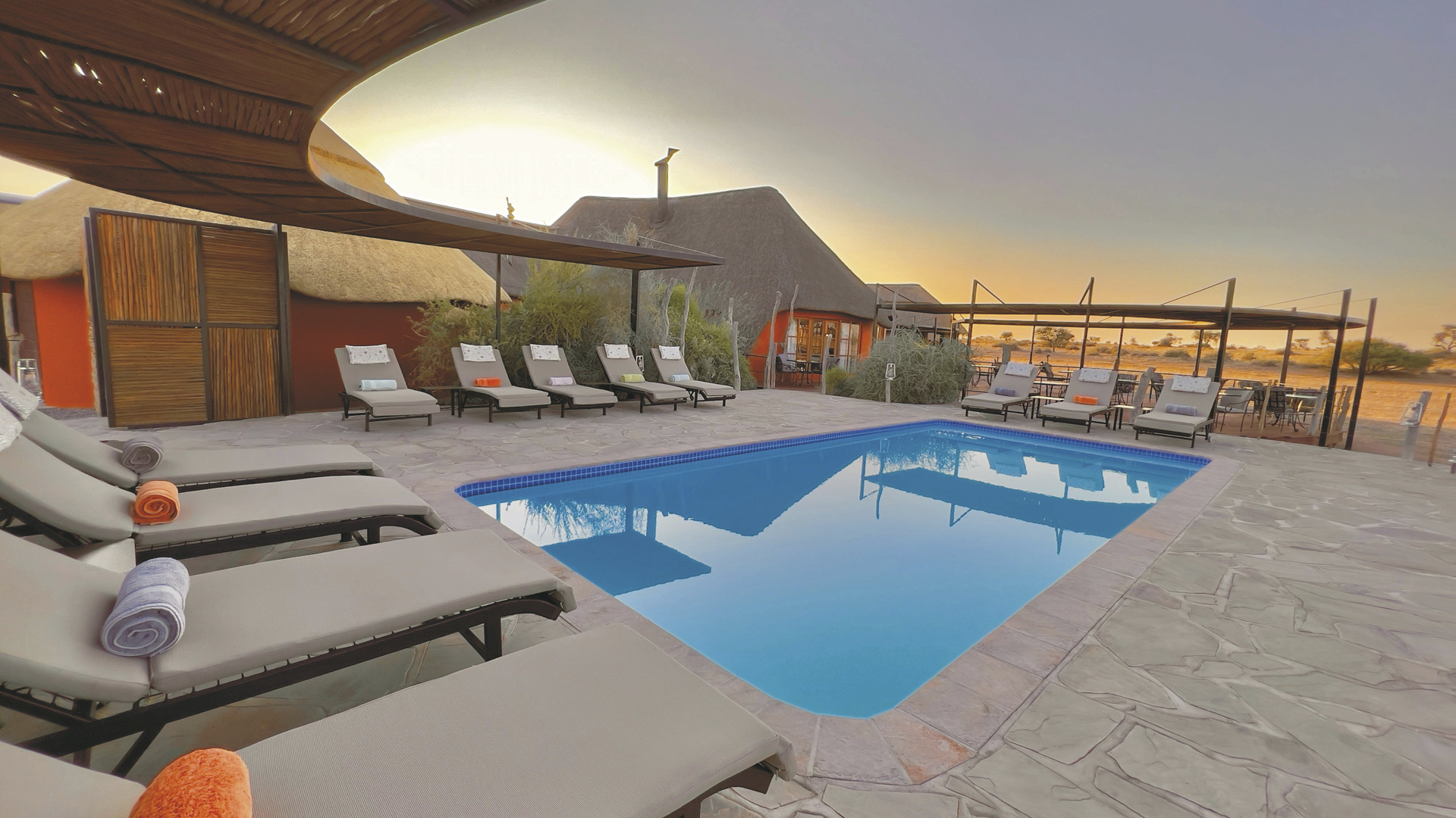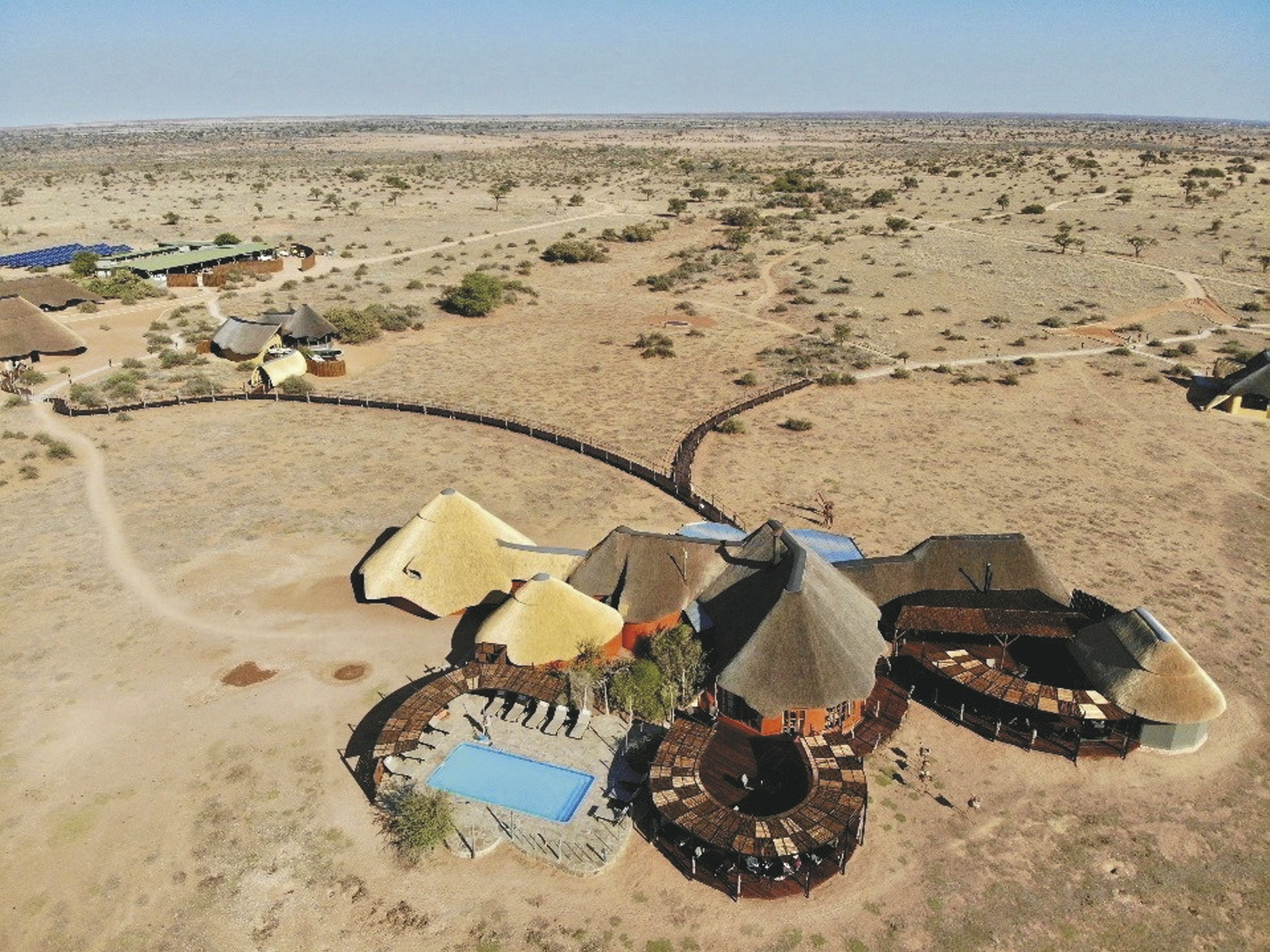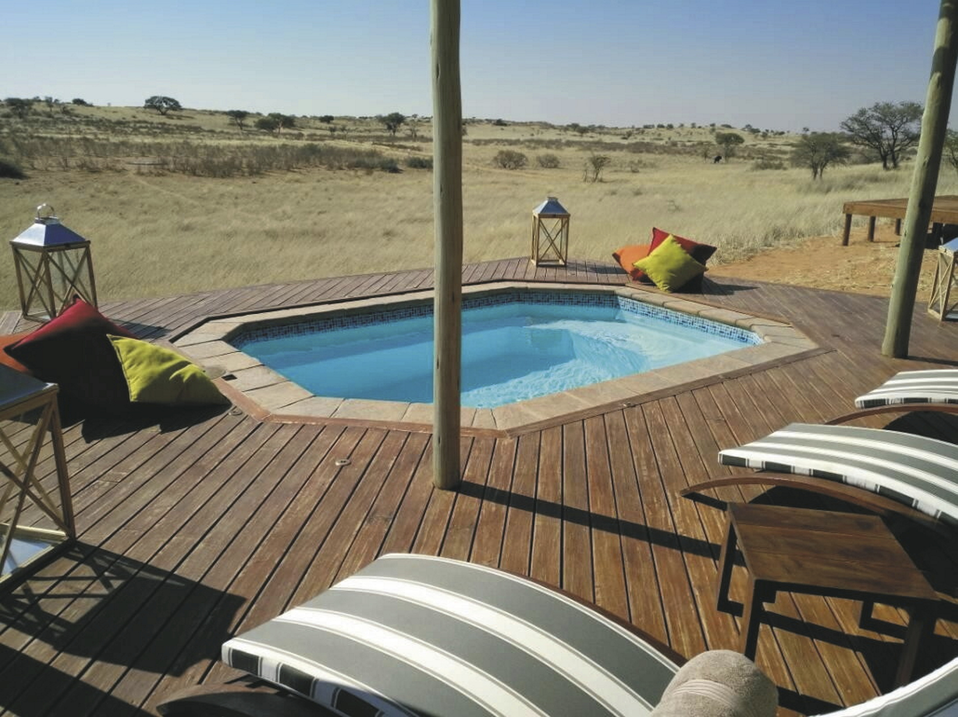 Inmitten der sanften Dünen der Kalahari liegt diese Oase. Der Hauptbereich liegt in der Mitte eines Vleis, einem flachen ausgetrocknetem See, und ist über einen Holzsteg zu erreichen. Hier befinden sich das stilvolle Restaurant mit Kamin und großer Aussichtsterrasse, die Bar und eine Lounge mit kostenlosem WLAN. Ein Pool mit Sonnenterrasse lädt zum Entspannen ein. Noch mehr Entspannung bietet ein Besuch im Spa. Optionale Aktivitäten: markierte Wanderwege, geführte Wanderungen, Pirsch-/Panoramafahrten, Mountainbike und Fatbike-Verleih. Eine tolle Möglichkeit die Kalahari mit allen Sinnen zu erleben ist die 3-tägige geführte Trans-Kalahari-Wanderung mit einer Übernachtung in der Lodge und einer Übernachtung im einsam gelegenen Dünencamp (für max. 4 Pers.).