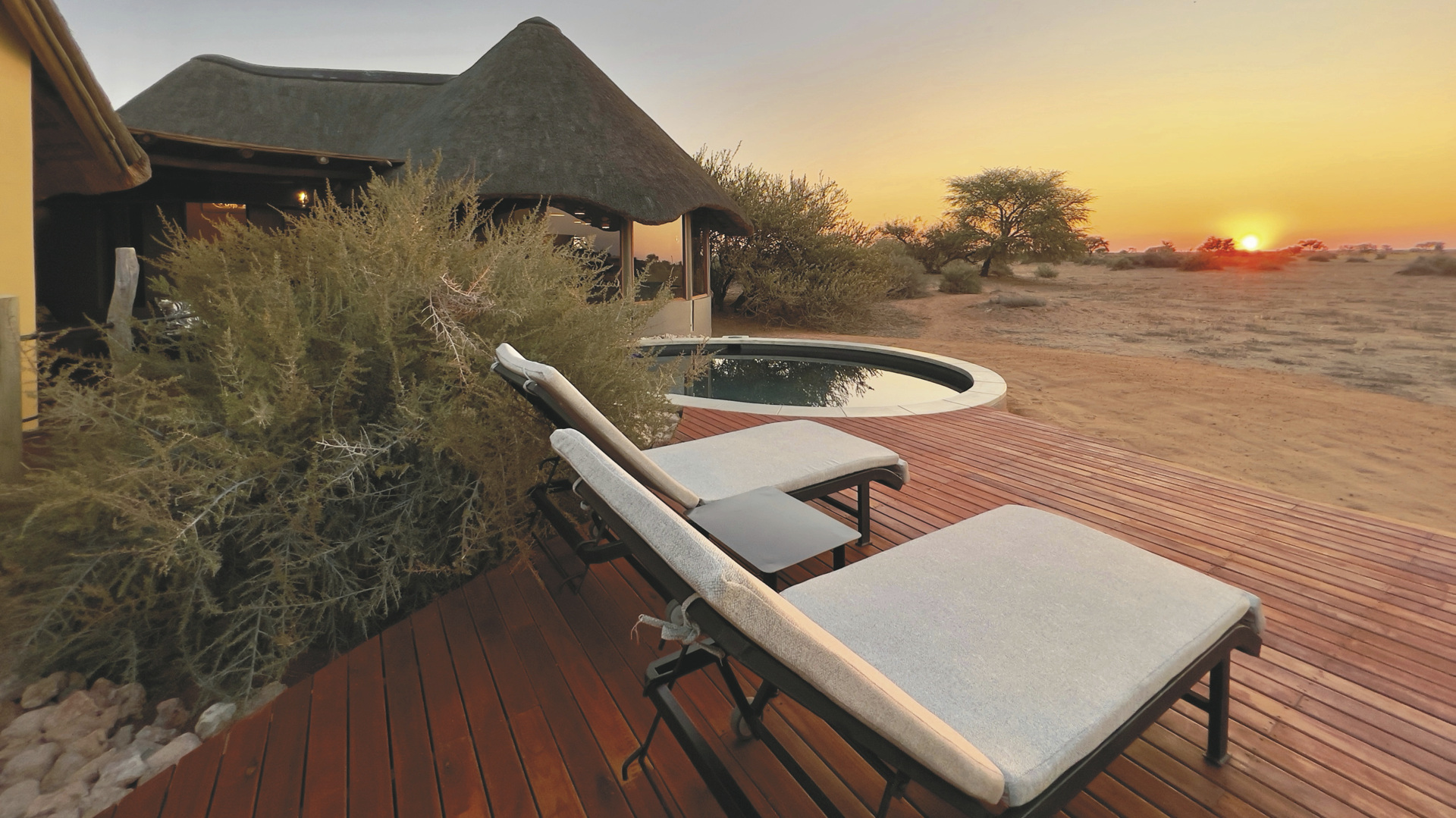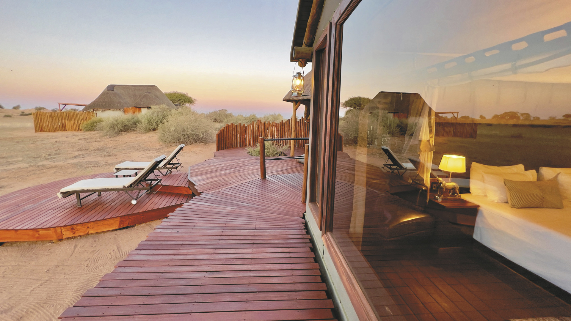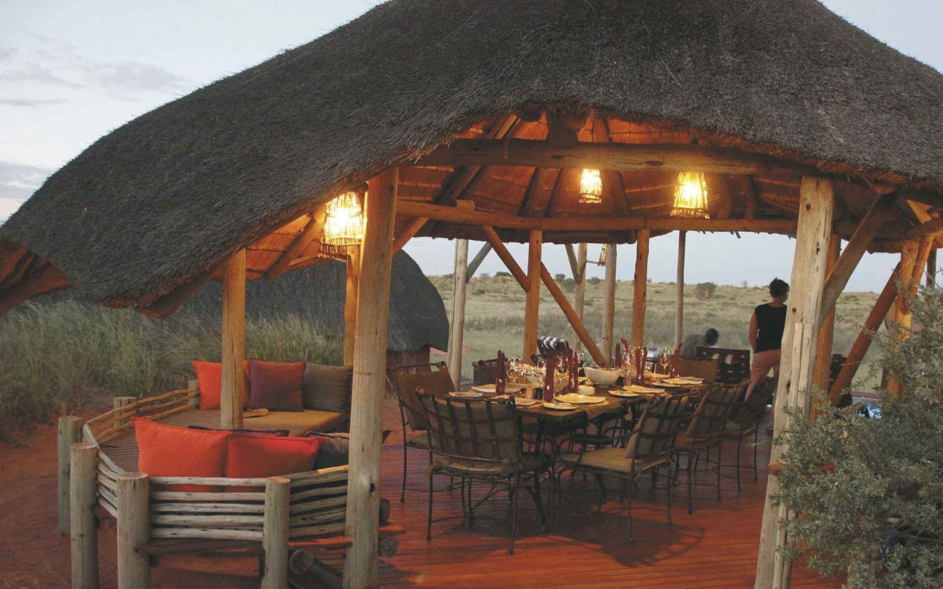 Inmitten der sanften Dünen der Kalahari liegt diese Oase. Der Hauptbereich liegt in der Mitte eines Vleis, einem flachen ausgetrocknetem See, und ist über einen Holzsteg zu erreichen. Hier befinden sich das stilvolle Restaurant mit Kamin und großer Aussichtsterrasse, die Bar und eine Lounge mit kostenlosem WLAN. Ein Pool mit Sonnenterrasse lädt zum Entspannen ein. Noch mehr Entspannung bietet ein Besuch im Spa. Optionale Aktivitäten: markierte Wanderwege, geführte Wanderungen, Pirsch-/Panoramafahrten, Mountainbike und Fatbike-Verleih. Eine tolle Möglichkeit die Kalahari mit allen Sinnen zu erleben ist die 3-tägige geführte Trans-Kalahari-Wanderung mit einer Übernachtung in der Lodge und einer Übernachtung im einsam gelegenen Dünencamp (für max. 4 Pers.).