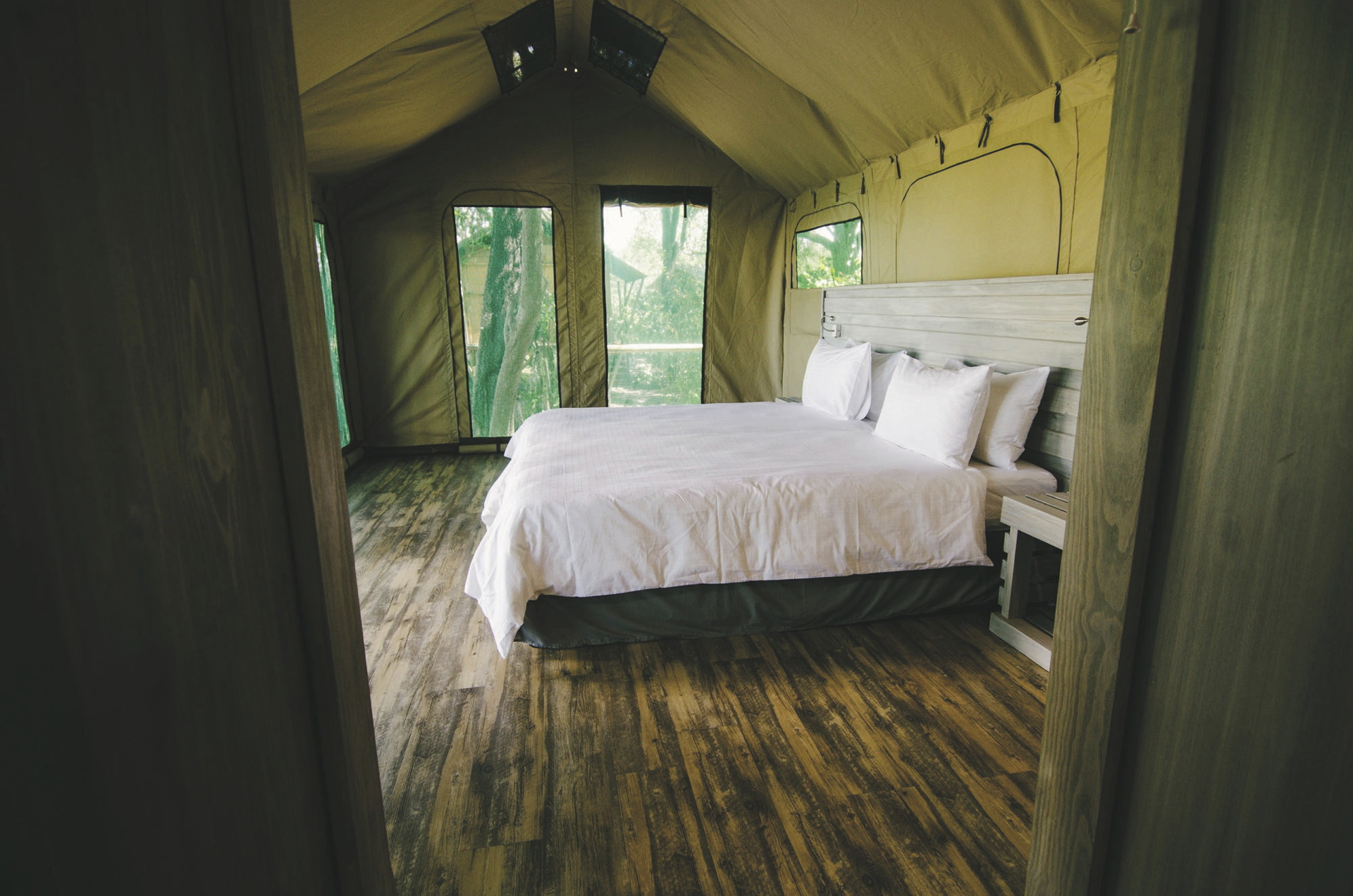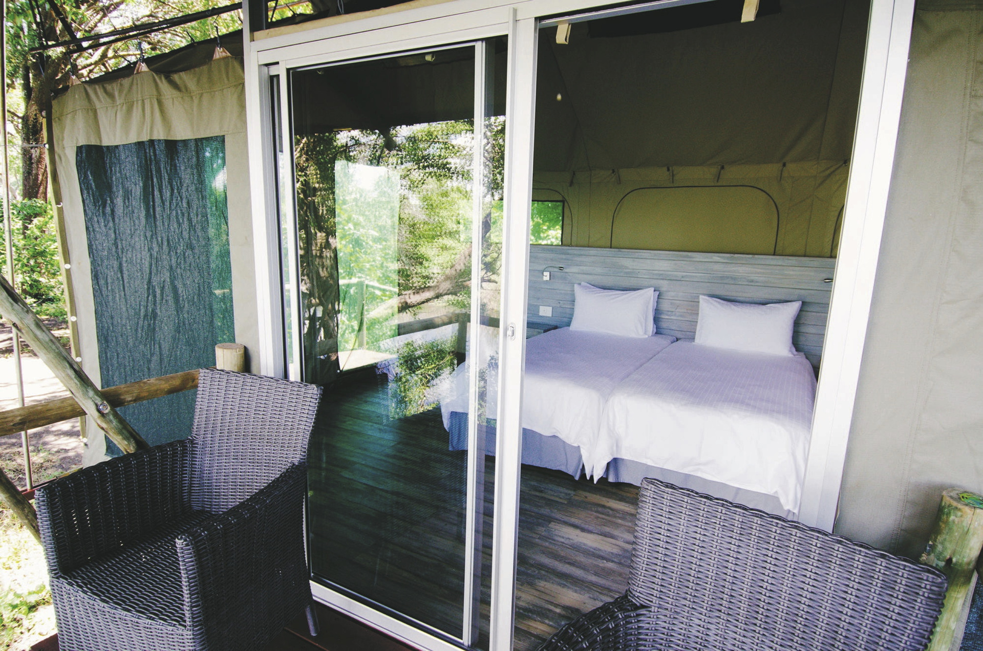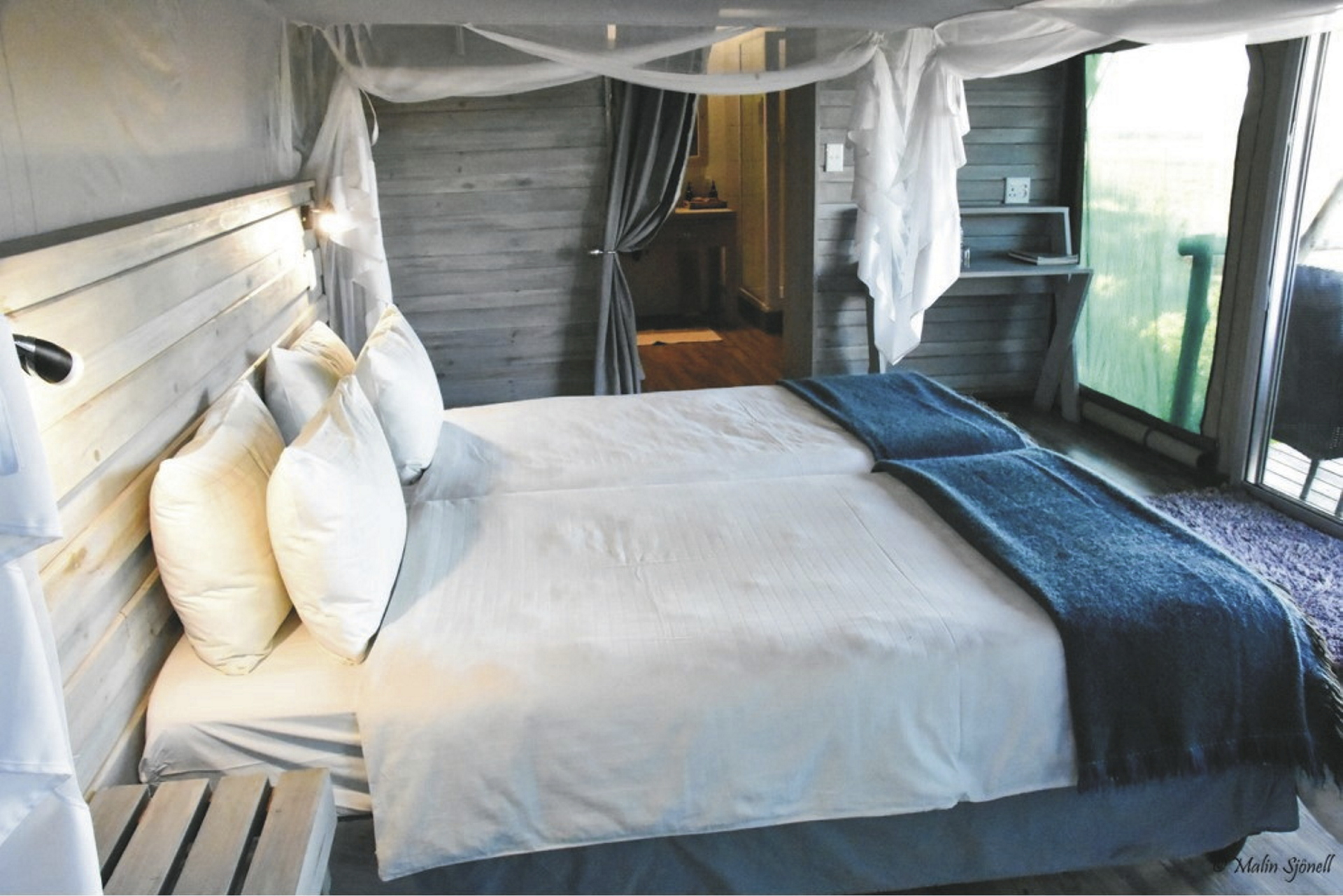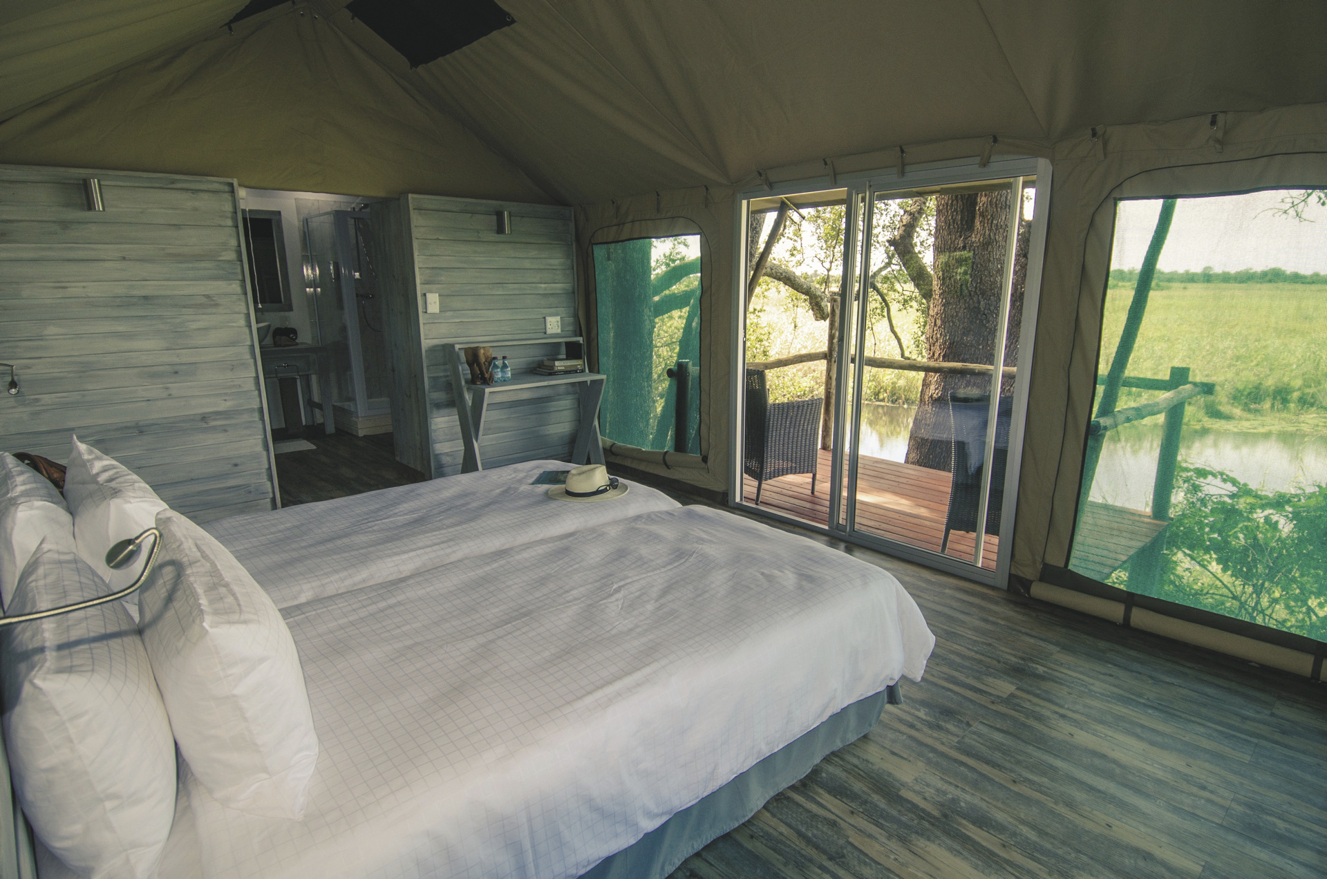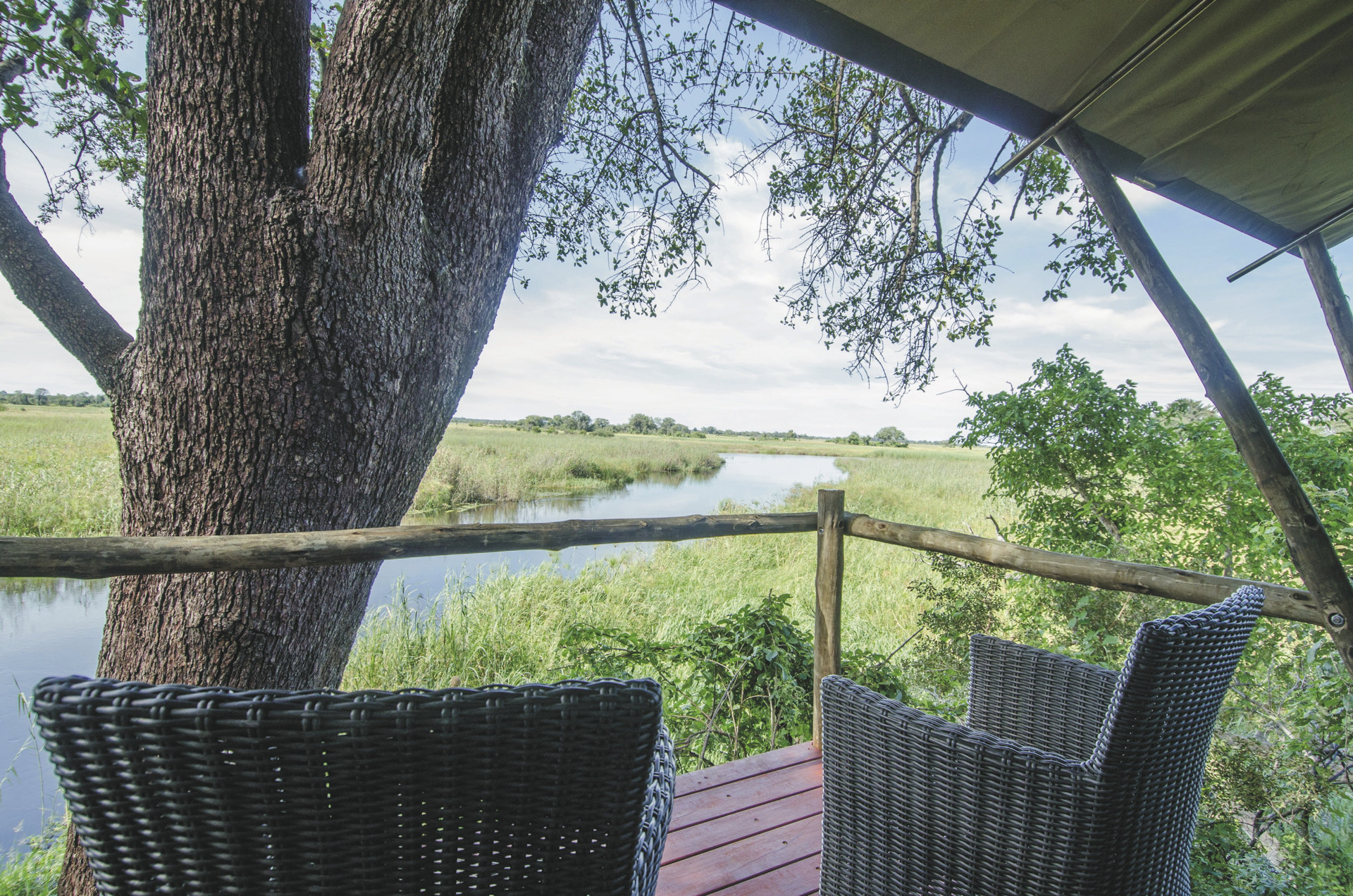 Die 13 auf erhöhten Holzplattformen errichteten Safarizelte sind großzügig und geschmackvoll, hell eingerichtet. Sie haben ein geräumiges Bad, Moskitonetze, Fön, Ventilator und einen Safe. Vom Bett und der Terrasse haben Sie einen tollen Blick über den Kwando Fluss.