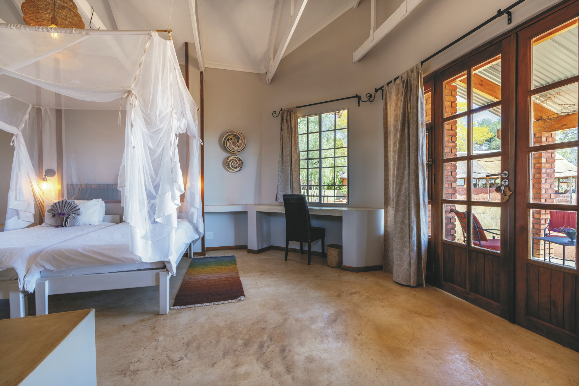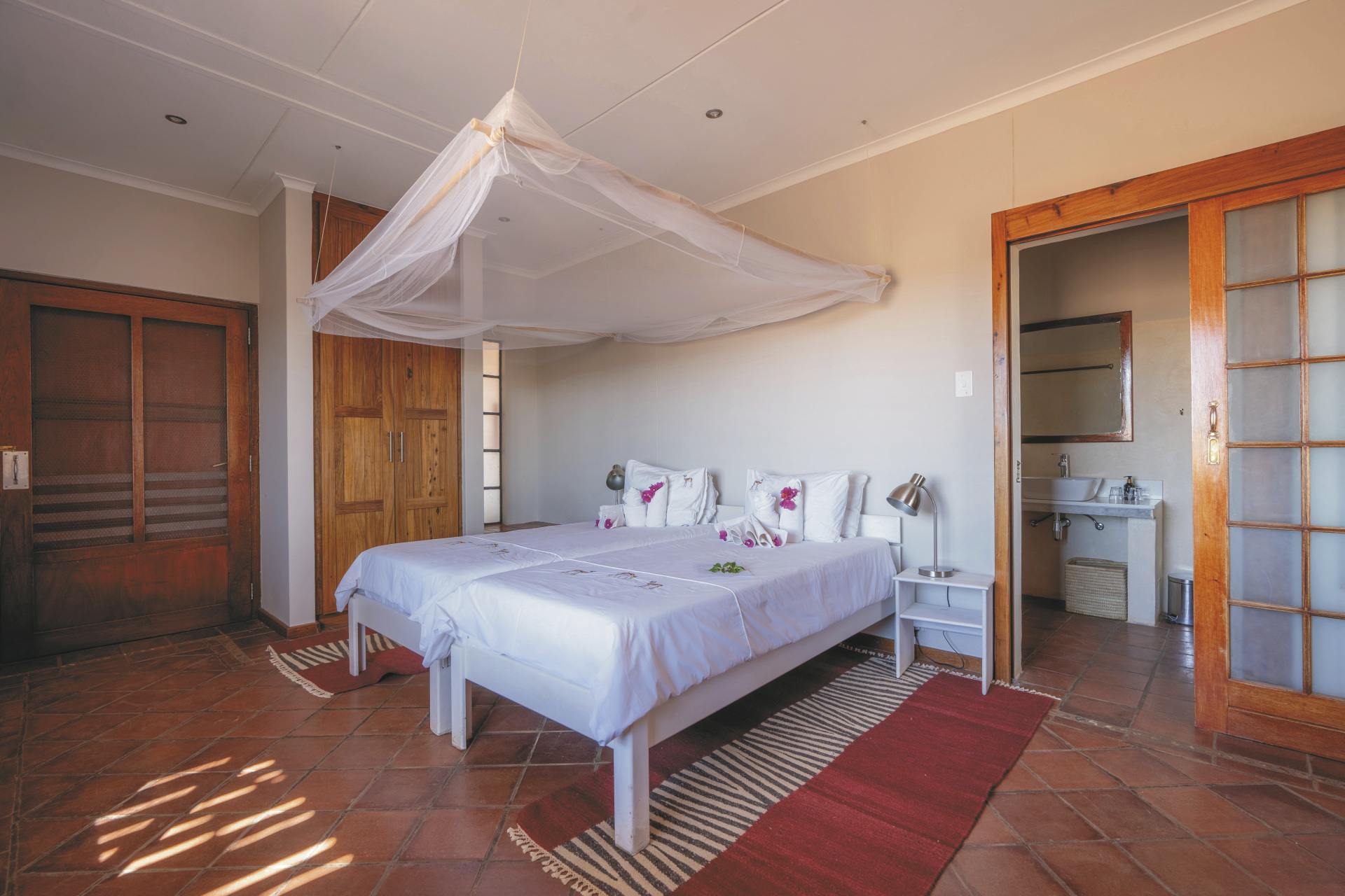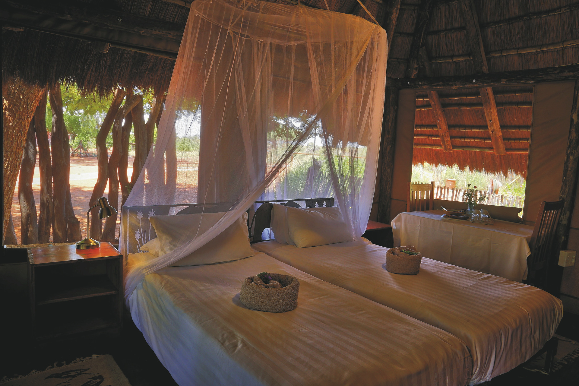 Alle Unterkünfte sind in erdigen Farben mit einem Hauch von ethnischem Schick eingerichtet und bieten eine gelungene Mischung aus afrikanischem Flair und modernem Komfort. Es gibt 13 stilvolle Standardzimmer, 2 freistehende Chalets mit einem dritten Bett – ideal für Familien, sowie 2 rustikale Komfortzelte. Alle mit eigenem Bad und separatem WC und einem Safe. Die Chalets und Standardzimmer verfügen über eine Klimaanlage und eine Terrasse, die Komfortzelte über einen Ventilator. Familien mit 2 Kindern können in den Chalets untergebracht werden.