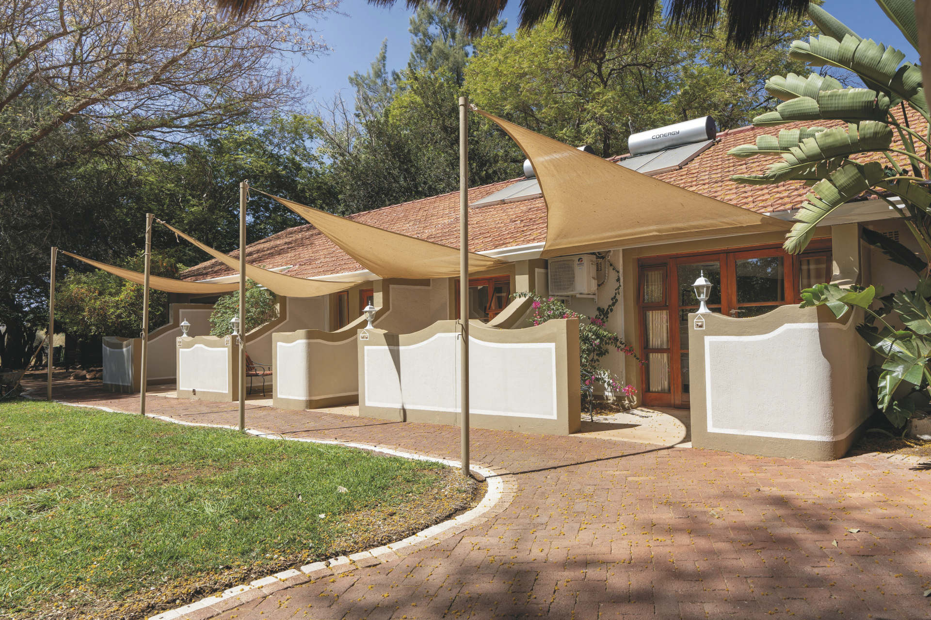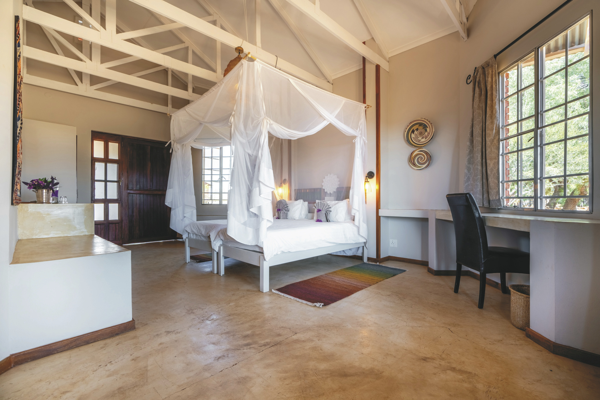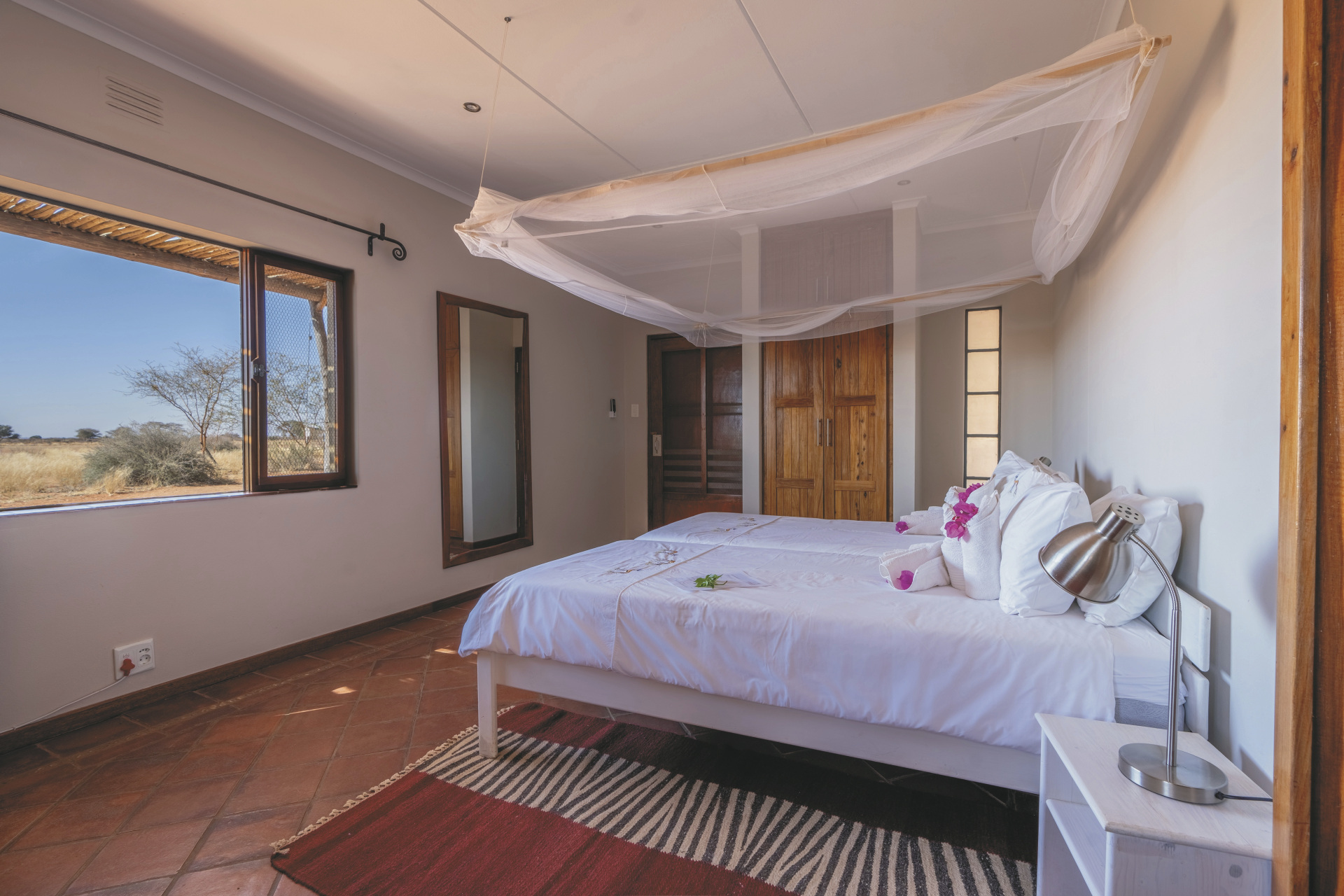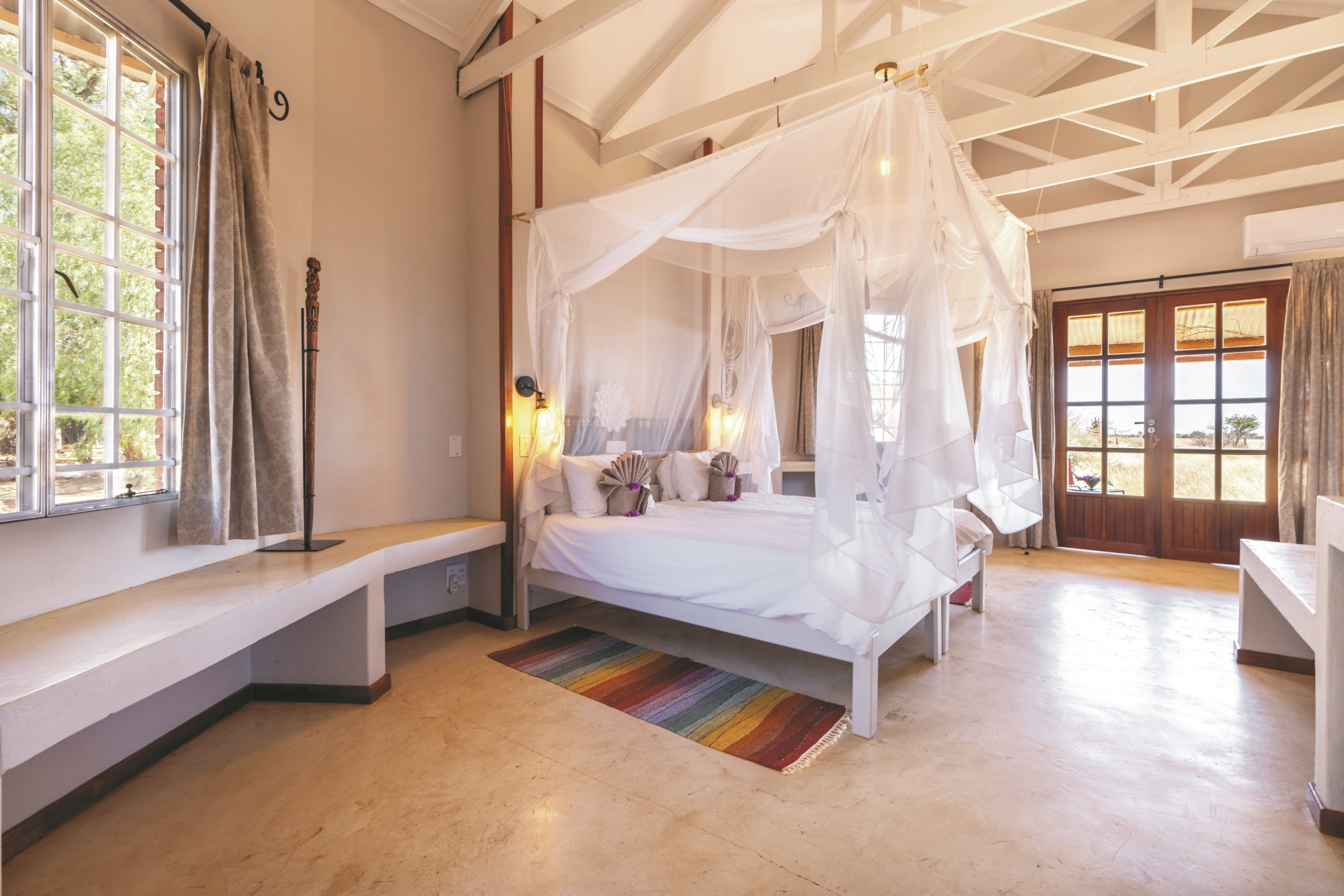 Alle Unterkünfte sind in erdigen Farben mit einem Hauch von ethnischem Schick eingerichtet und bieten eine gelungene Mischung aus afrikanischem Flair und modernem Komfort. Es gibt 13 stilvolle Standardzimmer, 2 freistehende Chalets mit einem dritten Bett – ideal für Familien, sowie 2 rustikale Komfortzelte. Alle mit eigenem Bad und separatem WC und einem Safe. Die Chalets und Standardzimmer verfügen über eine Klimaanlage und eine Terrasse, die Komfortzelte über einen Ventilator. Familien mit 2 Kindern können in den Chalets untergebracht werden.