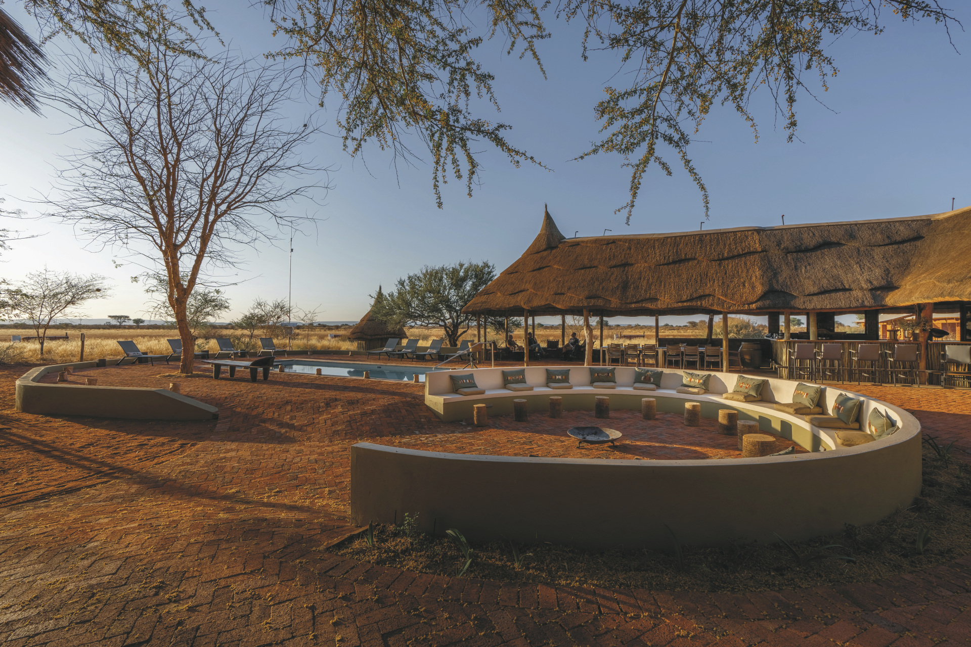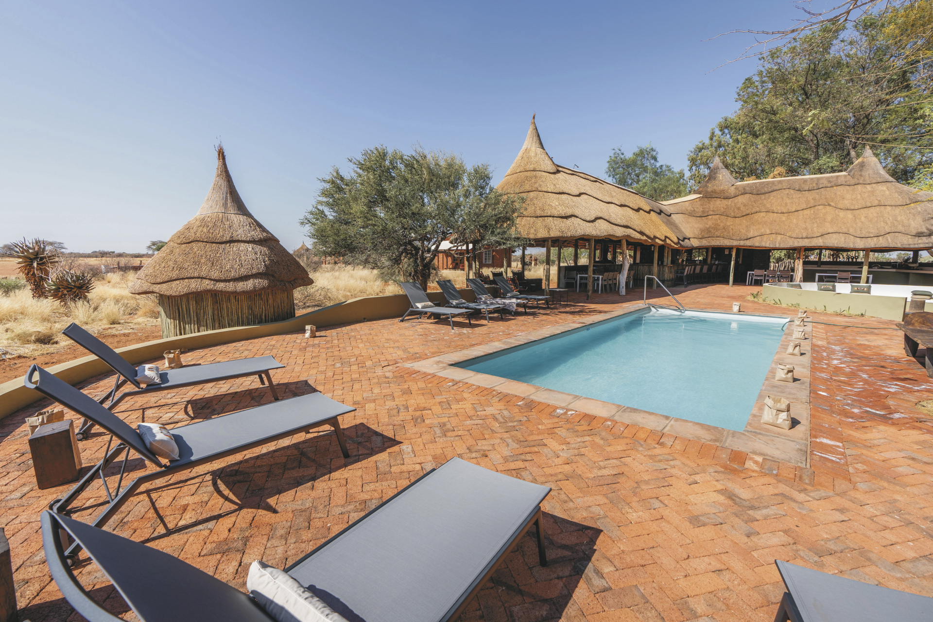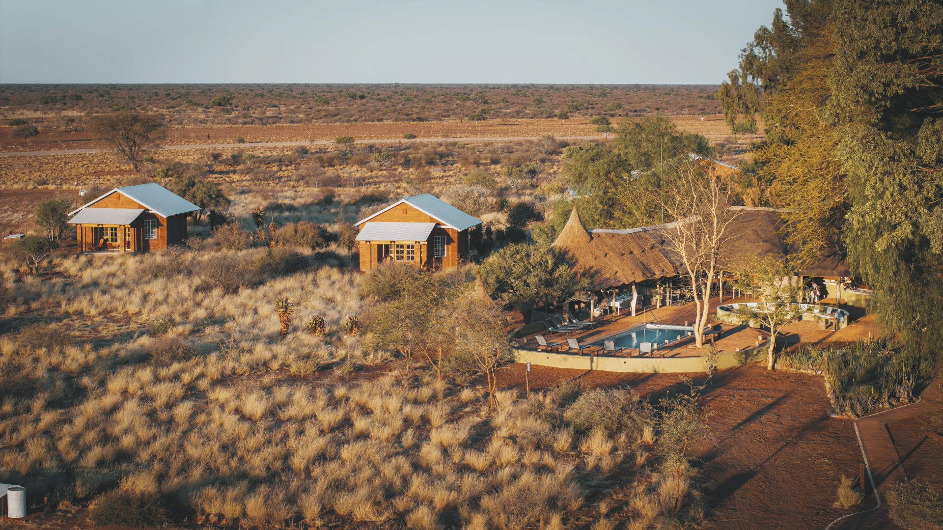 Die individuelle, liebevoll gestaltete Gästefarm empfängt Sie mit einem familiären Ambiente. Der zentrale Mittelpunkt ist die gemütliche Lapa, strohdeckt und offen an den Seiten versprüht sie ein ganz eigenen afrikanischen Charme. Hier ist sowohl die Lounge, als auch die Bar und der Speisebereich untergebracht, kostenloses WLAN finden Sie hier auch. Der erfrischende Pool, umgeben von einer Sonnenterrasse und einheimischen Bäumen, lädt zum Verweilen ein. Das Küchenteam zaubert leckere Gerichte aus der typisch namibischen Farmküche mit Zutaten überwiegend aus eigenem Anbau. Bei gutem Wetter findet das Abendessen unter den Sternen Namibias in der Boma statt. Einzigartig auf der Farm sind die hochmodernen Einrichtungen und optimalen Bedingungen zur Sternenbeobachtung sowie die inspirierenden Kunst- und Handwerksateliers wie die Spinn-, Web- und Schmuckwerkstätten. Optionale Aktivitäten: geführte Wanderungen, geführte E-Bike Touren, Wildbeobachtungsfahrten zum Sonnenuntergang, Sternenbeobachtung unter kundiger Begleitung (von Mai-September), Besichtigung der Werkstätten, Farmführung.