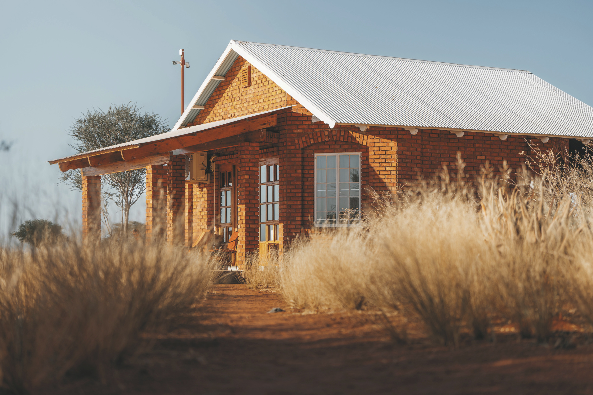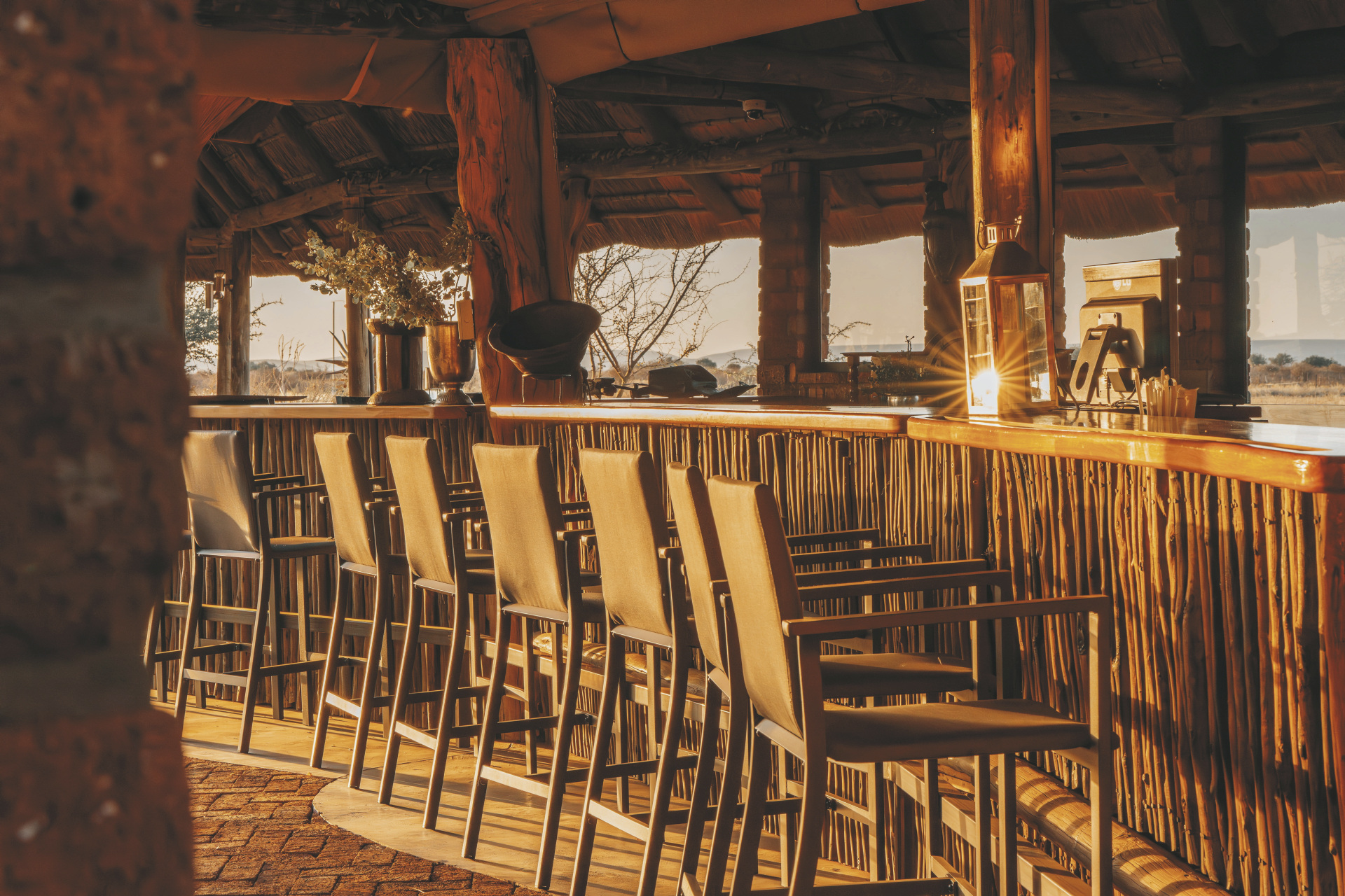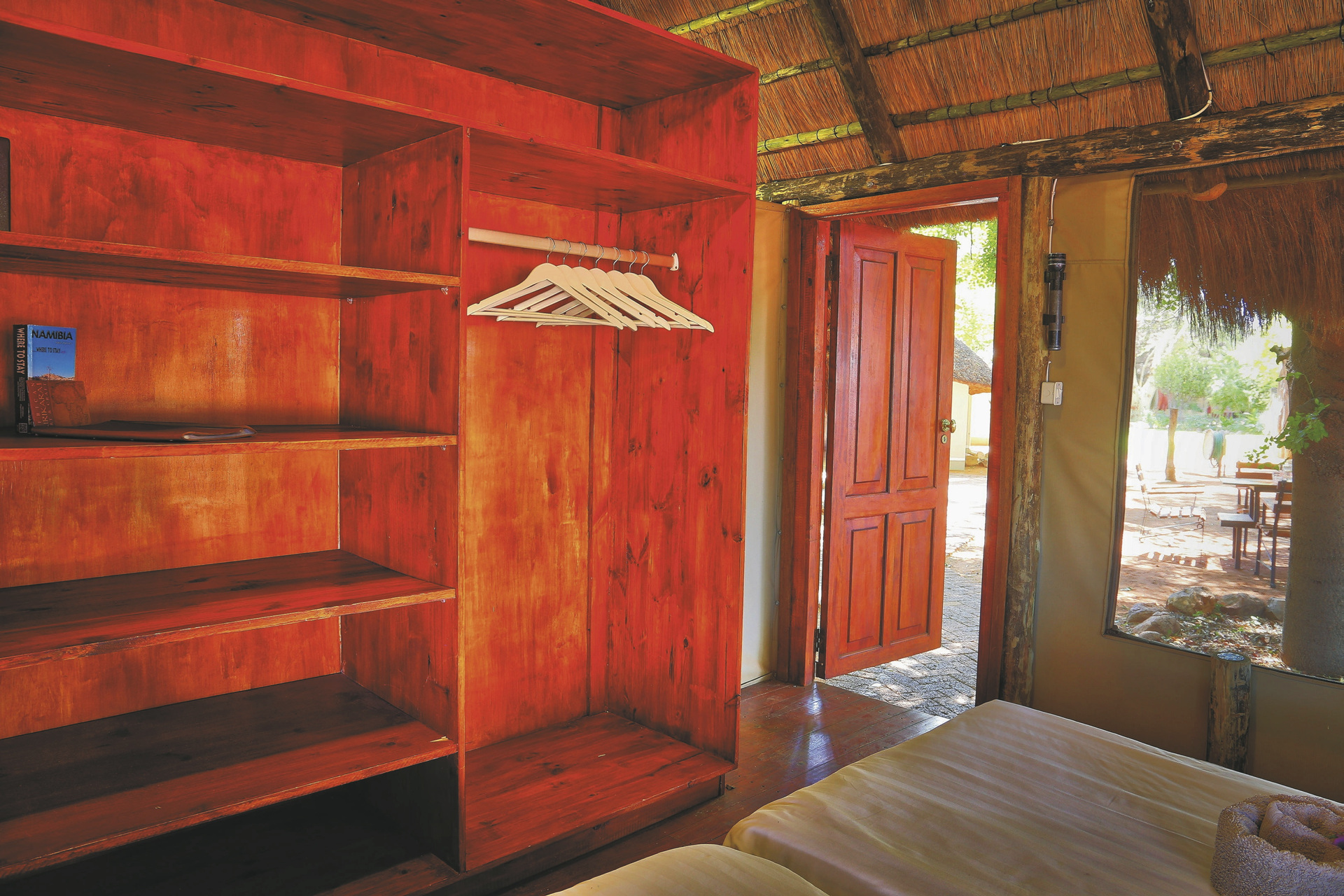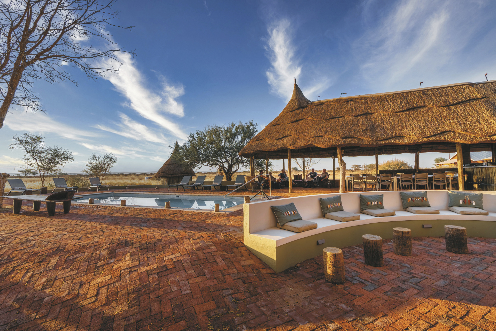Die individuelle, liebevoll gestaltete Gästefarm empfängt Sie mit einem familiären Ambiente. Der zentrale Mittelpunkt ist die gemütliche Lapa, strohdeckt und offen an den Seiten versprüht sie ein ganz eigenen afrikanischen Charme. Hier ist sowohl die Lounge, als auch die Bar und der Speisebereich untergebracht, kostenloses WLAN finden Sie hier auch. Der erfrischende Pool, umgeben von einer Sonnenterrasse und einheimischen Bäumen, lädt zum Verweilen ein. Das Küchenteam zaubert leckere Gerichte aus der typisch namibischen Farmküche mit Zutaten überwiegend aus eigenem Anbau. Bei gutem Wetter findet das Abendessen unter den Sternen Namibias in der Boma statt. Einzigartig auf der Farm sind die hochmodernen Einrichtungen und optimalen Bedingungen zur Sternenbeobachtung sowie die inspirierenden Kunst- und Handwerksateliers wie die Spinn-, Web- und Schmuckwerkstätten. Optionale Aktivitäten: geführte Wanderungen, geführte E-Bike Touren, Wildbeobachtungsfahrten zum Sonnenuntergang, Sternenbeobachtung unter kundiger Begleitung (von Mai-September), Besichtigung der Werkstätten, Farmführung.