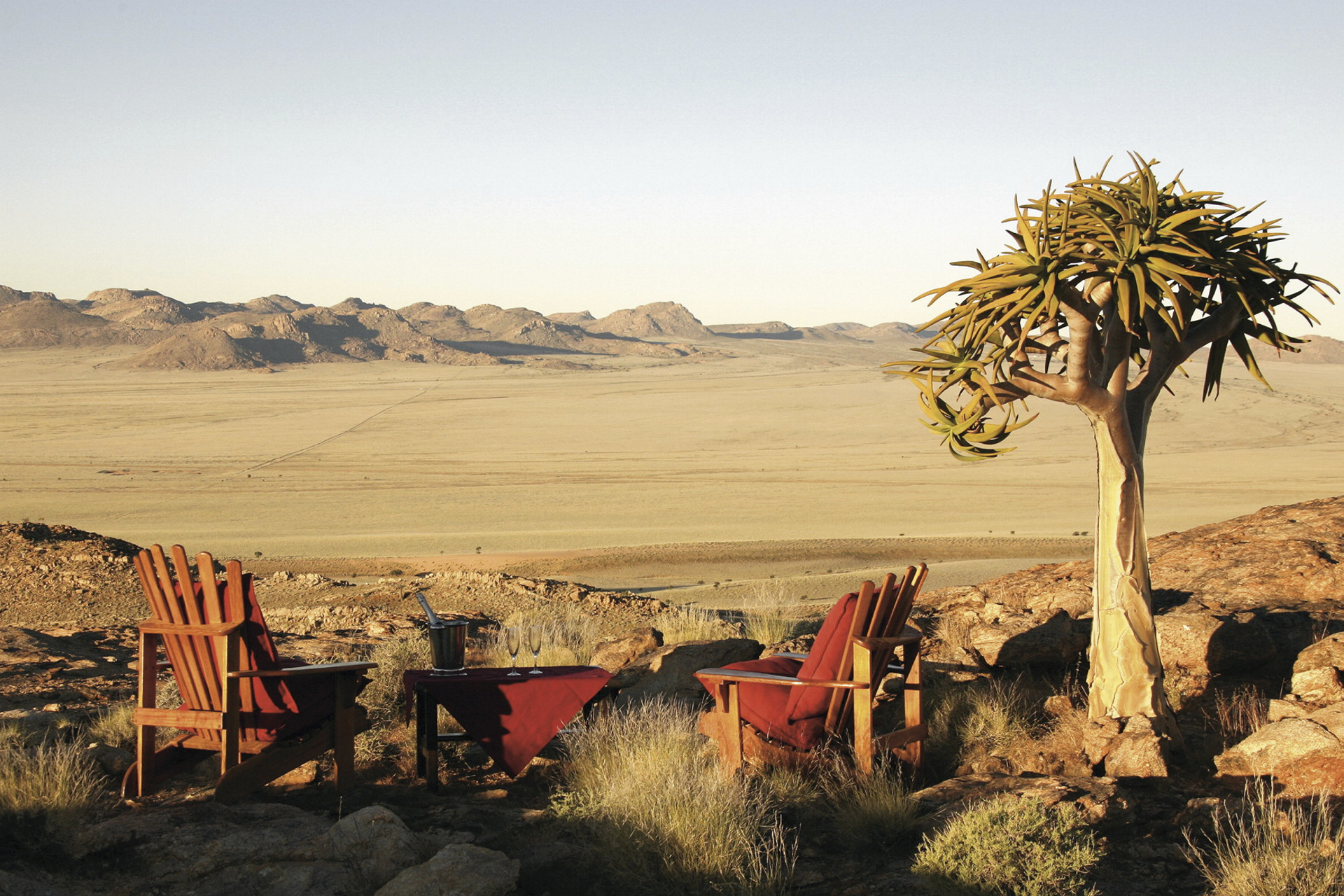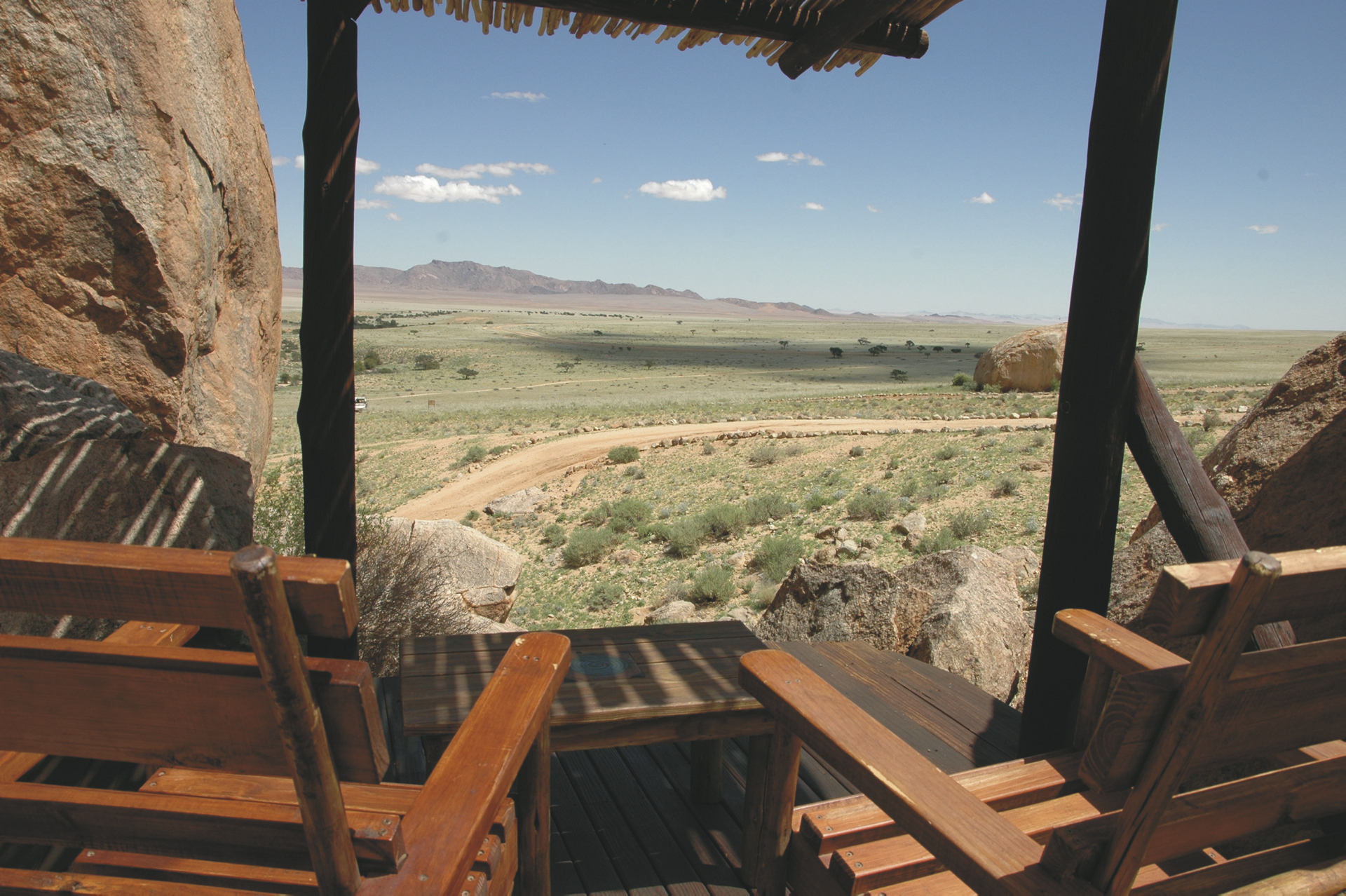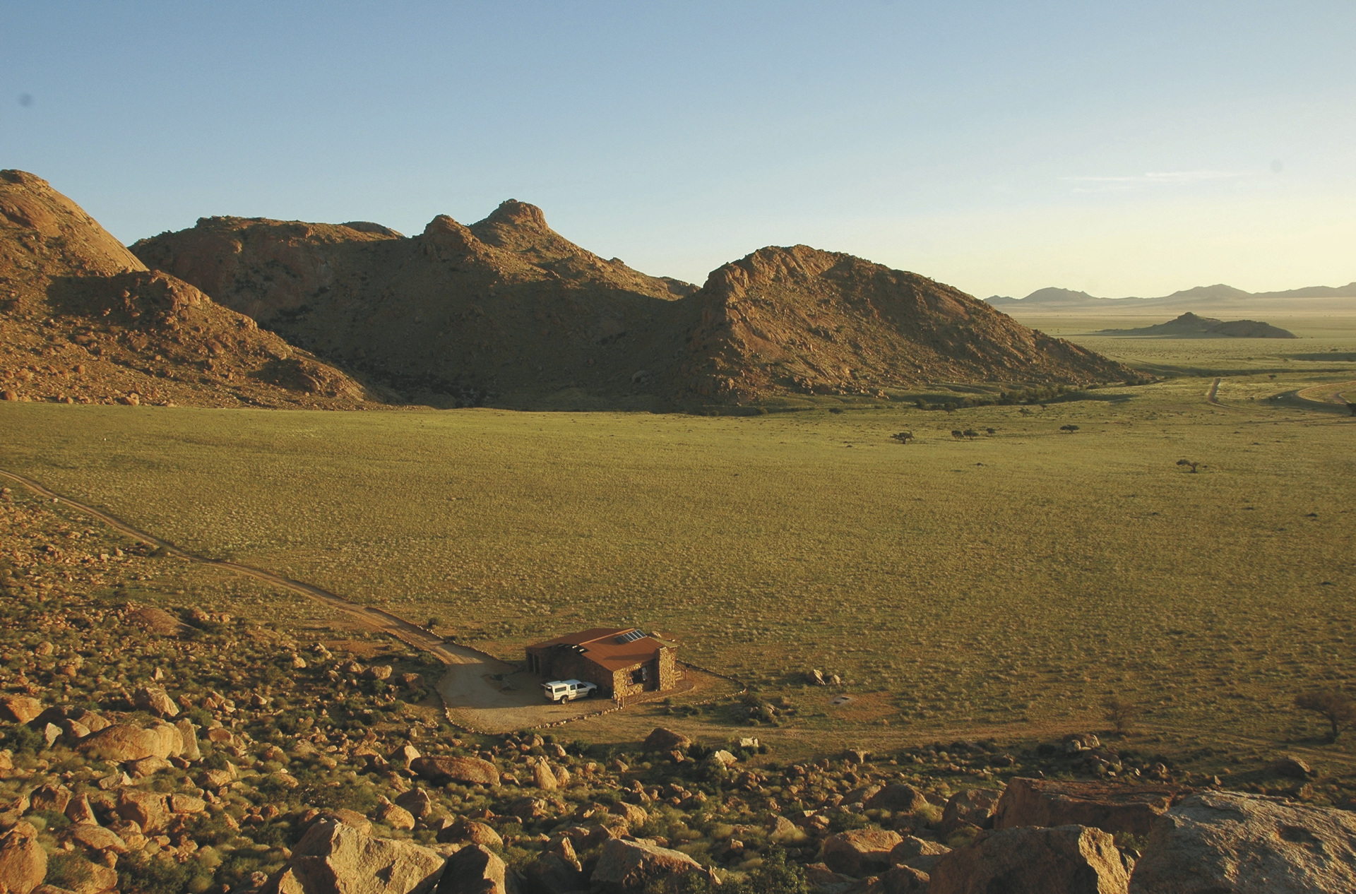 Abseits jeglicher Zivilisation in absoluter Ruhe liegen die Chalets etwa 7 km von der Schwesterlodge entfernt, nach Aus sind es ca. 3 km und nach Lüderitz ca. 125 km.