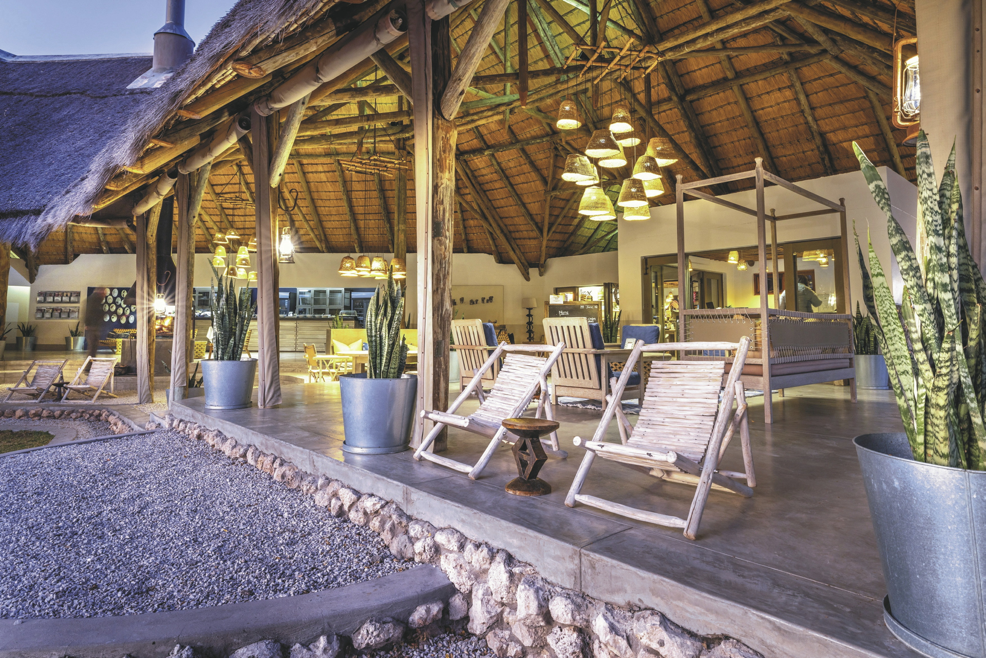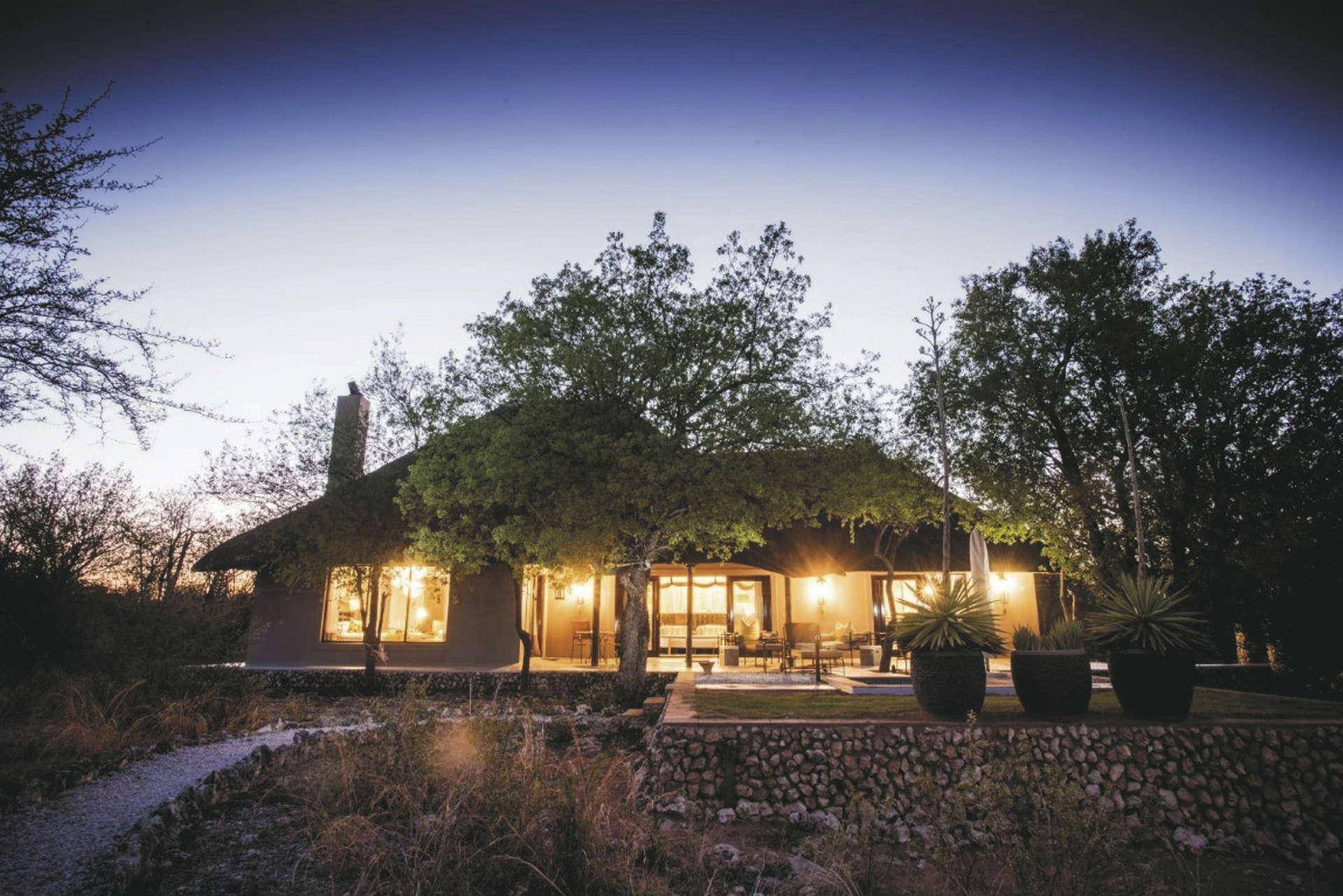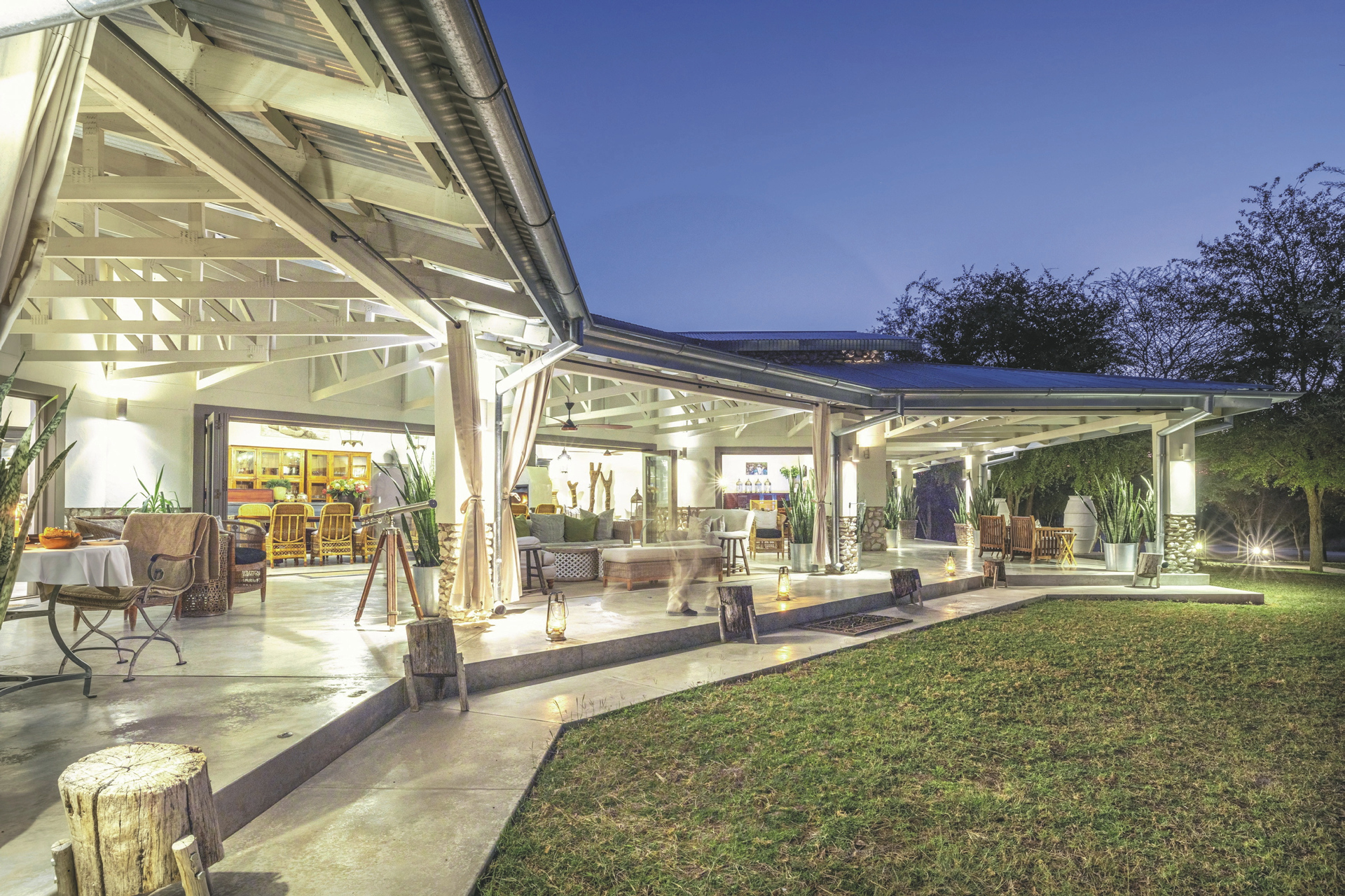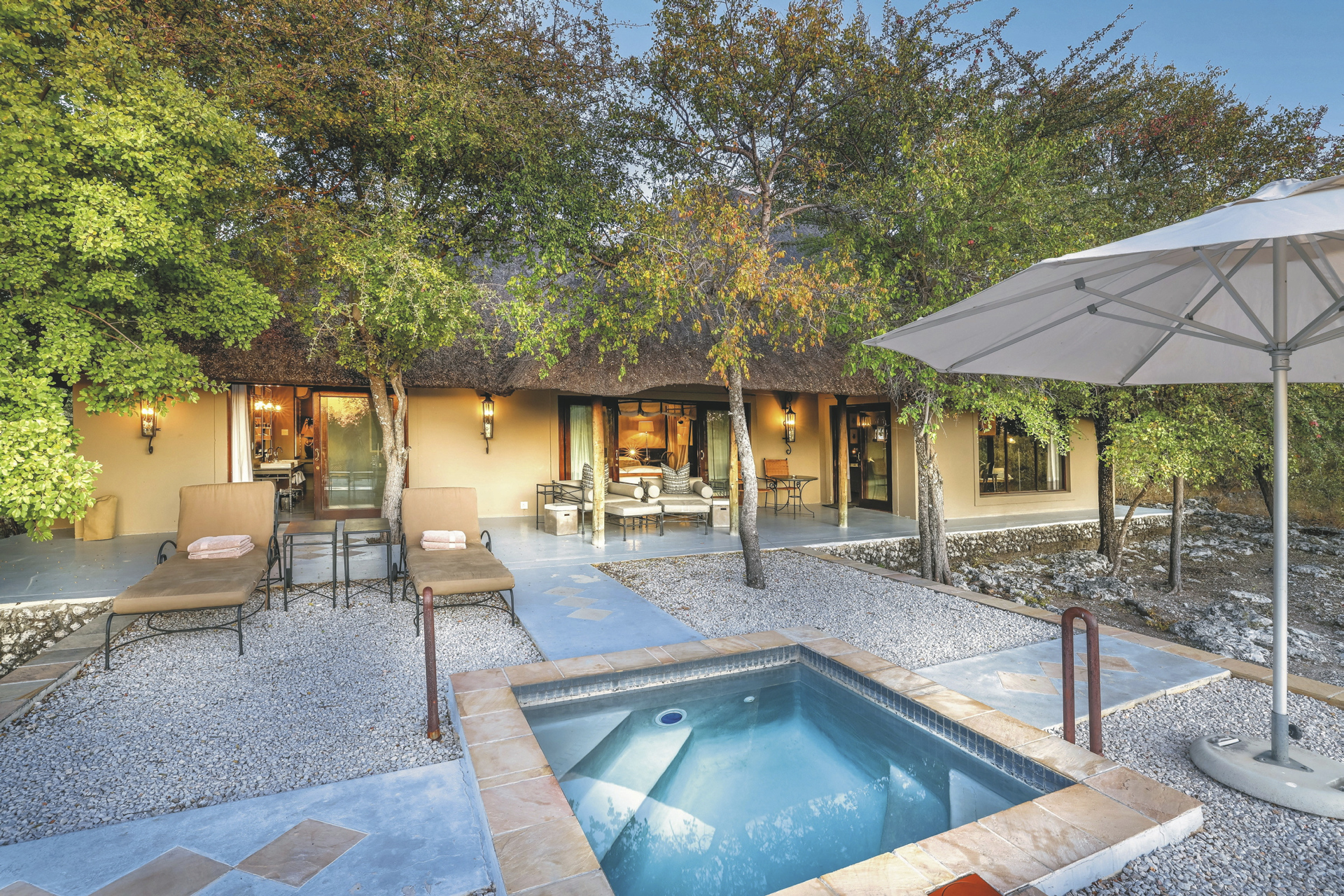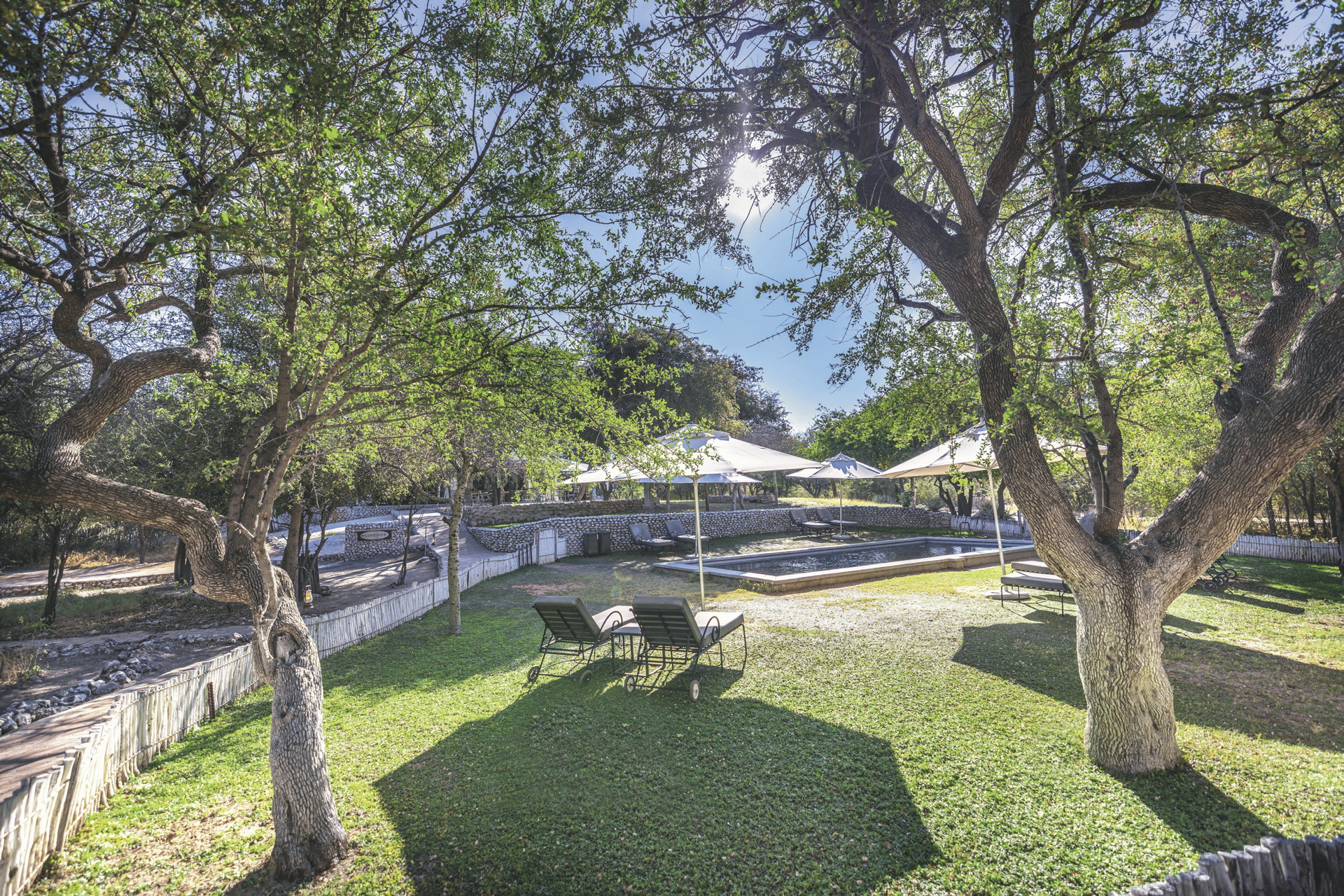 Das Haupthaus ist im Stil eines alten Farmhauses gehalten und bietet mit hohen Decken, umlaufender Veranda und moderner Eleganz eine großzügige Gastlichkeit im Stil längst vergangener Zeiten. An einem großen Tisch werden die Mahlzeiten eigenommen, wenn das es auf der Terrasse zu kühl ist. Die gemütliche Lounge wirkt einladend wie ein privates Wohnzimmer, vor allem im Winter, wenn der Kamin prasselt und man es sich mit einem Getränk von der Bar und einem Buch in der Hand in einem der bequemen Sesseln gemütlich machen möchte. Ein beliebter Treffpunkt am Abend ist auch die offene Feuerstelle auf dem Rasen. Zwischen den Pirschfahrten bietet der Pool im Garten eine willkommene Abwechslung. Am Wasserloch kann man neben unzähligen Vögeln und Antilopen natürlich auch Etoshas Großwild beobachten.