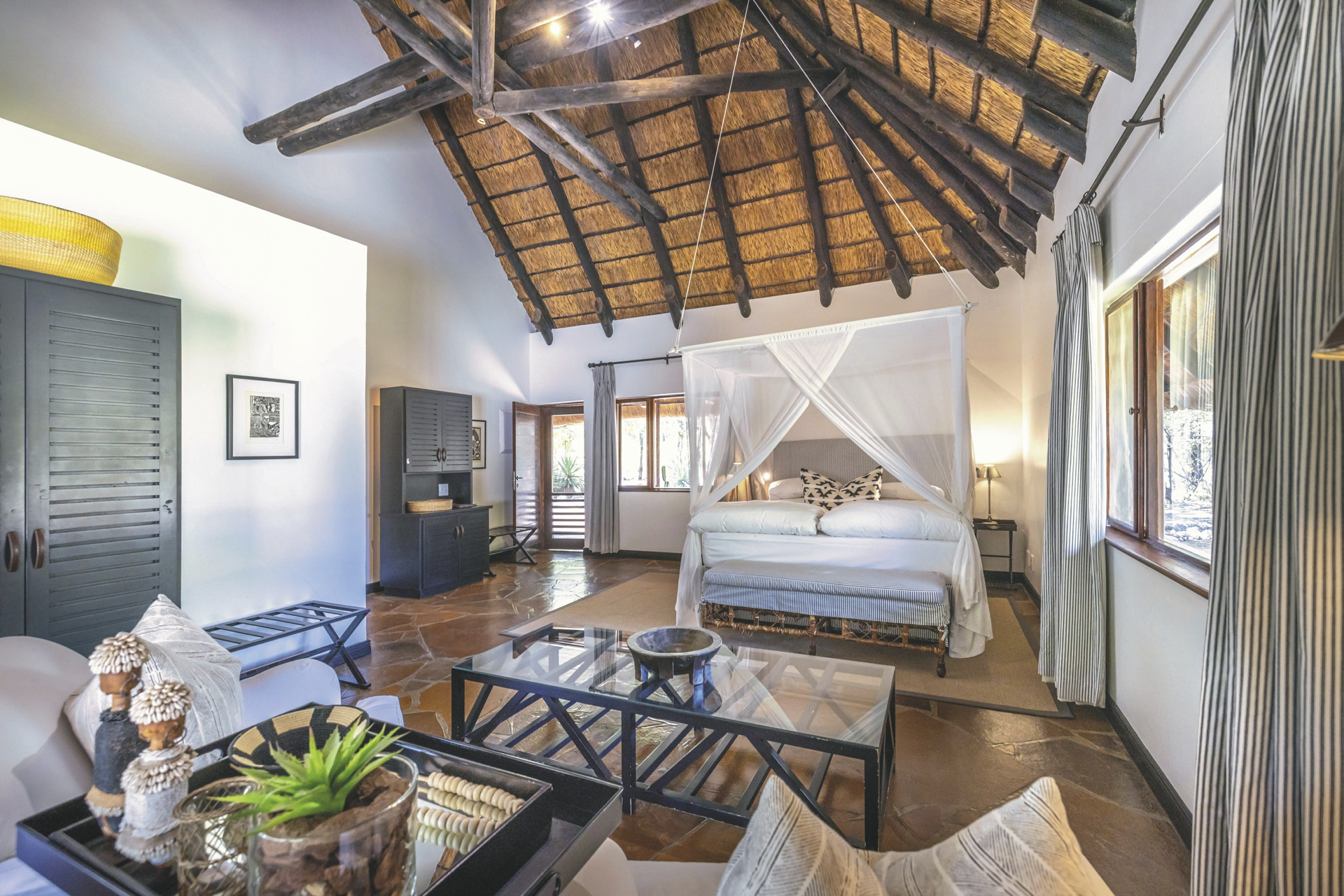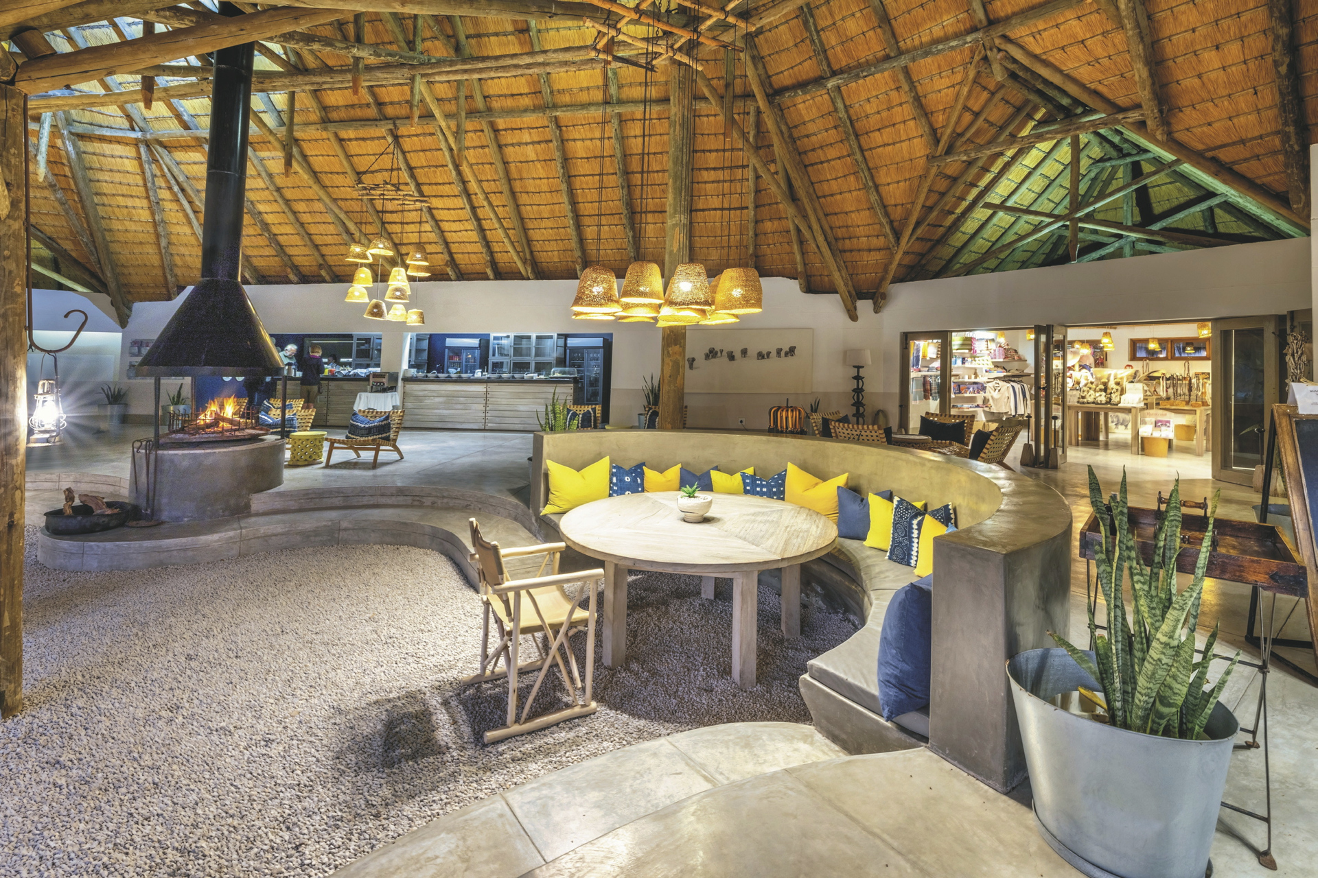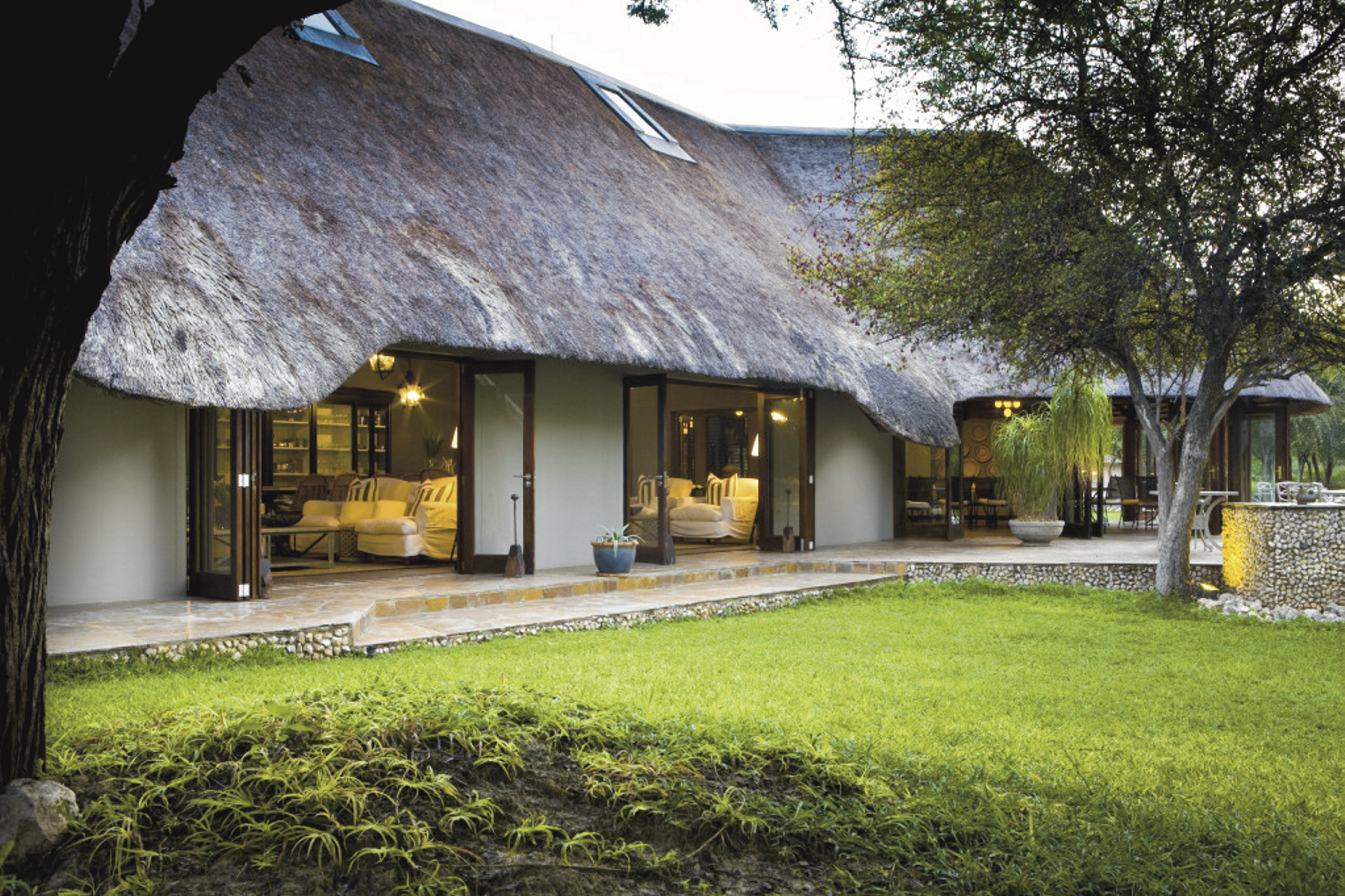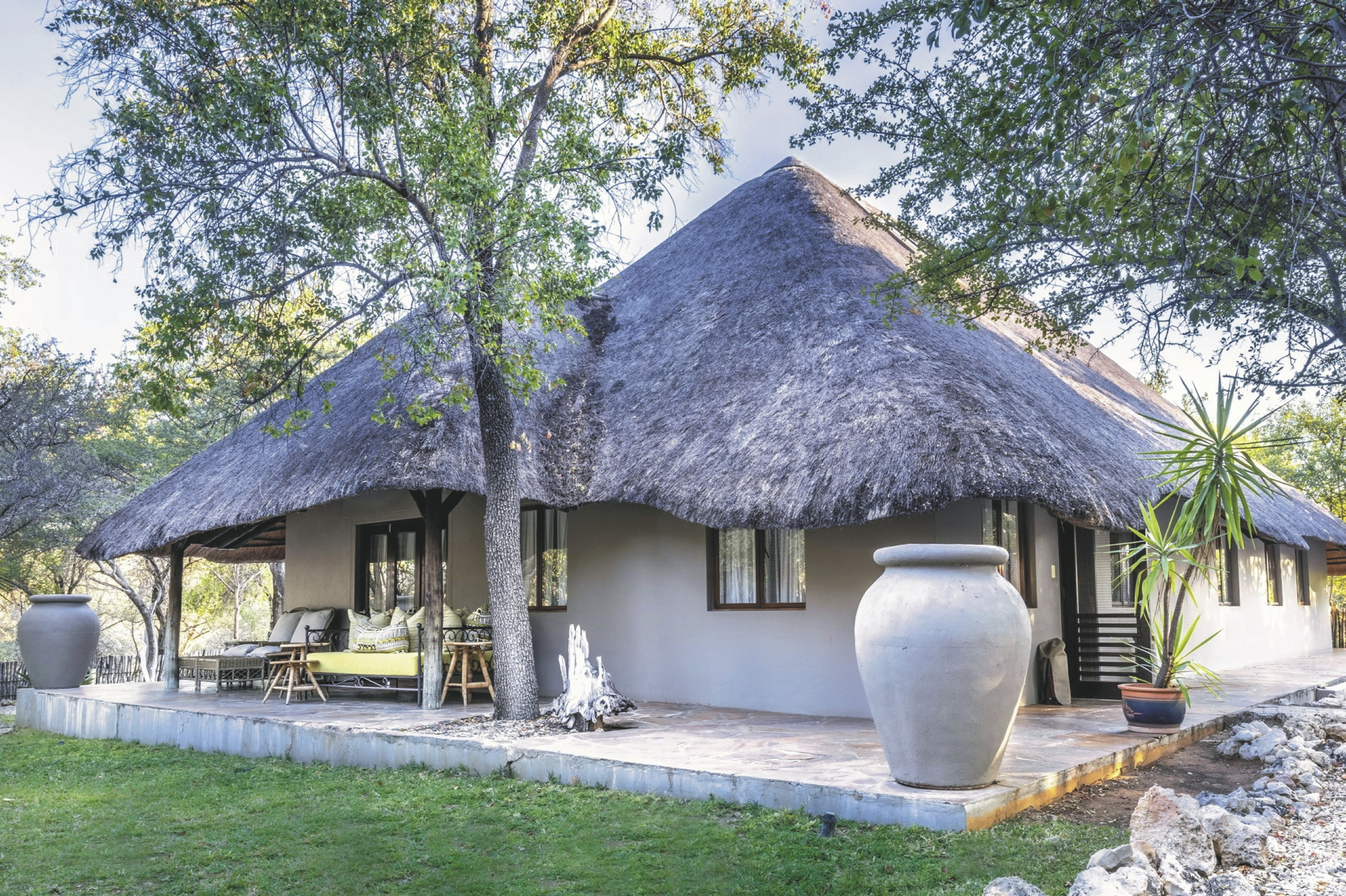 Eine elegante Unterkunft mit liebevoll gestalteter Inneneinrichtung aus traditioneller, afrikanischer Kunst und zeitgenössischen Werken. Das riedgedeckte Hauptgebäude besteht aus dem Speisezimmer, einer Bar, einem gut bestückten Weinkeller, einer kleiner Bibliothek sowie einem gemütlichen Loungebereich mit kuscheligen Sesseln vor einem lodernden Kamin an kalten Winterabende. Auf der großen, schattigen Terrasse werden nach Möglichkeit die Mahlzeiten eingenommen. Ein kleiner Shop bietet zahlreiche hübsche und kunstvolle Souvenirs. Der großer Pool und die Sonnenterrasse liegen mittig der einzelnen Unterkünfte. Verwöhnen lassen können Sie sich im Spa-Bereich.