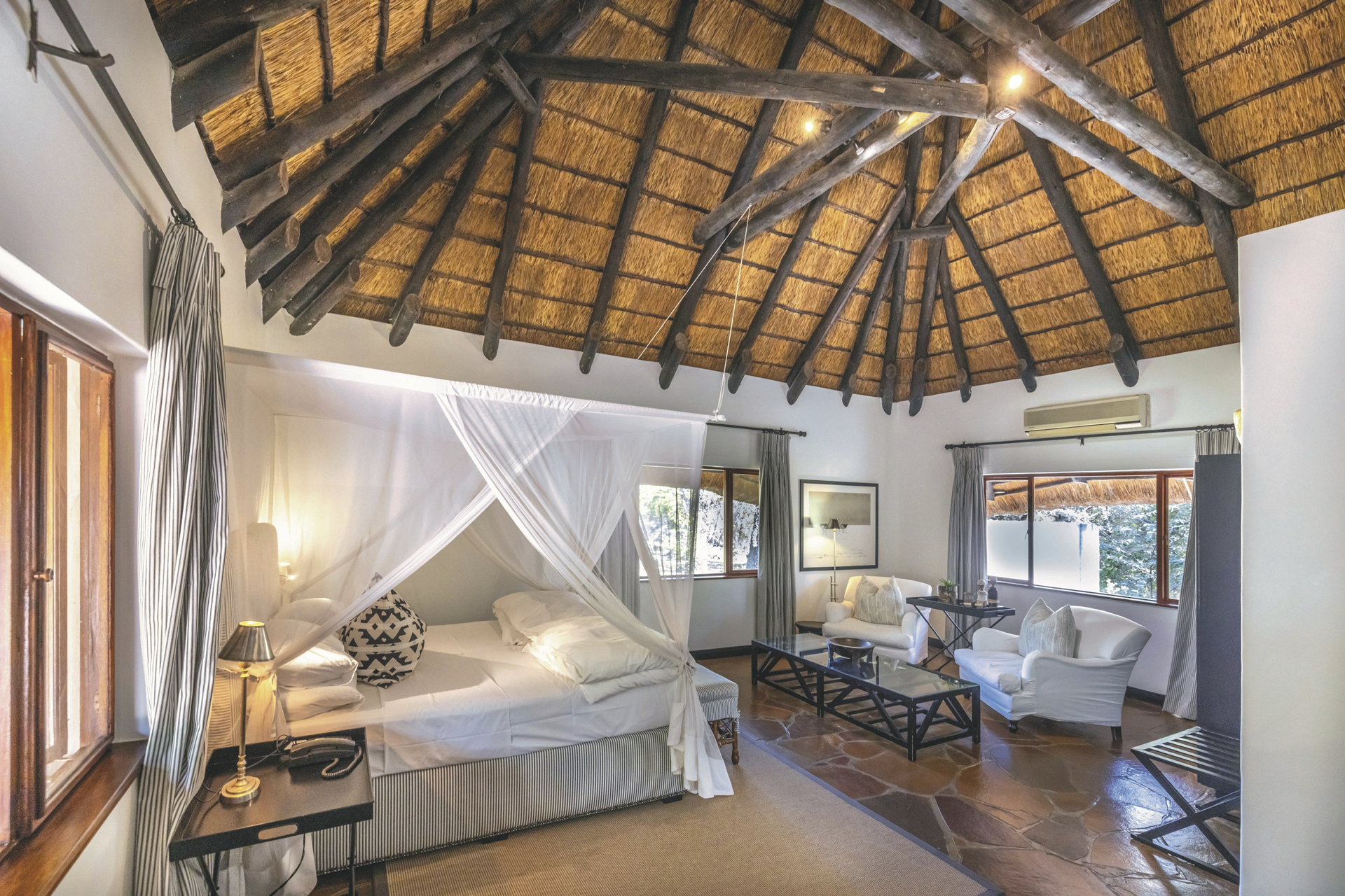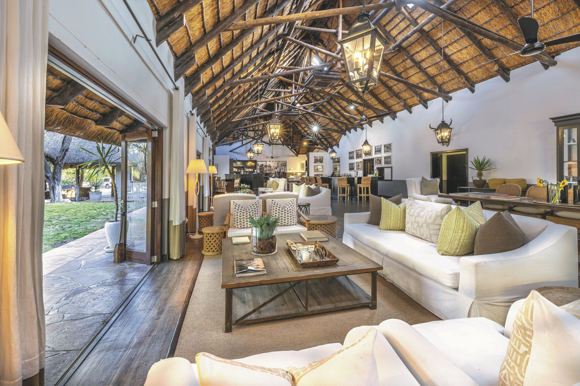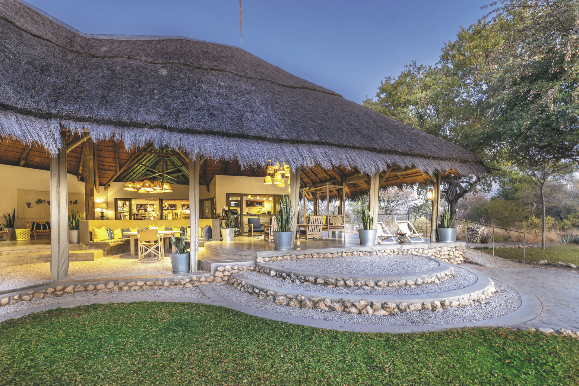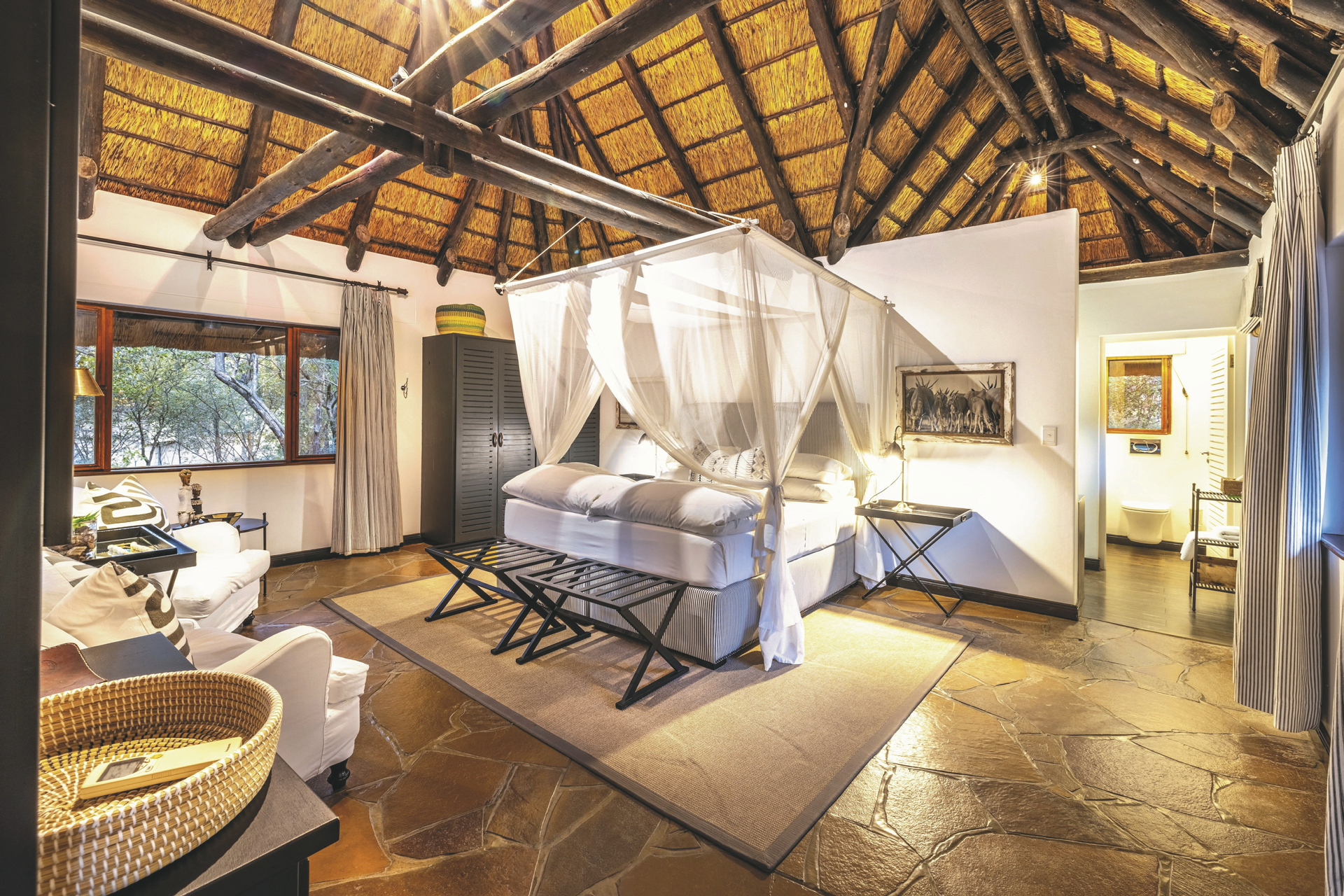 Eine elegante Unterkunft mit liebevoll gestalteter Inneneinrichtung aus traditioneller, afrikanischer Kunst und zeitgenössischen Werken. Das riedgedeckte Hauptgebäude besteht aus dem Speisezimmer, einer Bar, einem gut bestückten Weinkeller, einer kleiner Bibliothek sowie einem gemütlichen Loungebereich mit kuscheligen Sesseln vor einem lodernden Kamin an kalten Winterabende. Auf der großen, schattigen Terrasse werden nach Möglichkeit die Mahlzeiten eingenommen. Ein kleiner Shop bietet zahlreiche hübsche und kunstvolle Souvenirs. Der großer Pool und die Sonnenterrasse liegen mittig der einzelnen Unterkünfte. Verwöhnen lassen können Sie sich im Spa-Bereich.