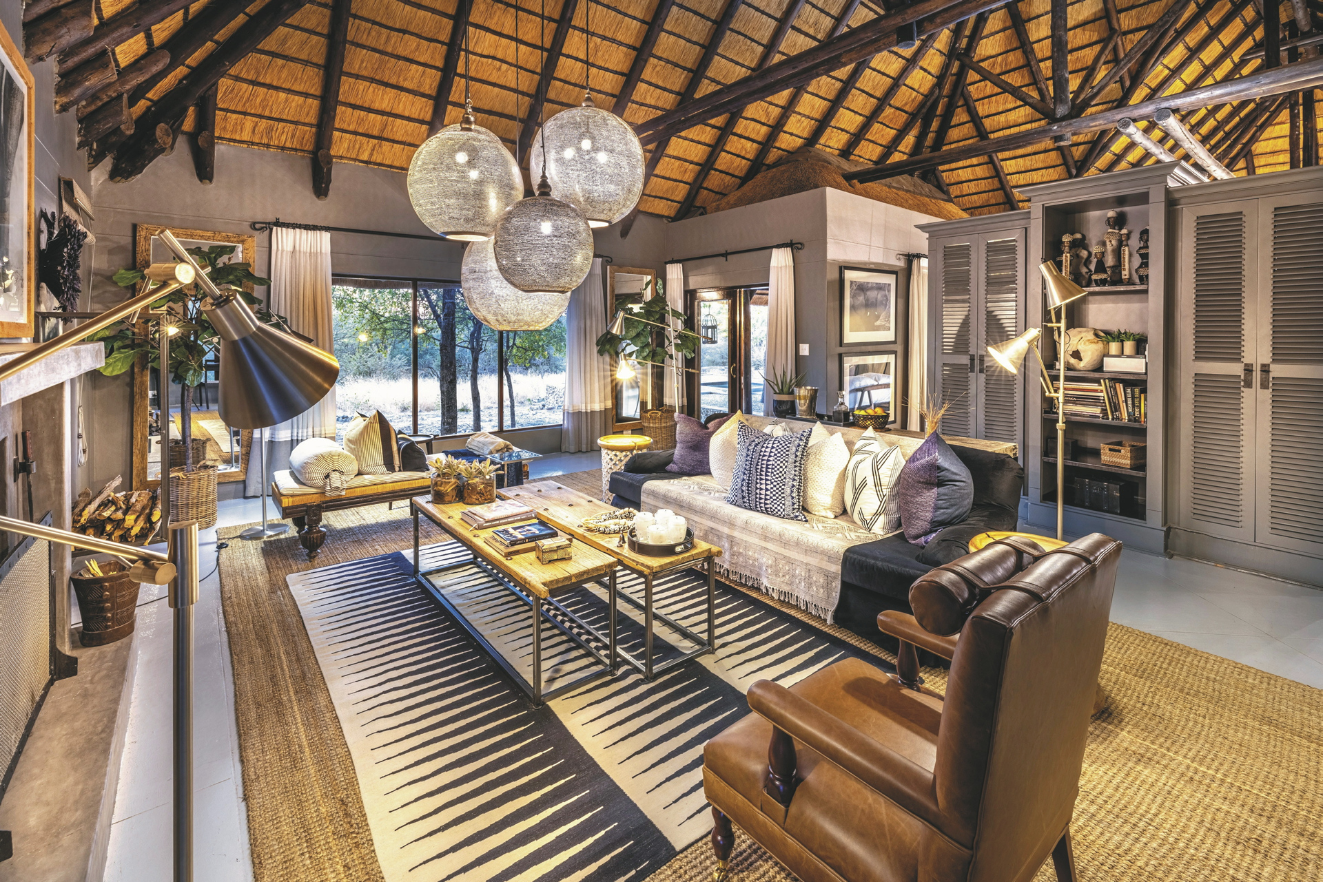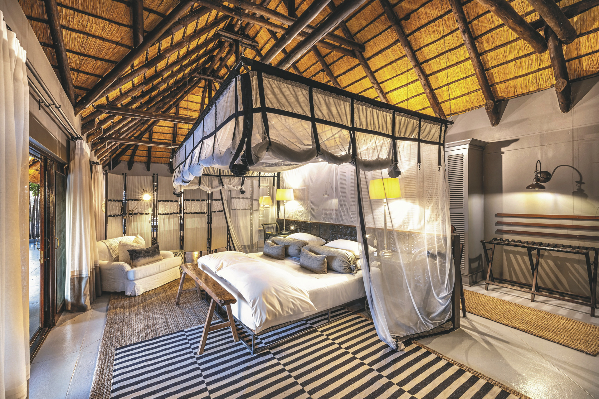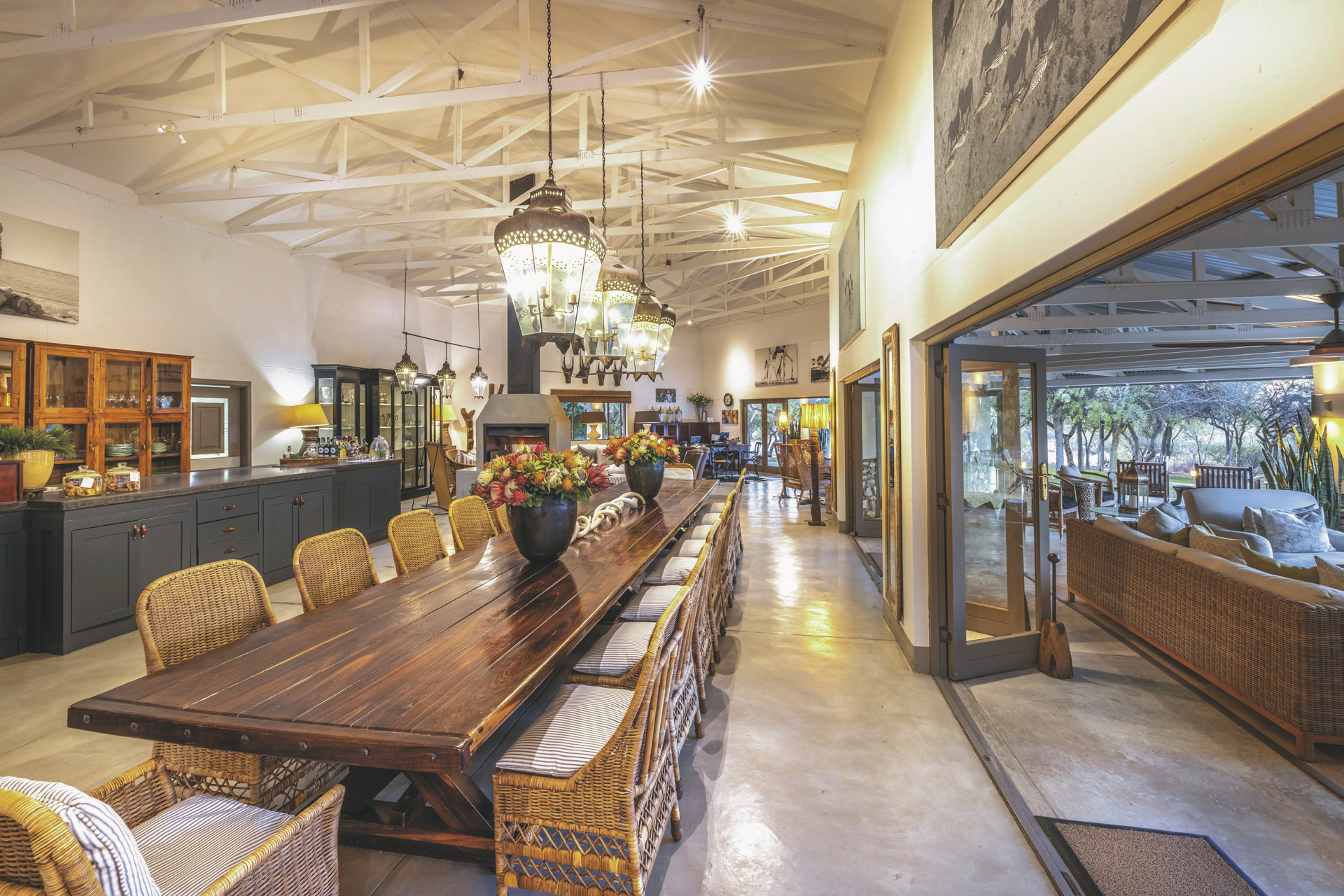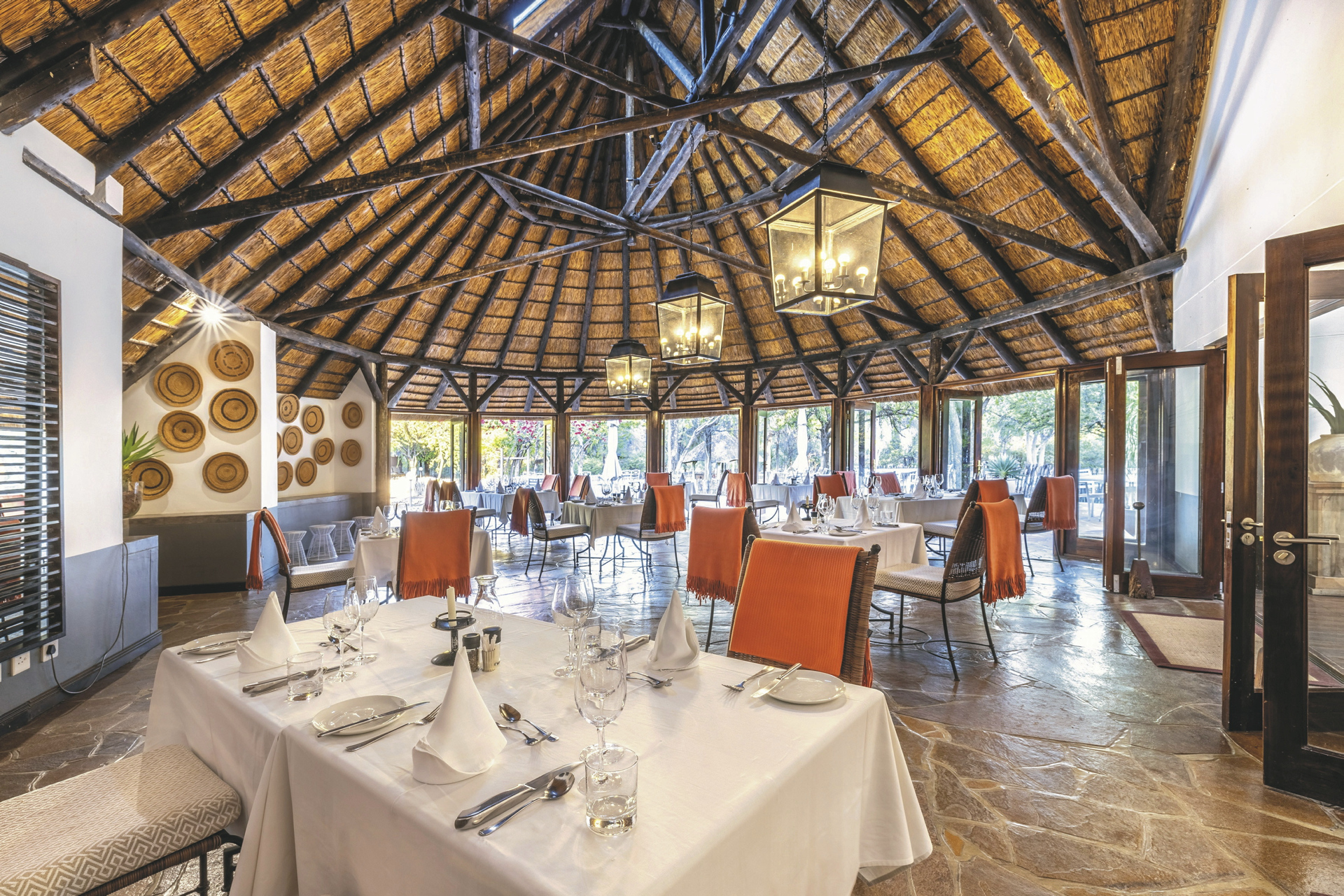 Eine elegante Unterkunft mit liebevoll gestalteter Inneneinrichtung aus traditioneller, afrikanischer Kunst und zeitgenössischen Werken. Das riedgedeckte Hauptgebäude besteht aus dem Speisezimmer, einer Bar, einem gut bestückten Weinkeller, einer kleiner Bibliothek sowie einem gemütlichen Loungebereich mit kuscheligen Sesseln vor einem lodernden Kamin an kalten Winterabende. Auf der großen, schattigen Terrasse werden nach Möglichkeit die Mahlzeiten eingenommen. Ein kleiner Shop bietet zahlreiche hübsche und kunstvolle Souvenirs. Der großer Pool und die Sonnenterrasse liegen mittig der einzelnen Unterkünfte. Verwöhnen lassen können Sie sich im Spa-Bereich.
