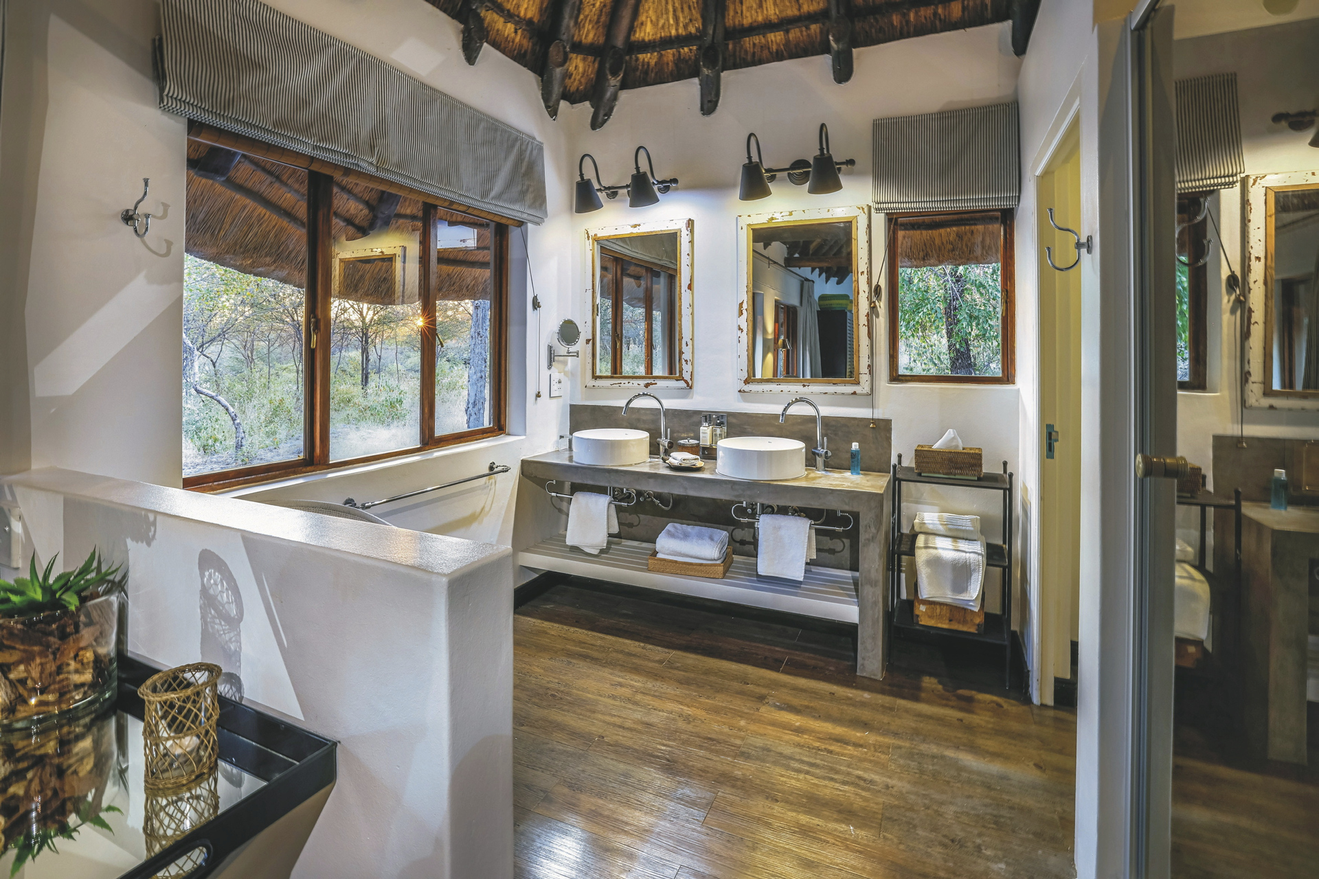Es gibt nur 2 traumhafte Villen, die zeitlose Eleganz und klassisches Safari-Ambiente verbinden. Ruhe, Zeit zur Besinnung und viel Platz sind nur einige der herausragenden Aspekte dieser Unterkunft. Ihre 140 qm große Villa bietet das perfekte Zuhause auf Zeit. Die gemütliche Lounge ist bestens ausgestattet um sich wohl zu fühlen, durch die großen Fenster schauen Sie direkt in den Busch. Ein Kamin, Minibar, Tee-/Kaffeezubereiter, Klimaanlage, Ventilator, Telefon, Safe, CD-Spieler und WLAN bieten reichlich Komfort. Zu dem modernen, offenen Badezimmer gehört nicht nur eine freistehende Badewanne, sondern auch eine Innen- und eine Außendusche. Auf der Terrasse steht neben Liegestühlen zum Faulenzen natürlich auch ein eigener Plunge Pool bereit.