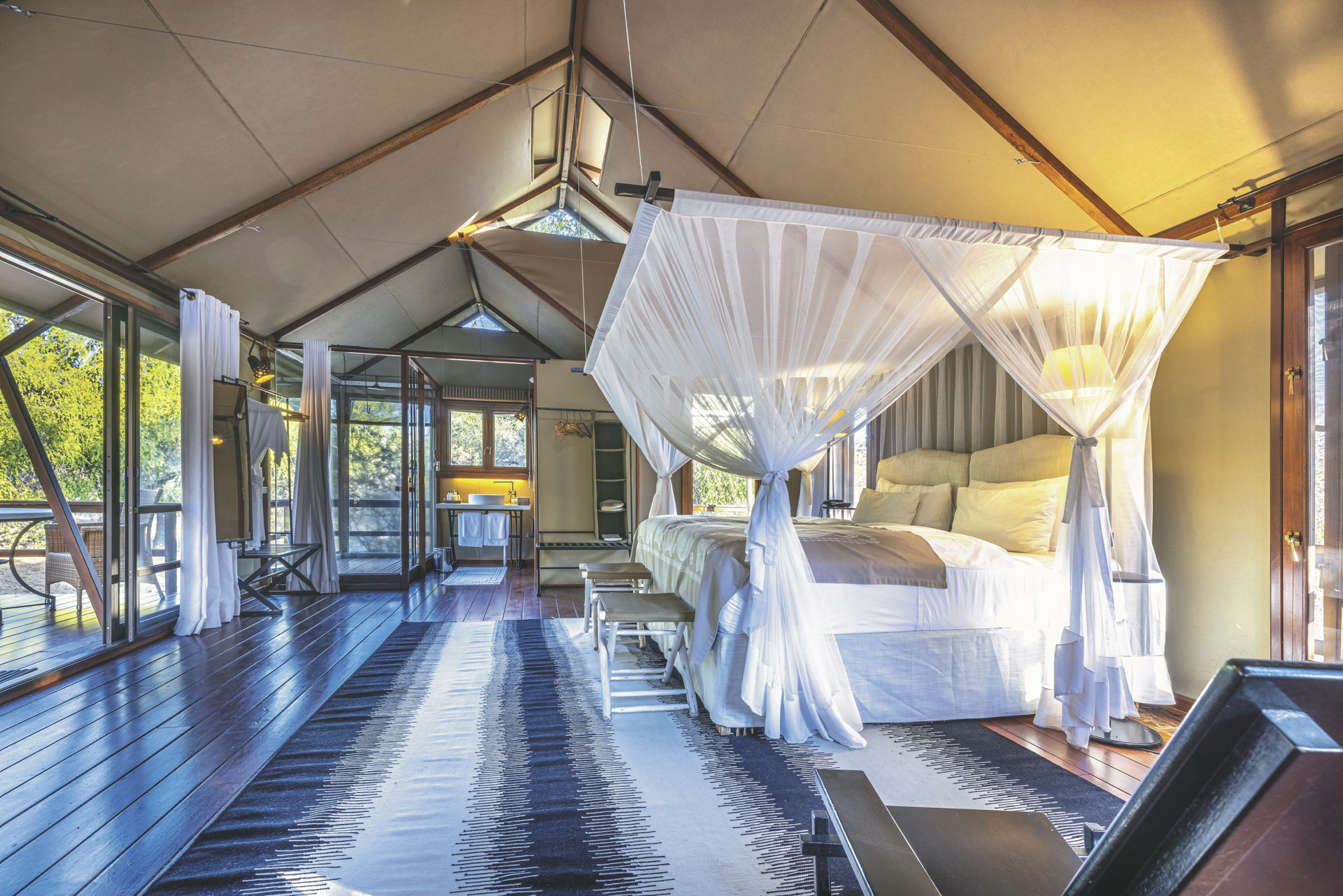 Die 16 großen, modernen Safarizelte liegen verteilt im Busch und haben lediglich von außen Ähnlichkeit mit einem Zelt. Innen finden Sie Holzböden, handgefertigte Möbel, gemütliche Betten und jeglichen weiteren Komfort. Jedes Safarizelt ist ausgestattet mit einem Bad, Fön, Safe, Ventilator, Tee-/Kaffeezubereiter, WLAN, Moskitonetz und einer Terrasse. Die 4 Familienzelte bieten mit einer zusätzlichen Schlafcouch und einem weiteren Bett Platz für 2 Erwachsene und 3 Kinder.