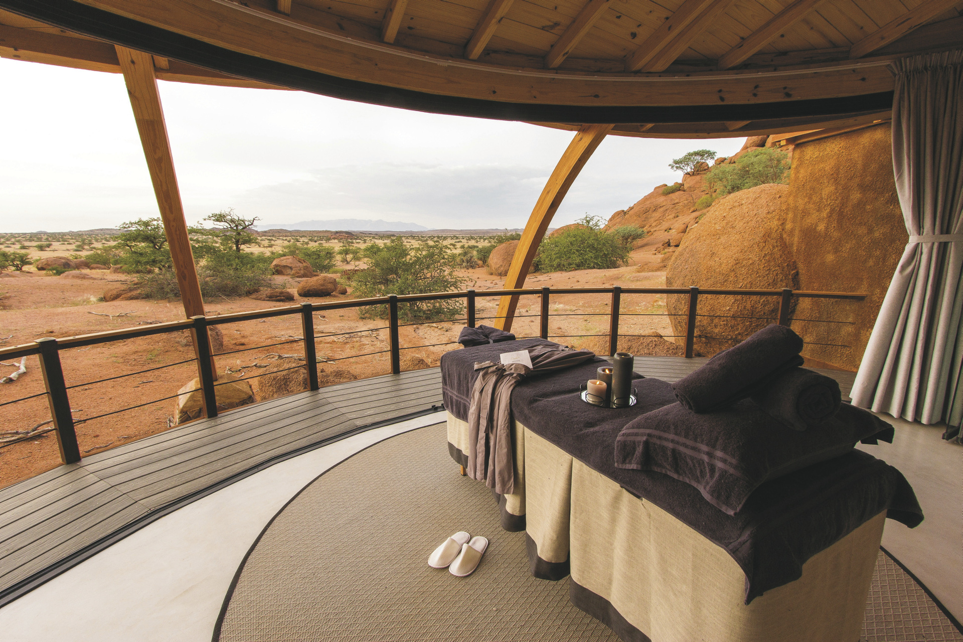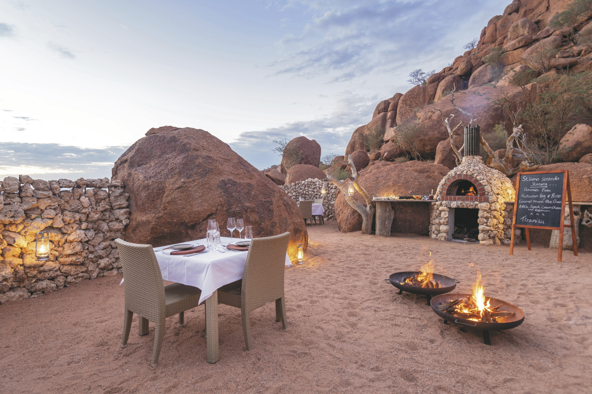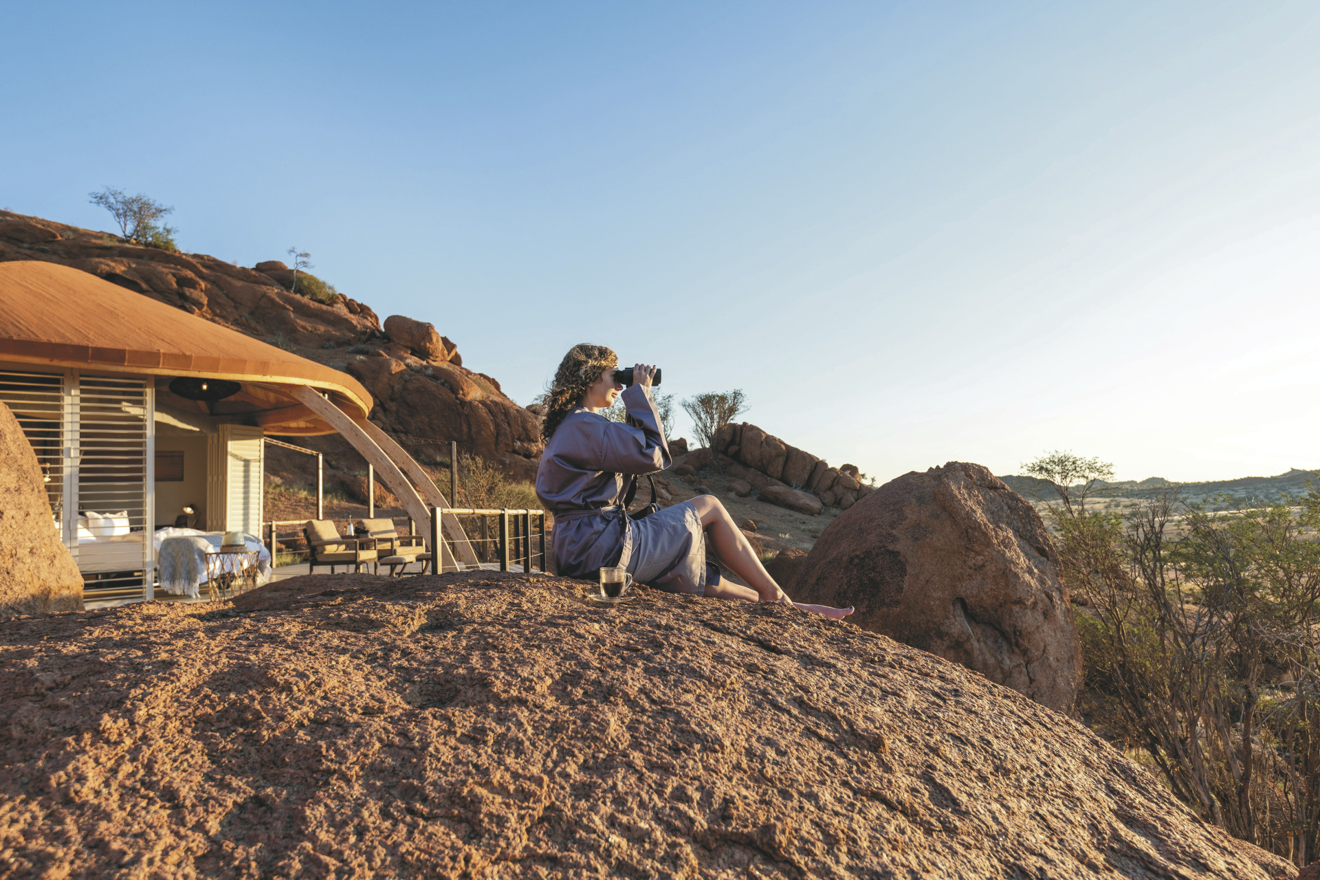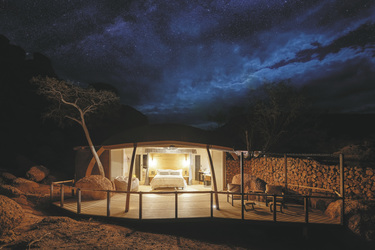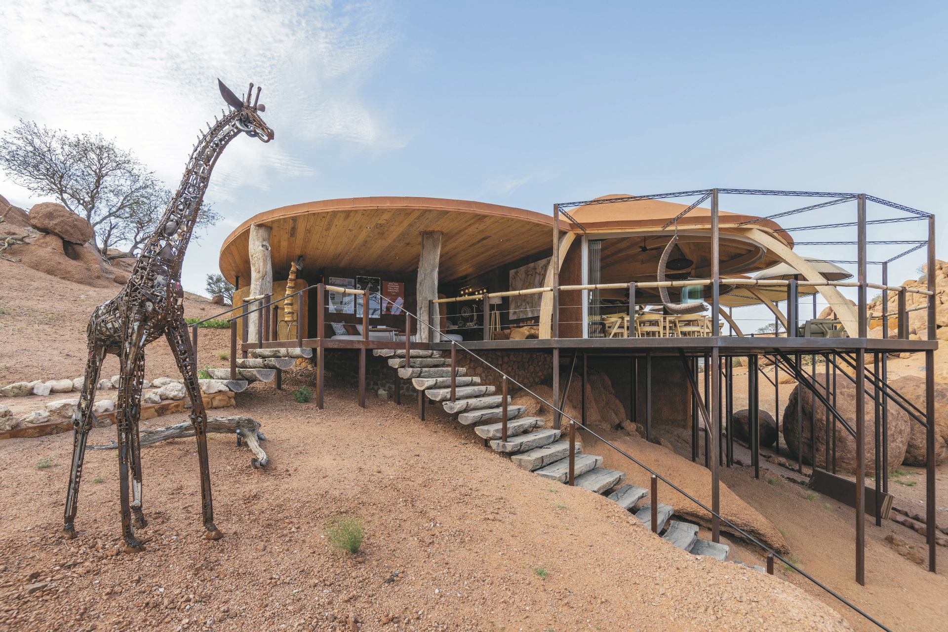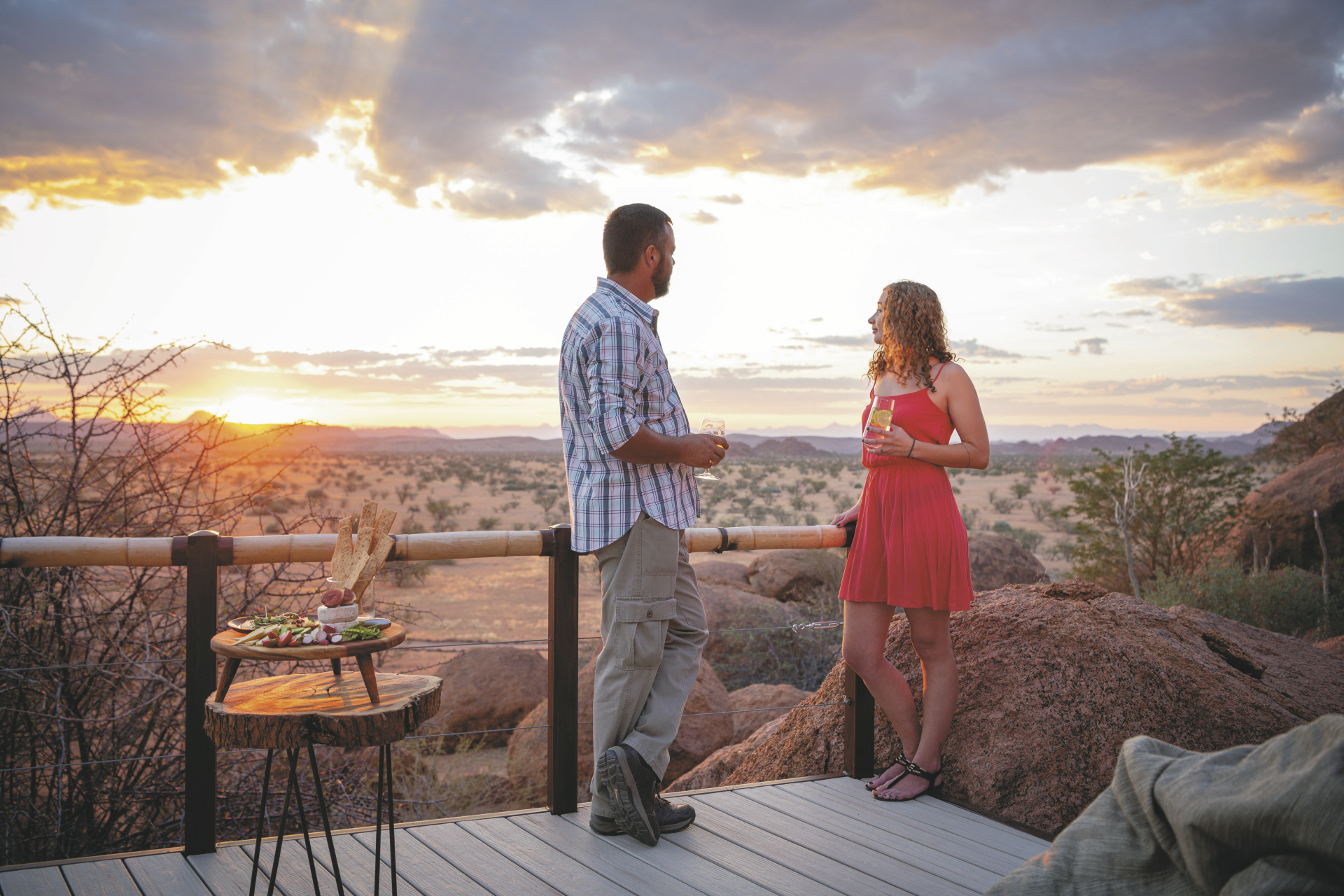Die Lodge ist am Fuße von zwei Granitvorsprüngen erbaut, die durch einen Grat verbunden sind. Von hier haben Sie einen herrlichen Blick auf Namibias höchsten Berg, den Brandberg im Süden und die verstreuten, kathedralenartigen Granitinselberge im Norden. Die Lodge mit weitgehend offenem Gemeinschaftsbereich wurde mit viel Liebe zum Detail eingerichtet. Entspannung und Erholung finden Sie zwischen den Aktivitäten z.B. am Pool, in der Lounge, im Spa oder in der Bibliothek. Am Abend genießt man ein letztes Getränk vor dem zu Bett gehen entweder in der Bar oder unter den Sternen Namibias rund um das Lagerfeuer. Die Lodge wird zu 100% mit Solarstrom versorgt. Kulinarik wird besonders groß geschrieben, regelmäßig finden in der Boma Pizza-Abende statt, bei denen Sie Ihre eigene Pizza kreieren können, die dann im Holzofen frisch gebacken wird. Eingeschlossene Aktivitäten: Pirschfahrten auf der Suche nach den seltenen Wüstenelefanten, geführte Wanderungen, Ausflüge zu den Felsmalereien der San von Twyfelfontein, Solar E-Bike Touren. Bei einem Aufenthalt von 3 Nächten und mehr können Sie sich auch auf die Suche nach den Wüstennashörner der Region begeben.