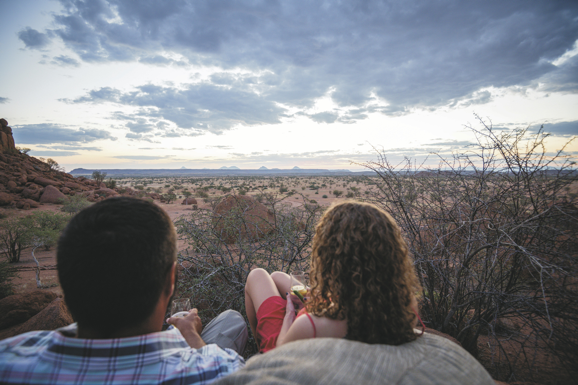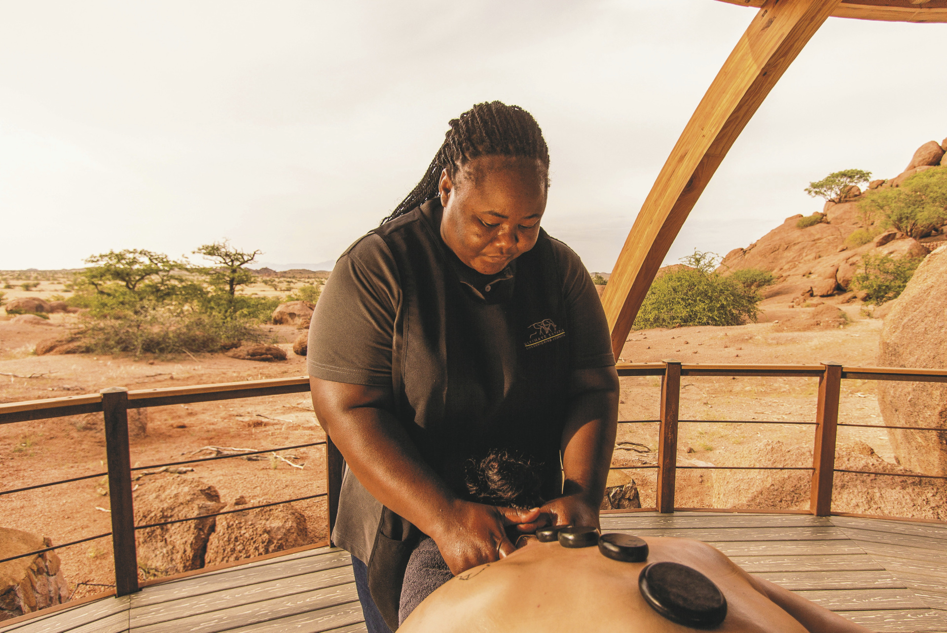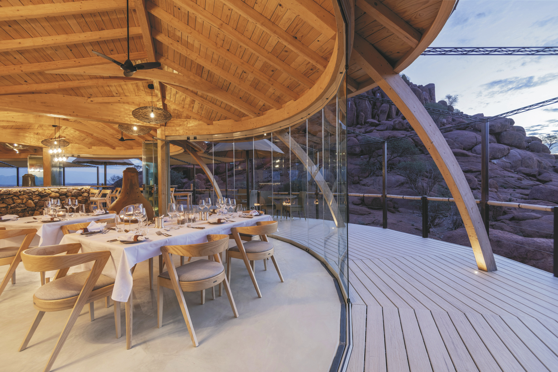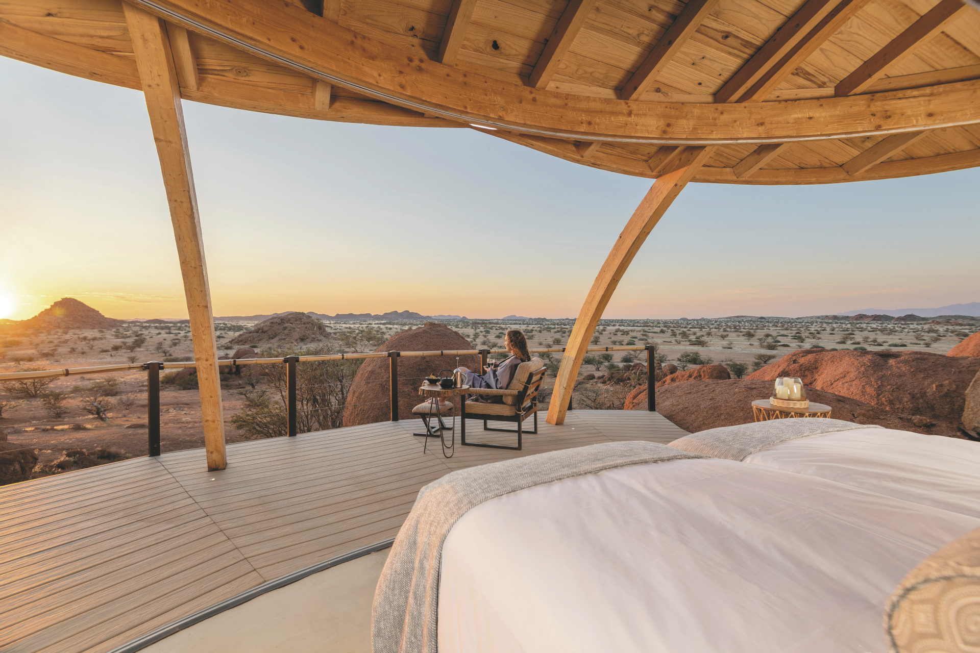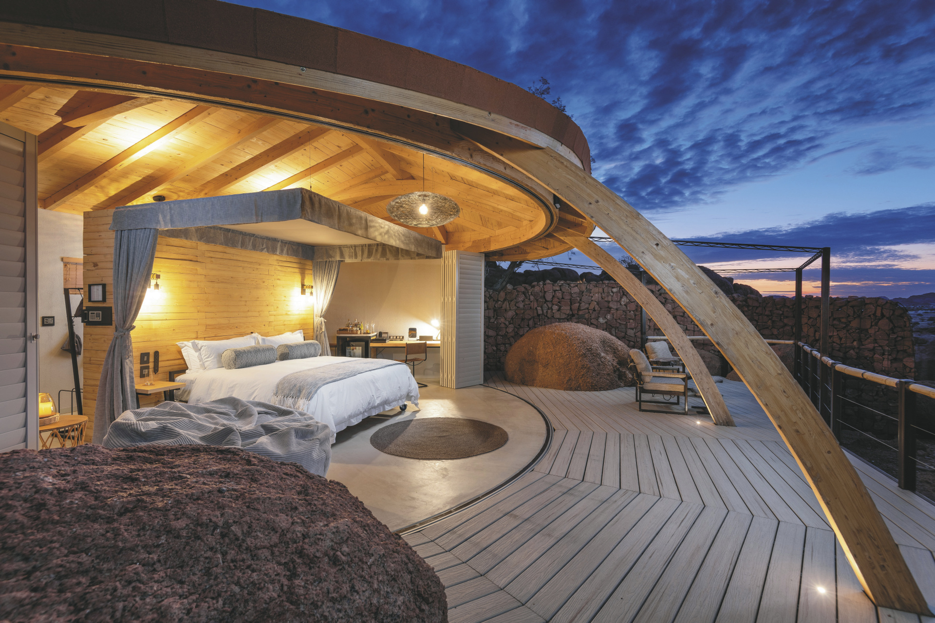 Die Lodge ist am Fuße von zwei Granitvorsprüngen erbaut, die durch einen Grat verbunden sind. Von hier haben Sie einen herrlichen Blick auf Namibias höchsten Berg, den Brandberg im Süden und die verstreuten, kathedralenartigen Granitinselberge im Norden. Die Lodge mit weitgehend offenem Gemeinschaftsbereich wurde mit viel Liebe zum Detail eingerichtet. Entspannung und Erholung finden Sie zwischen den Aktivitäten z.B. am Pool, in der Lounge, im Spa oder in der Bibliothek. Am Abend genießt man ein letztes Getränk vor dem zu Bett gehen entweder in der Bar oder unter den Sternen Namibias rund um das Lagerfeuer. Die Lodge wird zu 100% mit Solarstrom versorgt. Kulinarik wird besonders groß geschrieben, regelmäßig finden in der Boma Pizza-Abende statt, bei denen Sie Ihre eigene Pizza kreieren können, die dann im Holzofen frisch gebacken wird. Eingeschlossene Aktivitäten: Pirschfahrten auf der Suche nach den seltenen Wüstenelefanten, geführte Wanderungen, Ausflüge zu den Felsmalereien der San von Twyfelfontein, Solar E-Bike Touren. Bei einem Aufenthalt von 3 Nächten und mehr können Sie sich auch auf die Suche nach den Wüstennashörner der Region begeben.