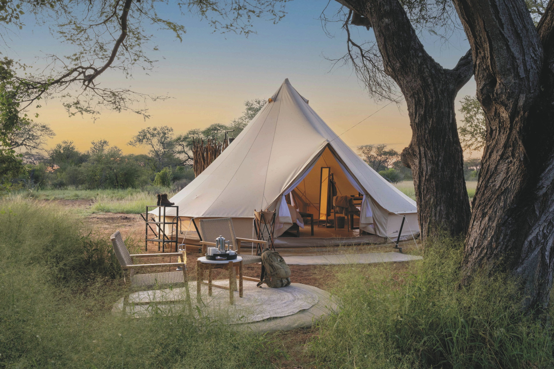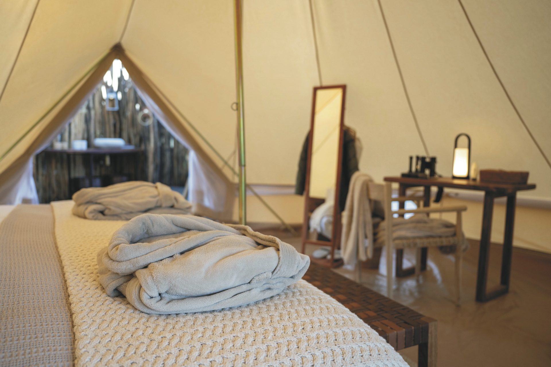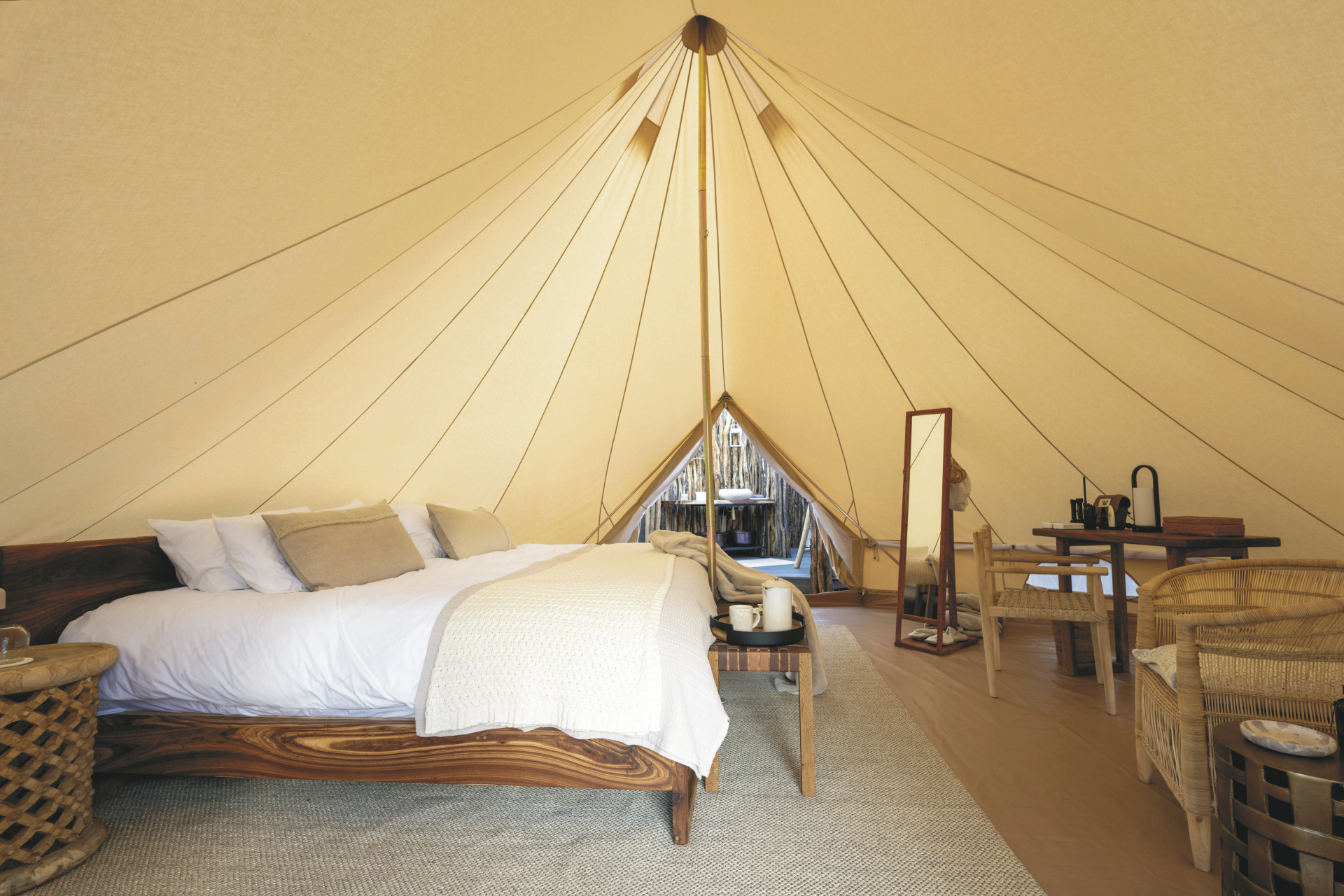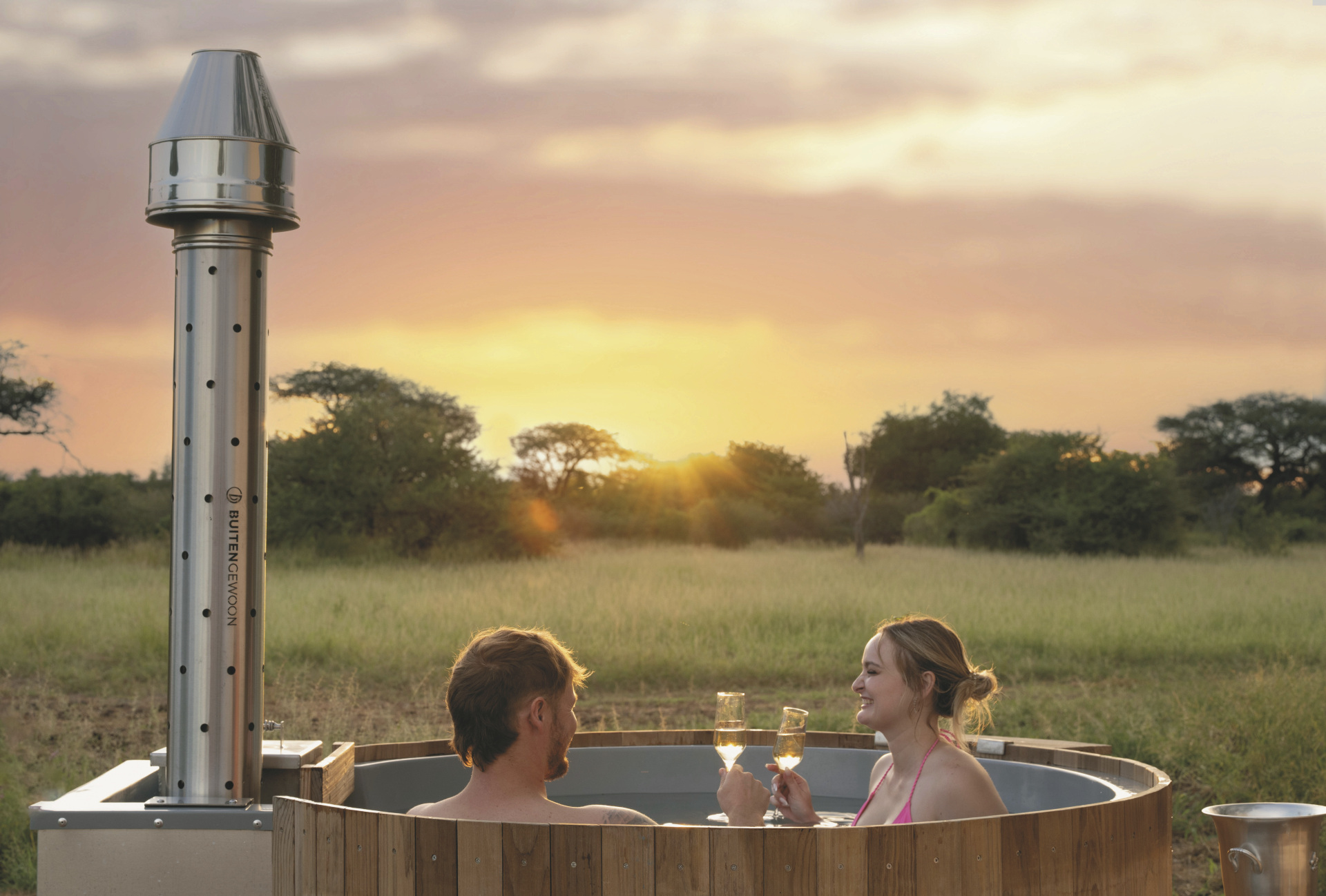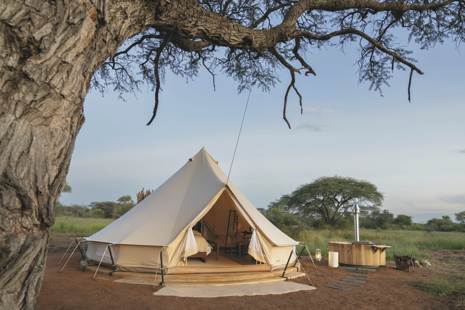 Die 4 großen Safarizelte bieten ein Maximum an Privatsphäre. Jedes verfügt über ein eigenes Freiluftbadezimmer mit Eimerdusche, außerdem über einen beheizbaren Außen-Whirlpool mit herrlichem Blick in die Landschaft sowie einen privaten Sitzbereich vor dem Zelt.