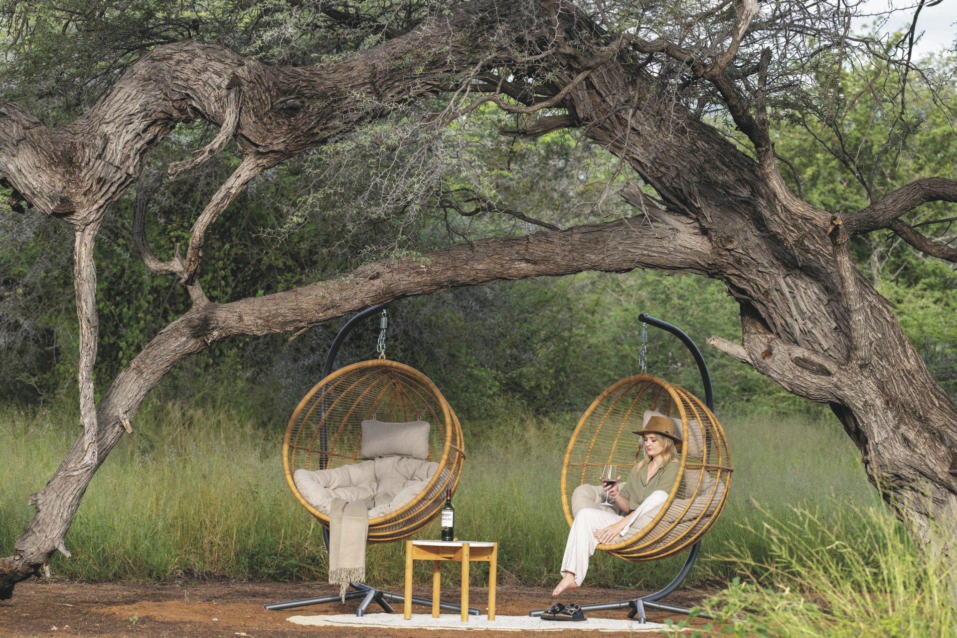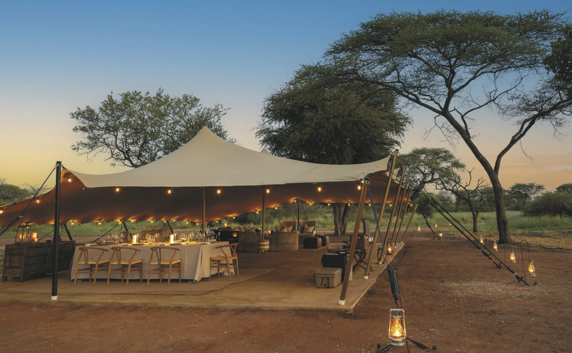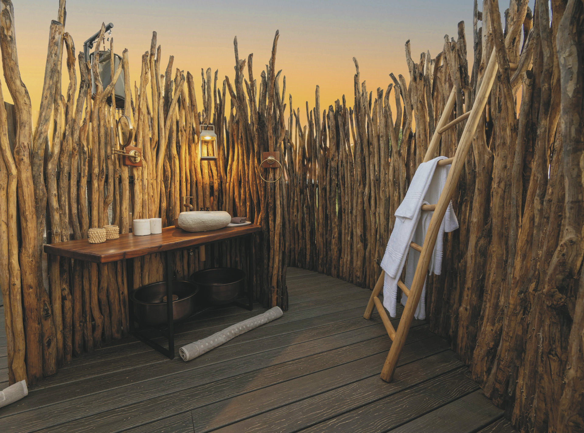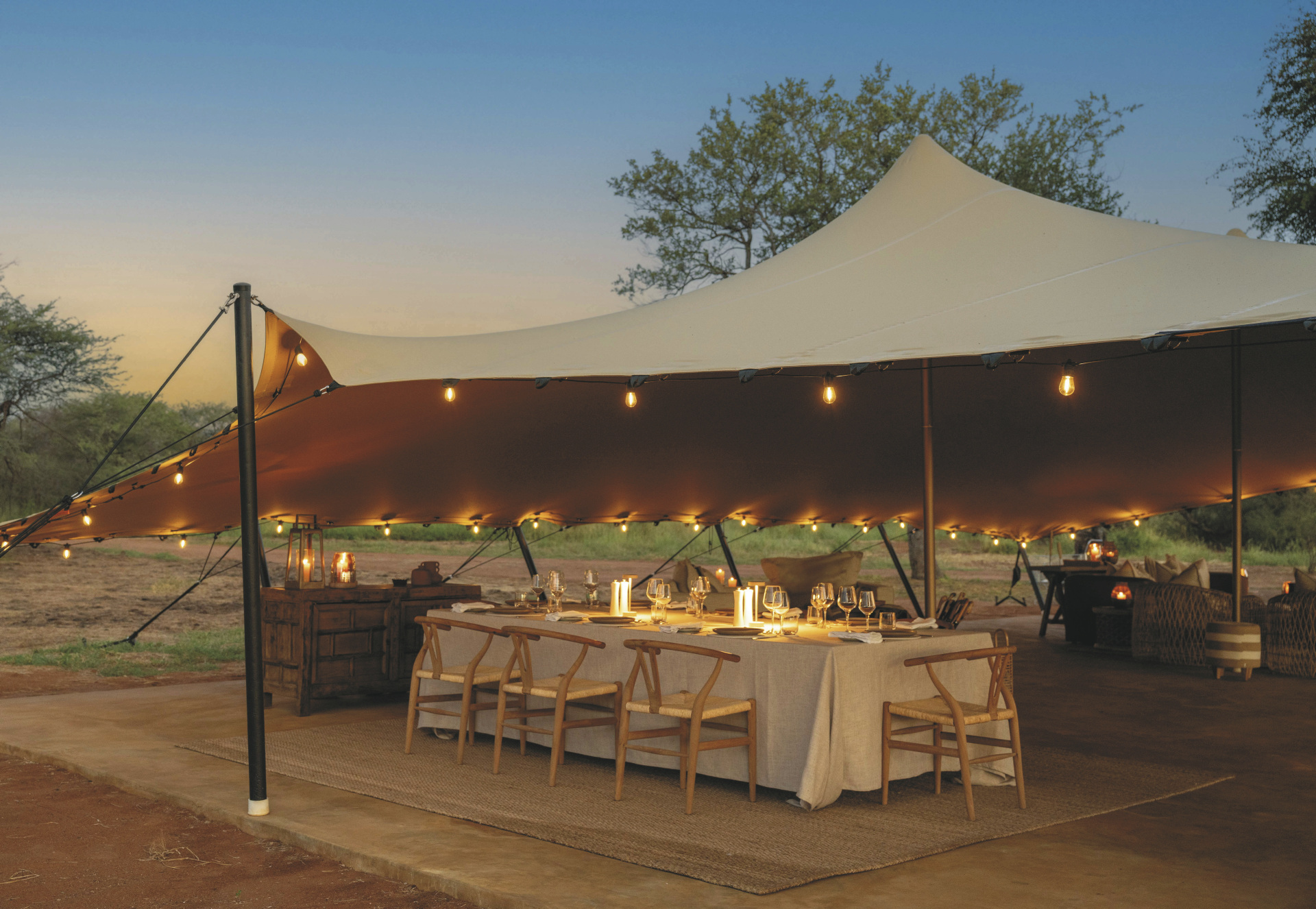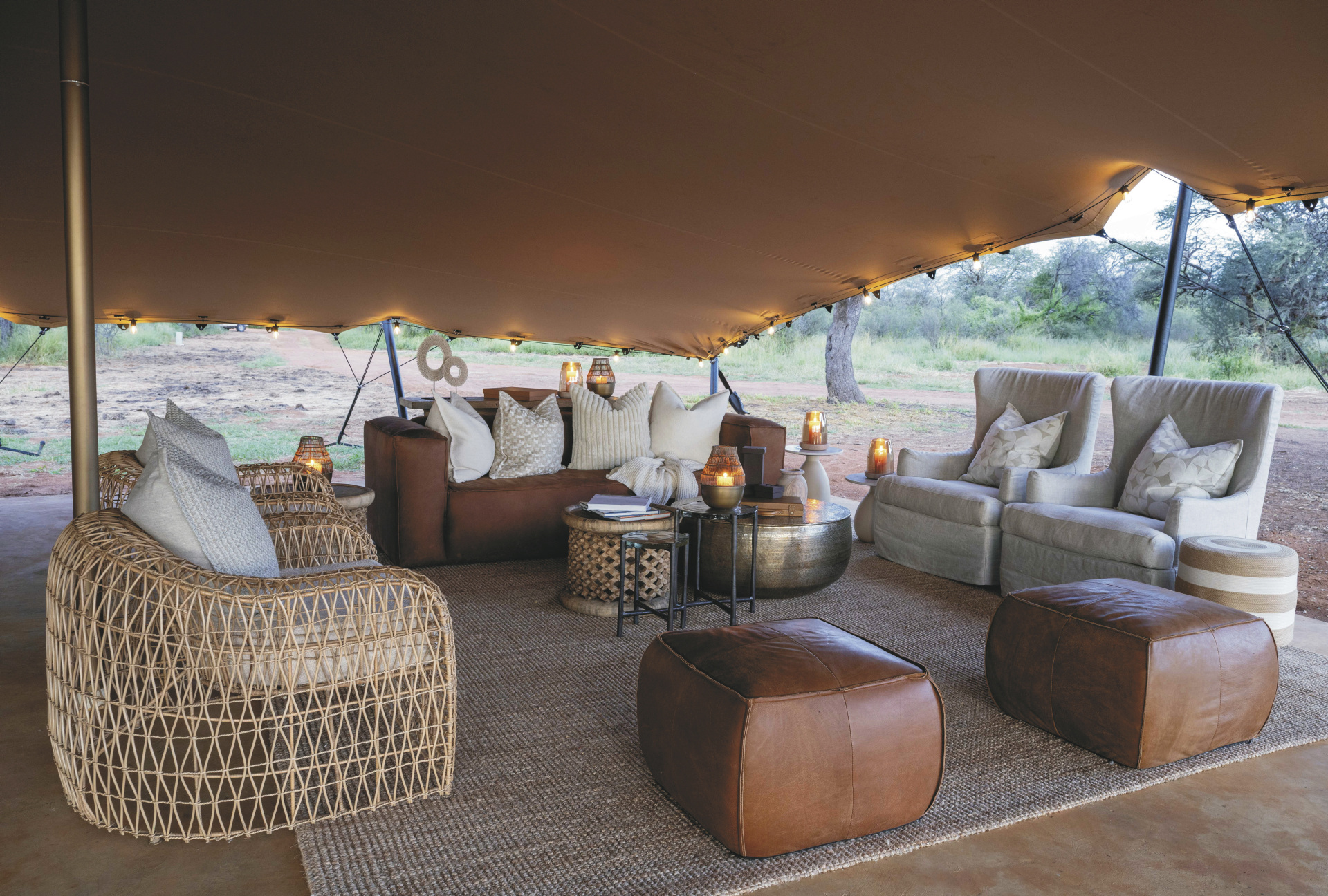 Die 4 großen Safarizelte bieten ein Maximum an Privatsphäre. Jedes verfügt über ein eigenes Freiluftbadezimmer mit Eimerdusche, außerdem über einen beheizbaren Außen-Whirlpool mit herrlichem Blick in die Landschaft sowie einen privaten Sitzbereich vor dem Zelt.