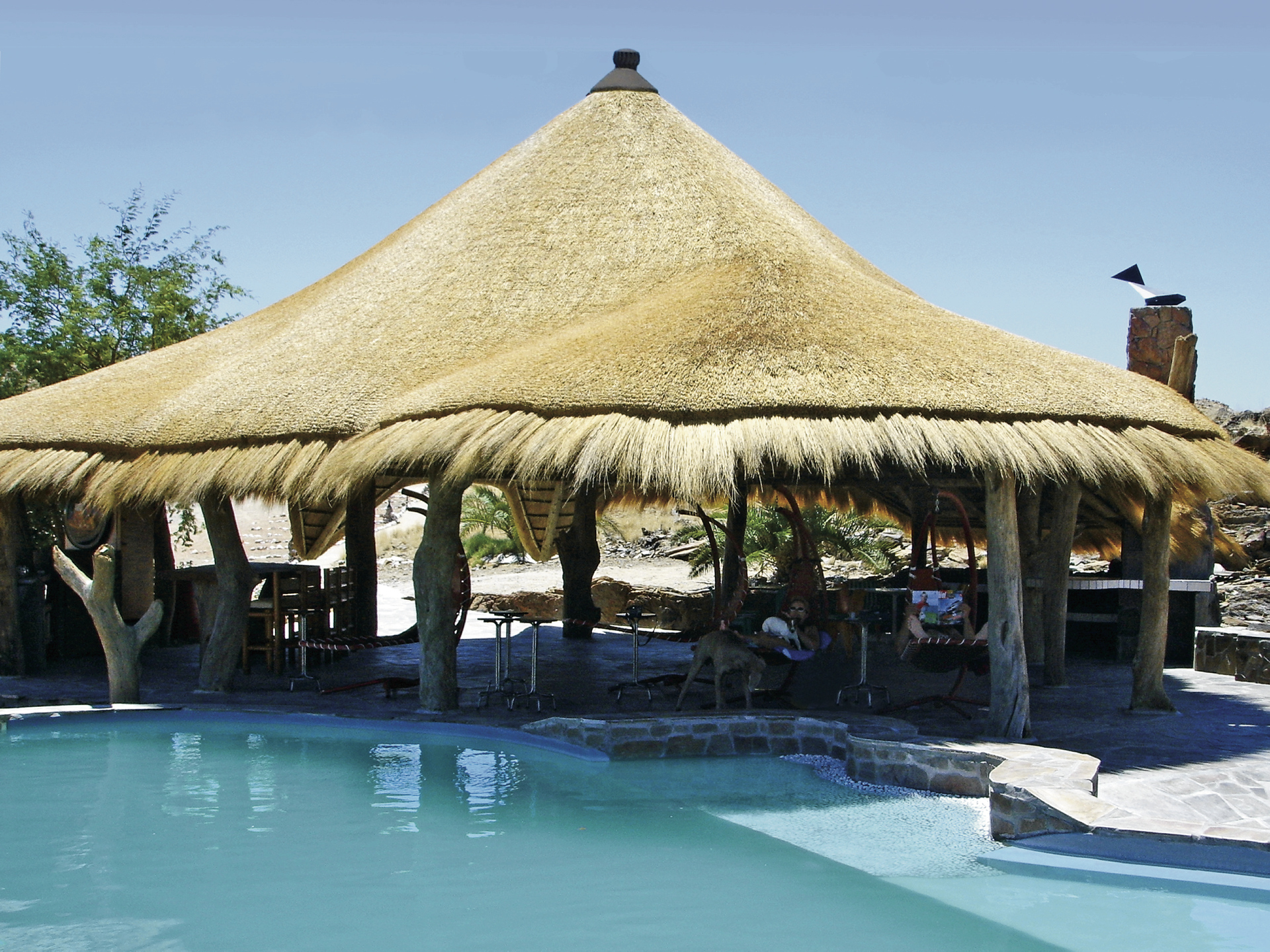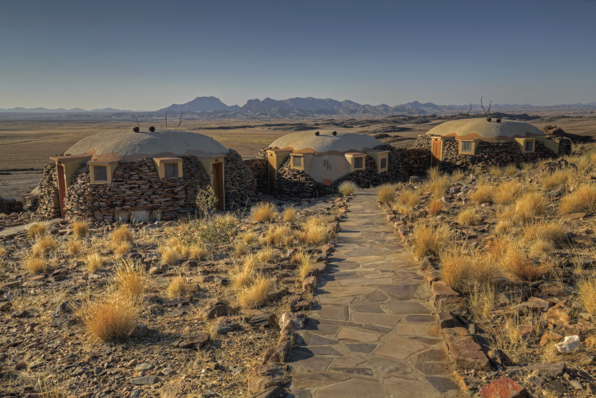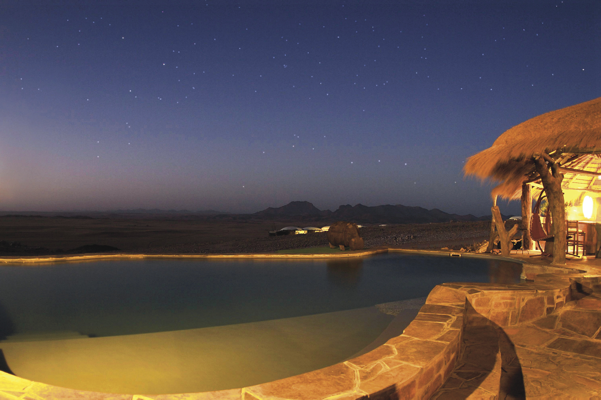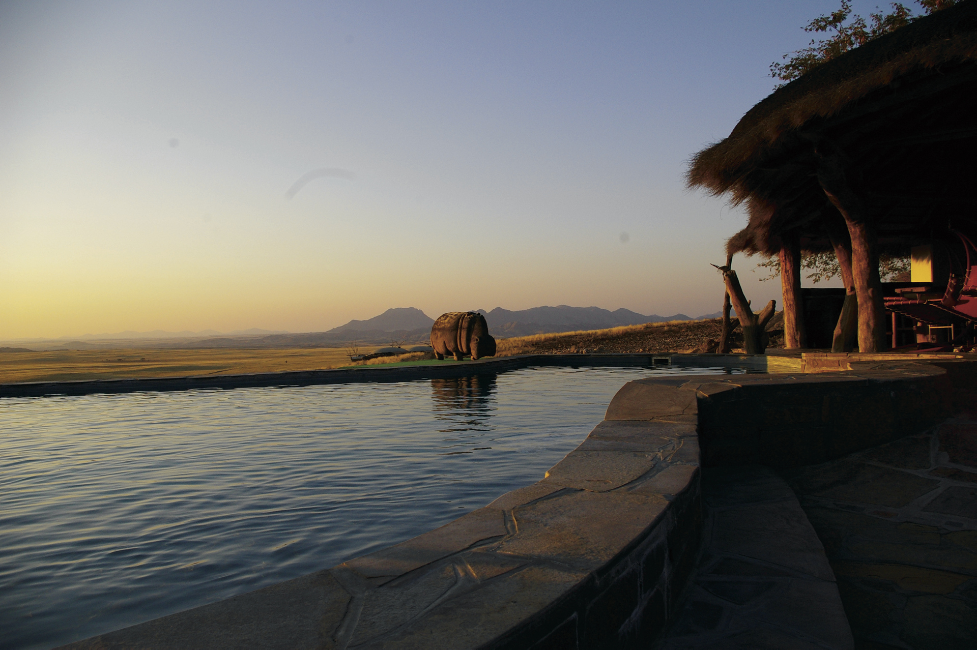 Die Lodge ist harmonisch durch die runde Bauweise in die Landschaft eingebettet und schmiegt sich an einen Hügel, von wo aus man einen ungehinderten Blick über die Ebene der Namib bis an die Bergkette hat. Im Hauptgebäude befinden sich neben dem Restaurant, welches mit einer unglaublichen Speisekarte überrascht, auch die Lounge und die Bar sowie kostenloses WLAN. Am Pool unter der strohgedeckten Lapa finden Sie den besten Platz der Lodge! Entspannen Sie in einem der gemütlichen Hängeschwingern und ergötzen Sie sich an der Weite der Landschaft und dieser unfassbaren Ruhe. Am nahegelegenen Wasserloch finden sich immer wieder Zebras, Springböcke, aber auch Oryx Antilopen und verschiedene Vögel ein um ihren Durst zu stillen. Optionale Aktivitäten: 10 verschiedene markierte Wanderwege, Fahrt zu den Felszeichnungen, Panoramafahrt zum Sonnenuntergang, Meerkat Rescue Project.