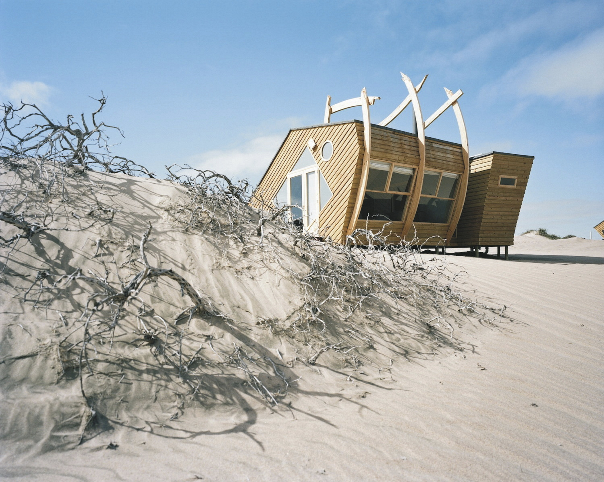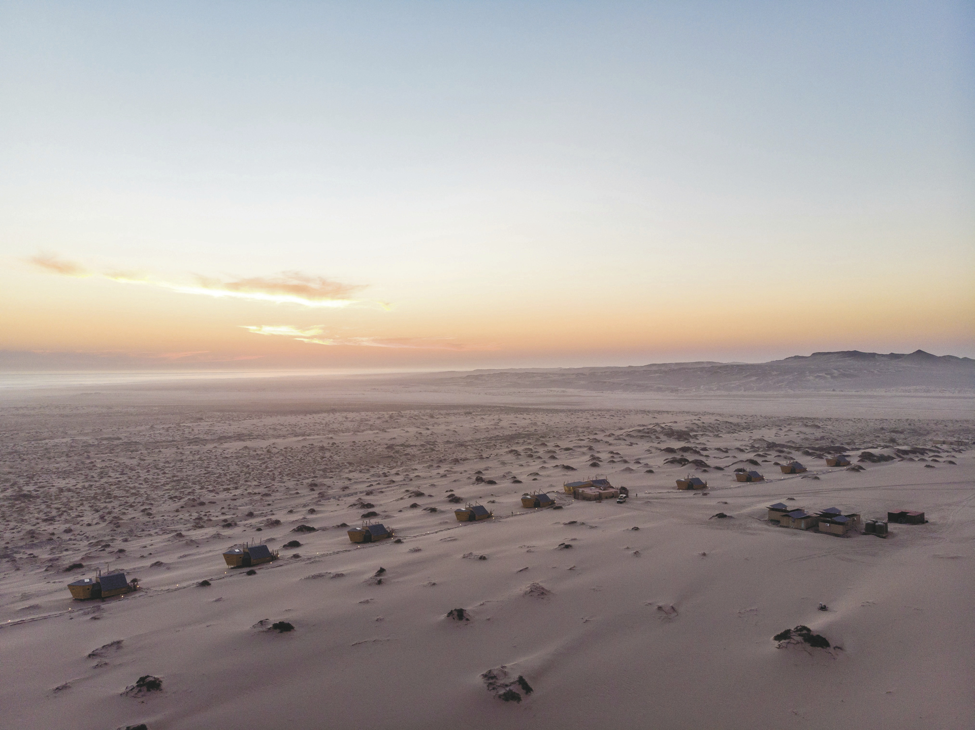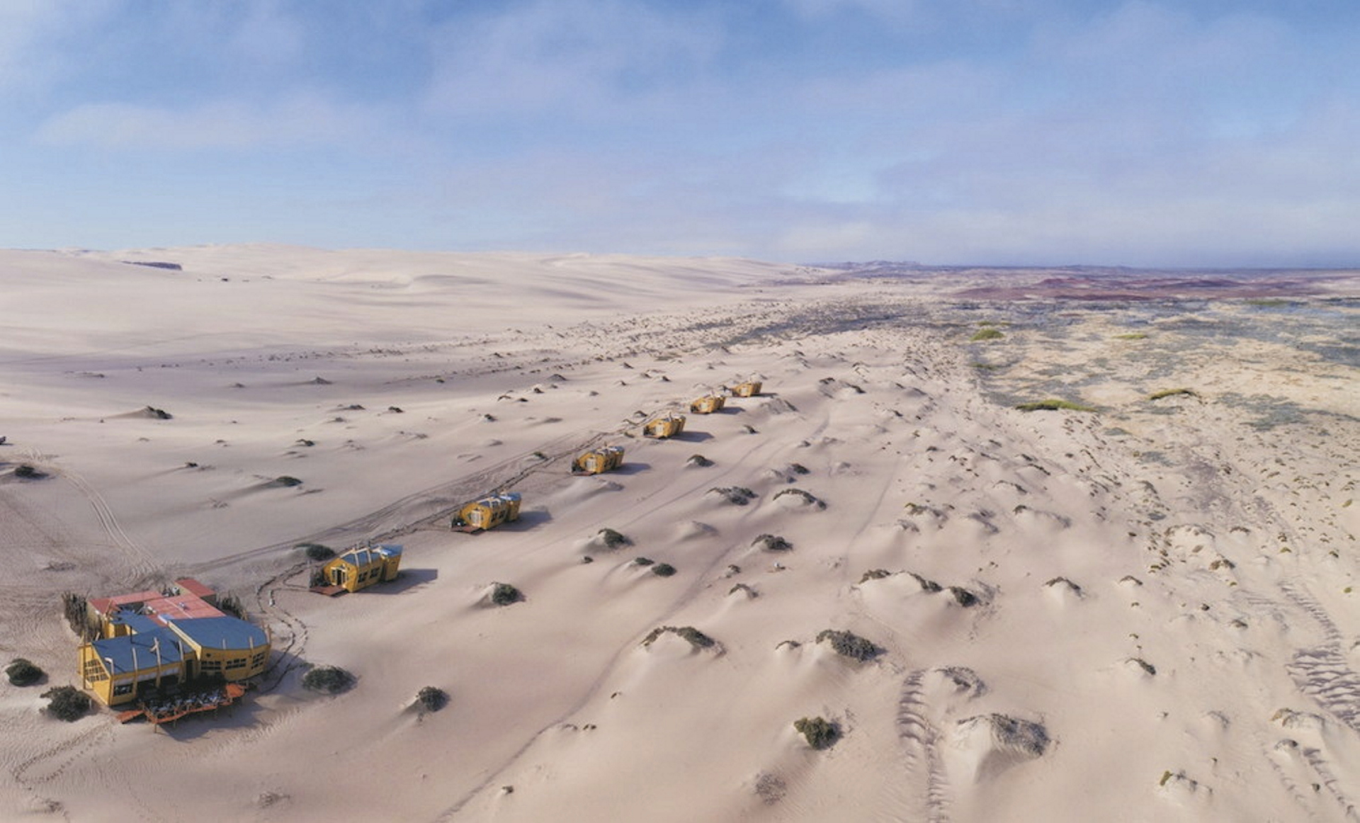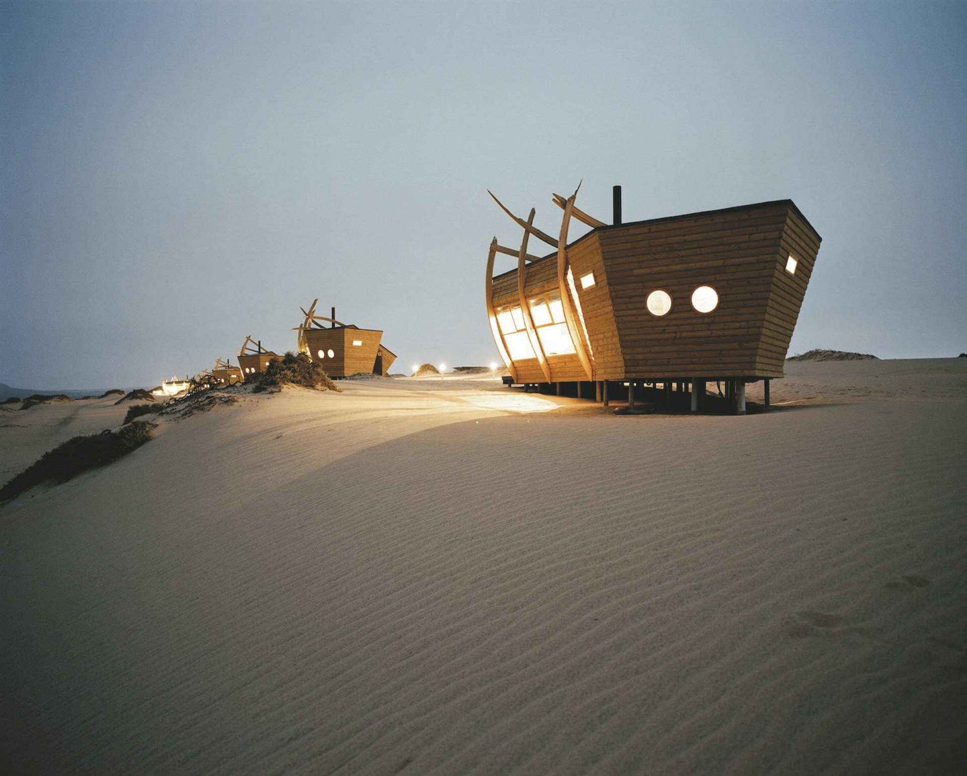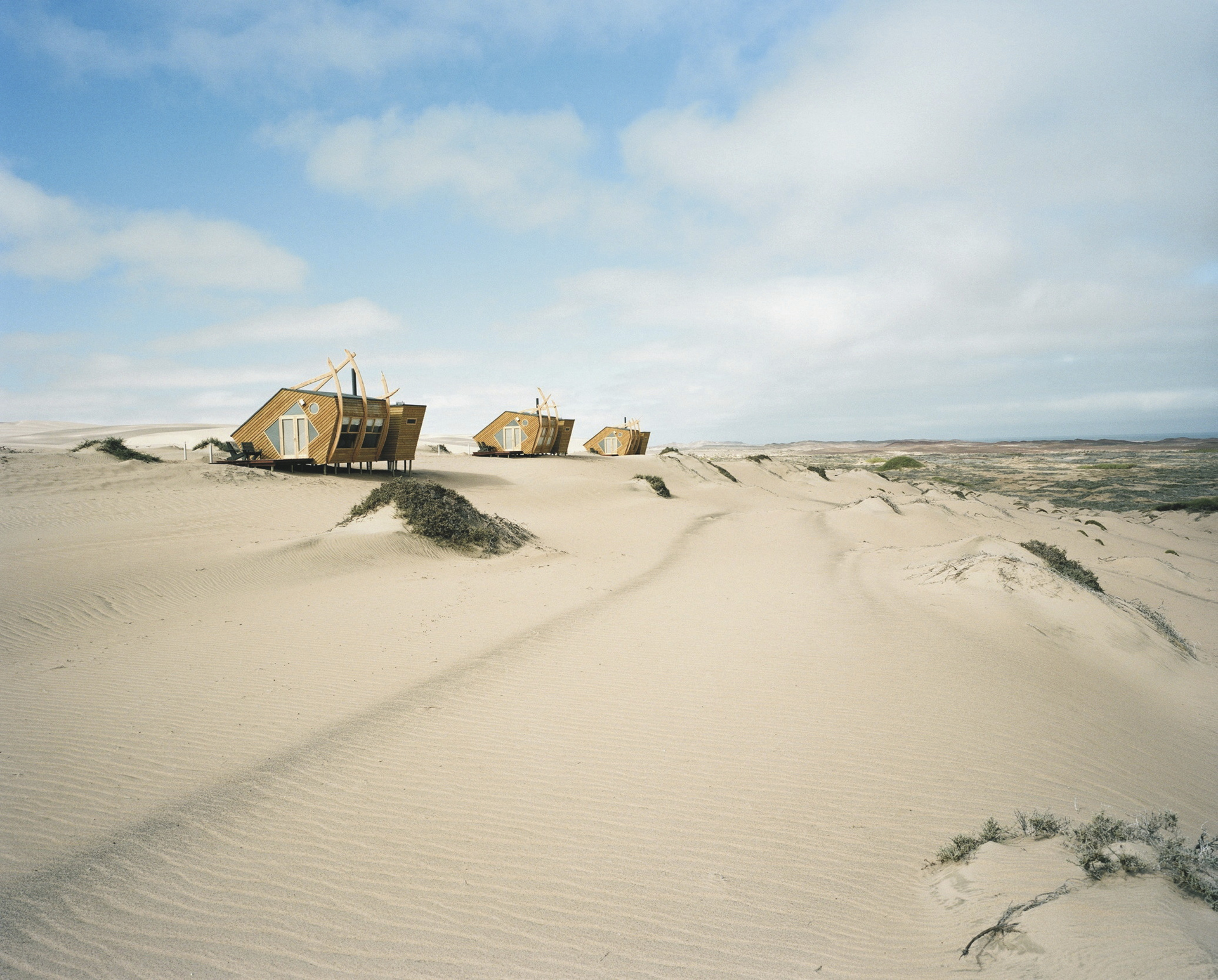 Neben dem Hauptgebäude reihen sich 10 freistehende Chalets, die ebenfalls einem Schiffswrack nachempfunden sind, auf dem Dünengürtel auf. Holz und warme Farben dominieren die Einrichtung, Eleganz und Komfort inmitten der rauen Umgebung stehen klar im Vordergrund. Von der Terrasse oder dem Bett hat man eine fantastische Aussicht auf die Wüste und das Meer. Jedes Chalet verfügt über ein geräumiges Bad sowie über einen Safe und einen Kamin, der an nebeligen Abenden für behagliche Gemütlichkeit sorgt. Heißes Wasser für den Tee-/Kaffeezubereiter können Sie jederzeit vom Personal bekommen. Für Familien gibt es 2 geräumige Chalets für 4 Personen. Holzstege und Sandwege verbinden die Chalets mit dem Hauptgebäude.